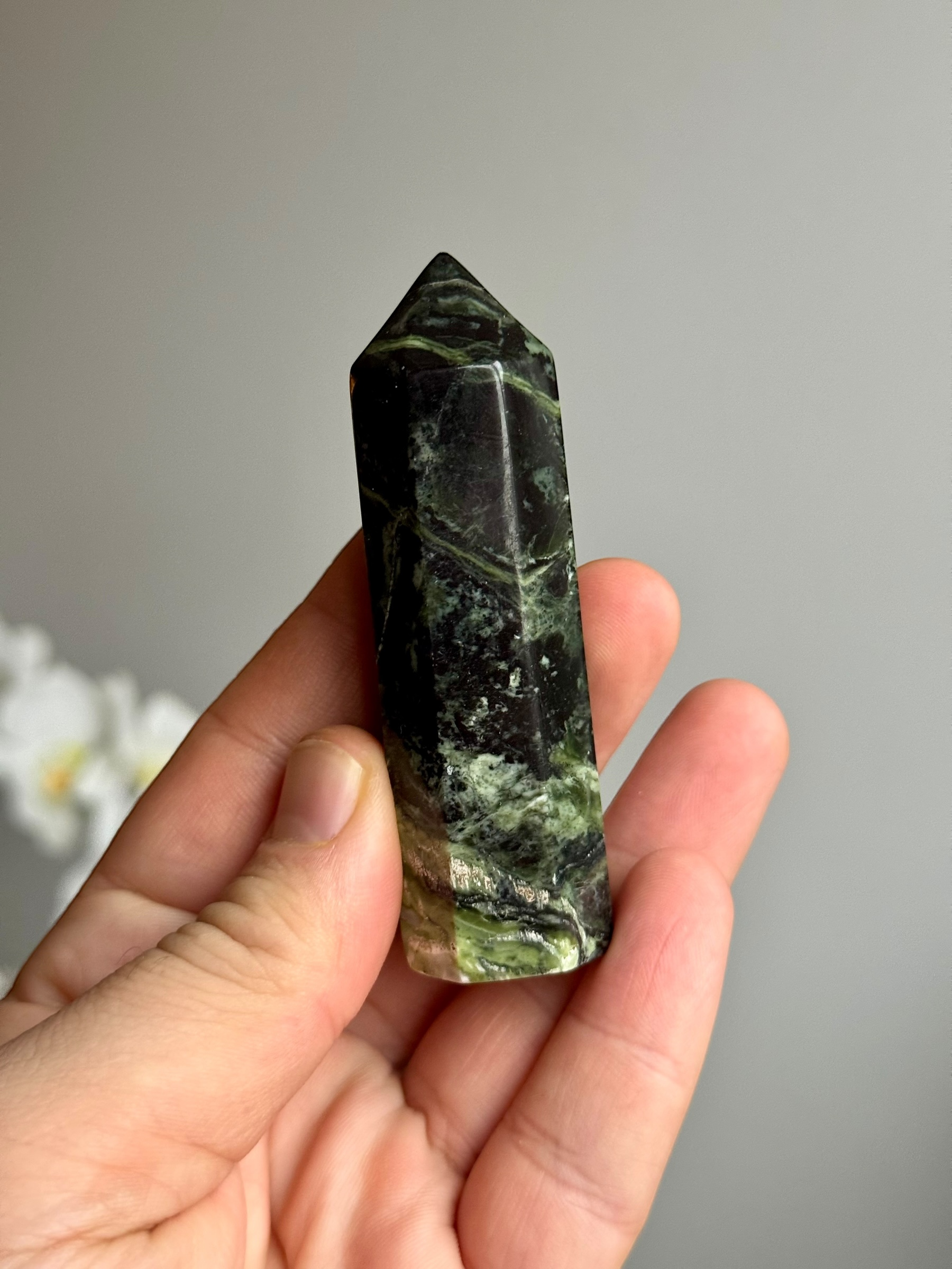 Deze prachtige jungle serpentijn toren, afkomstig uit Pakistan, is een waar natuurwonder. De toren wordt gekenmerkt door zijn donkere en lichtgroene vlakken, wat hem een levendige en indrukwekkende uitstraling geeft. De unieke kleurencombinatie doet denken aan een weelderige, groene jungle (Vandaar ook de naam).