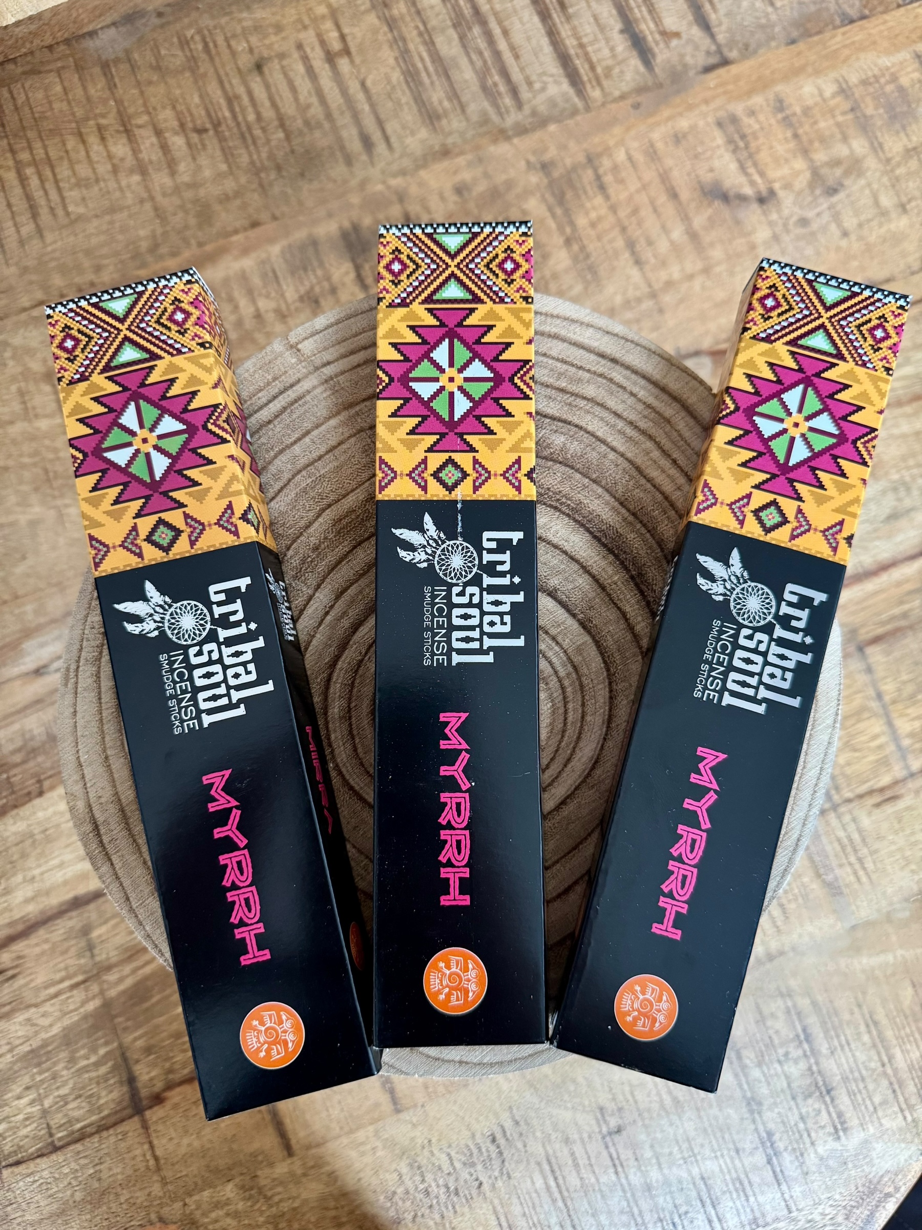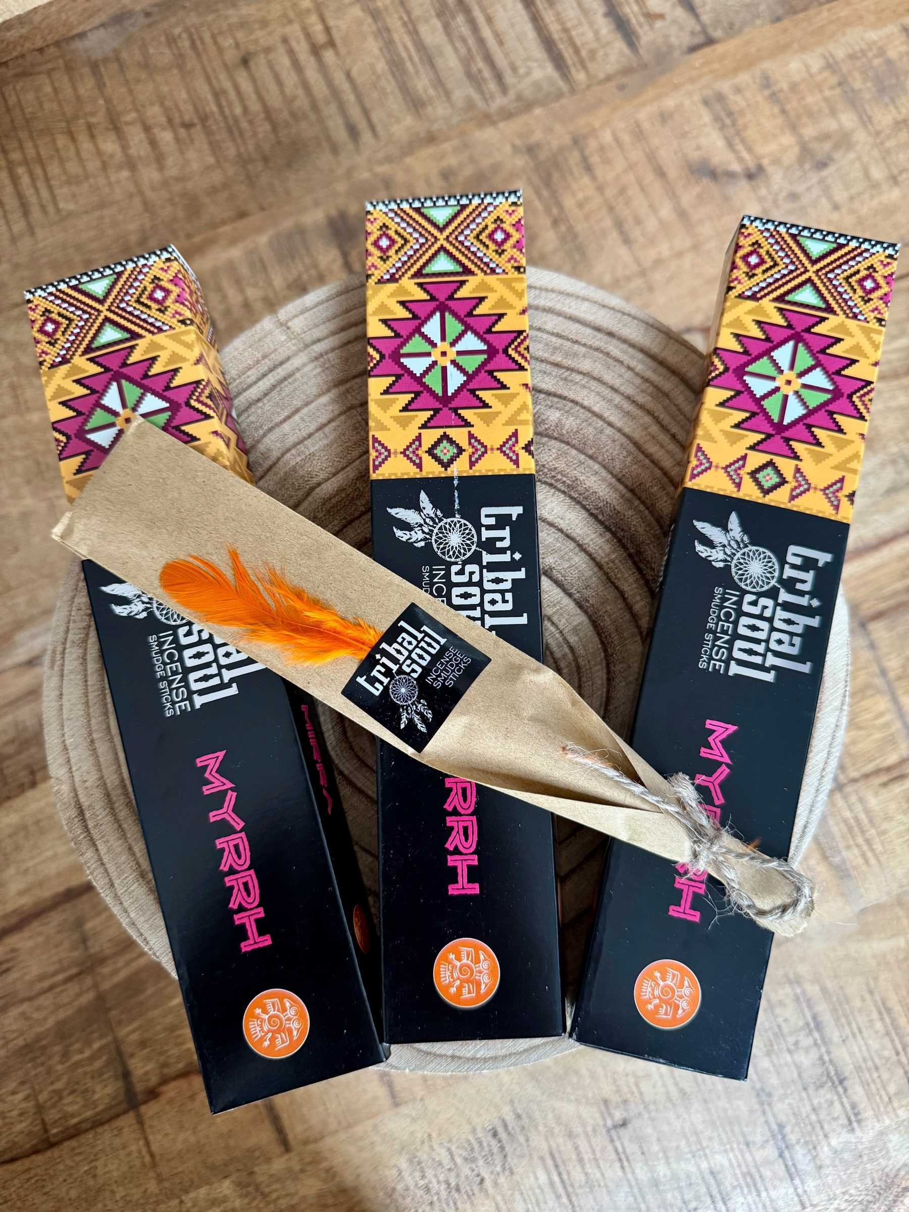 rvaar de tijdloze geur van Tribal Soul Wierook in de variant “Myrrh”. Deze zorgvuldig samengestelde wierookstokjes brengen een aura van mystiek en spiritualiteit in elke ruimte. De geur van myrrh, die al eeuwenlang wordt gewaardeerd, biedt een diepe, aardse aroma die perfect is voor meditatie, yoga, of gewoon om een serene ambiance in huis te creëren.