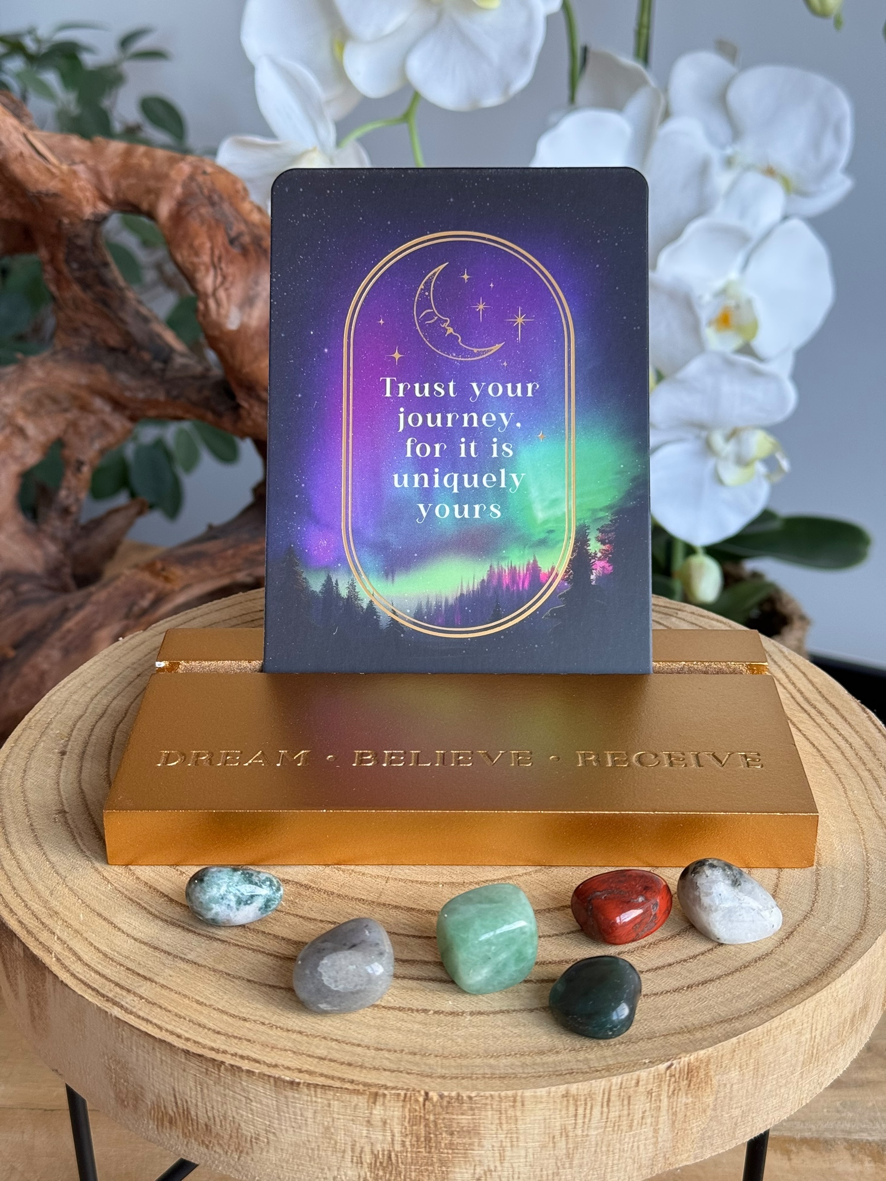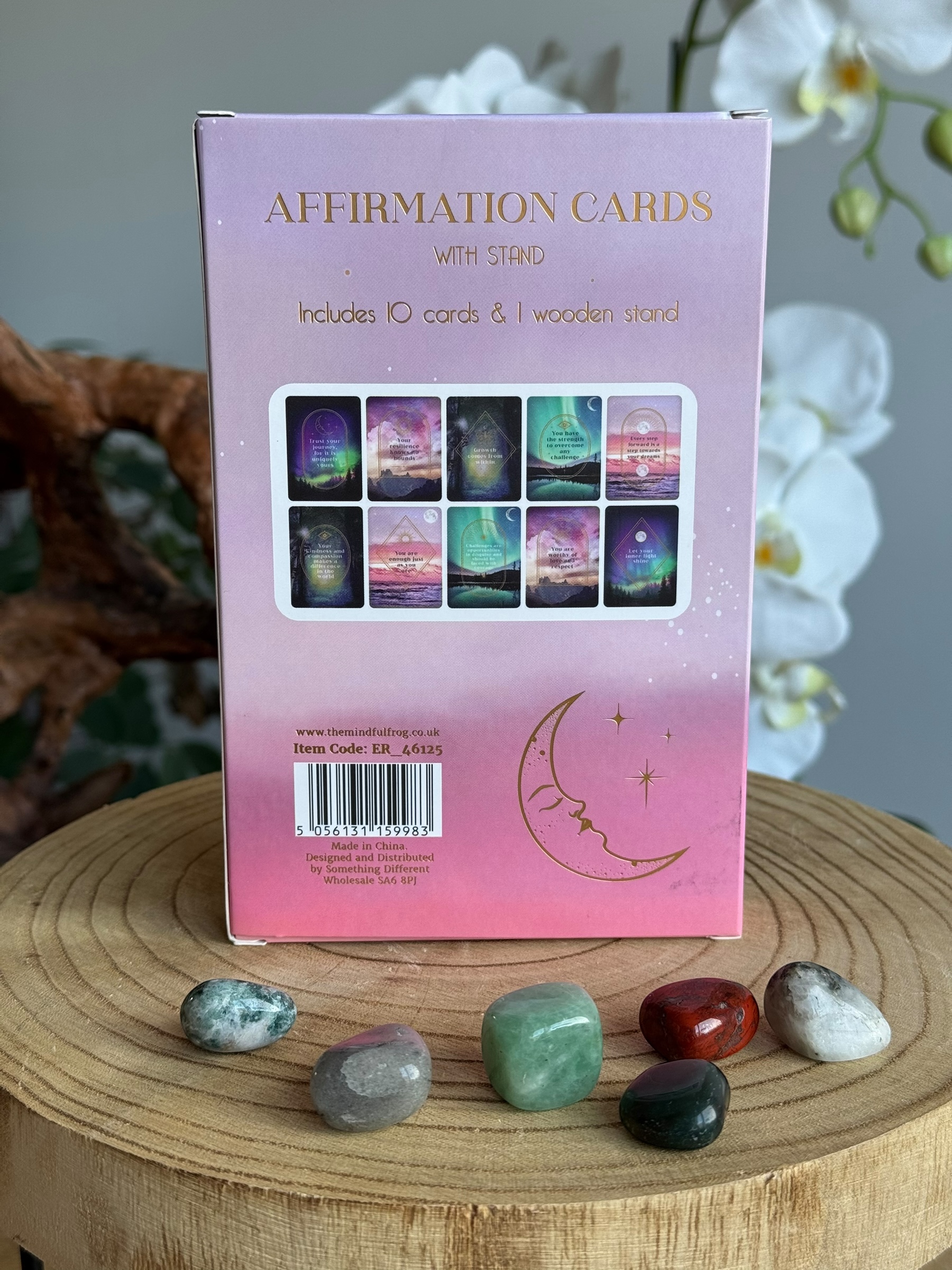 Breng positieve energie en inspiratie in je dagelijks leven met onze affirmatiekaarten met standaard. Deze set bevat 10 prachtig ontworpen kaarten, elk met een krachtige affirmatie om je te motiveren en je geest te verheffen. De bijgeleverde standaard zorgt ervoor dat je elke dag een kaart kunt uitstallen en kunt genieten van de positieve boodschap.