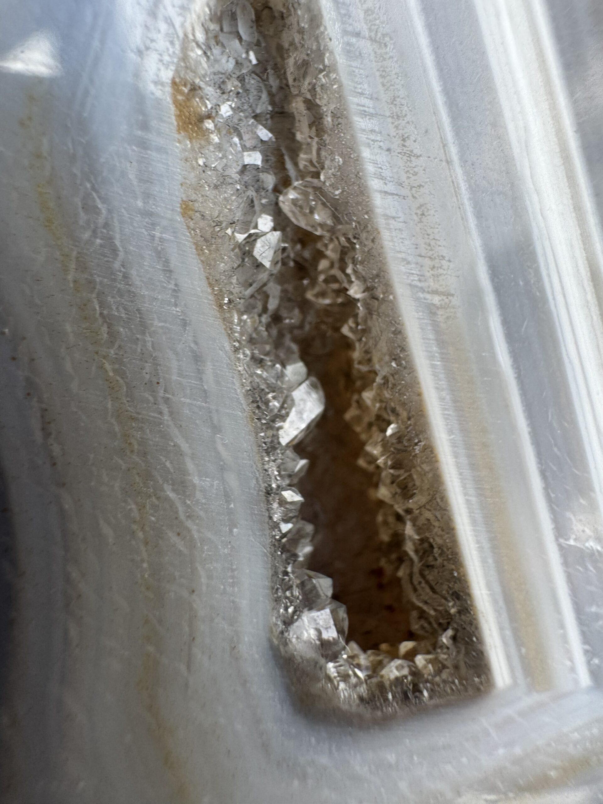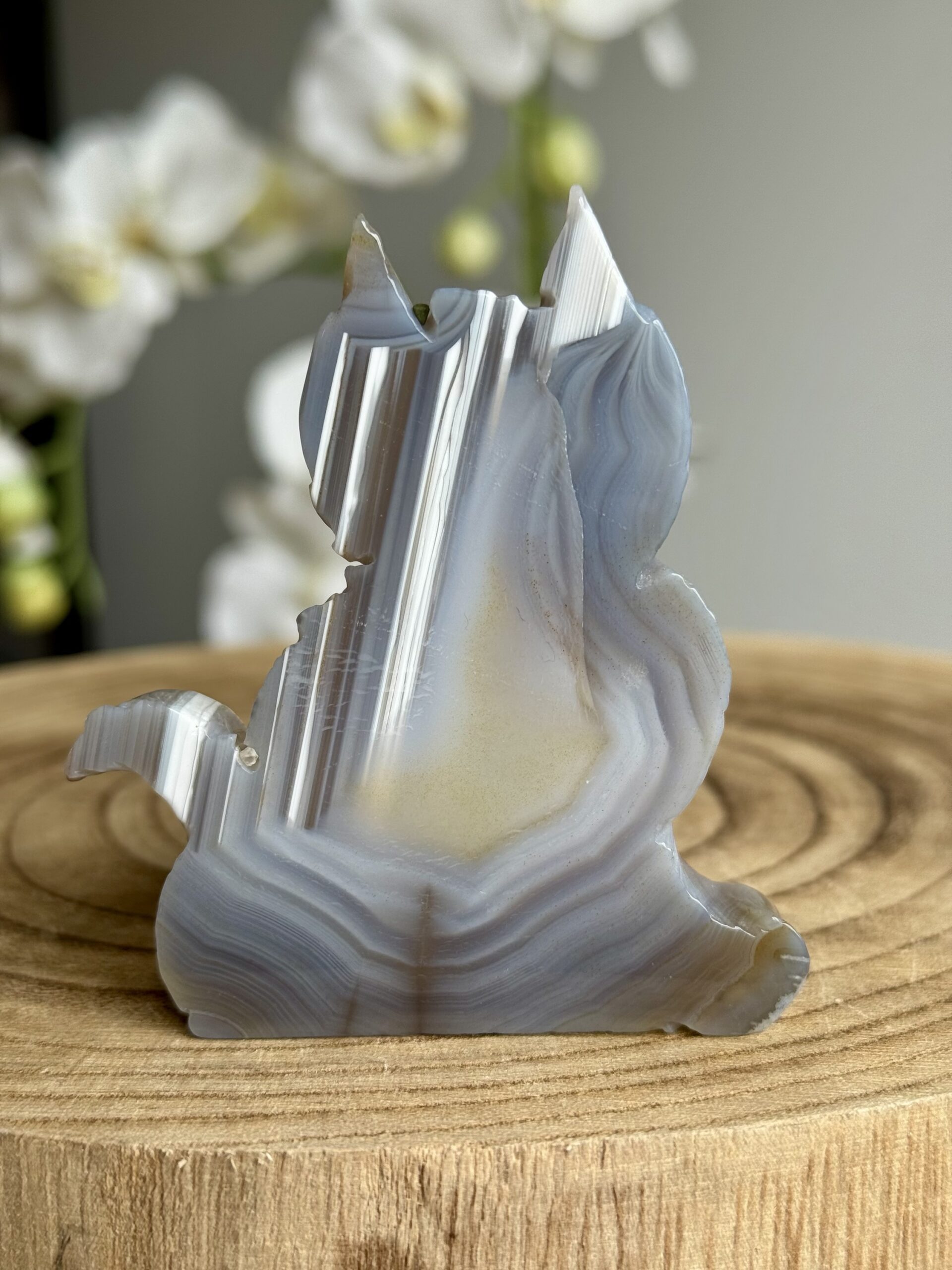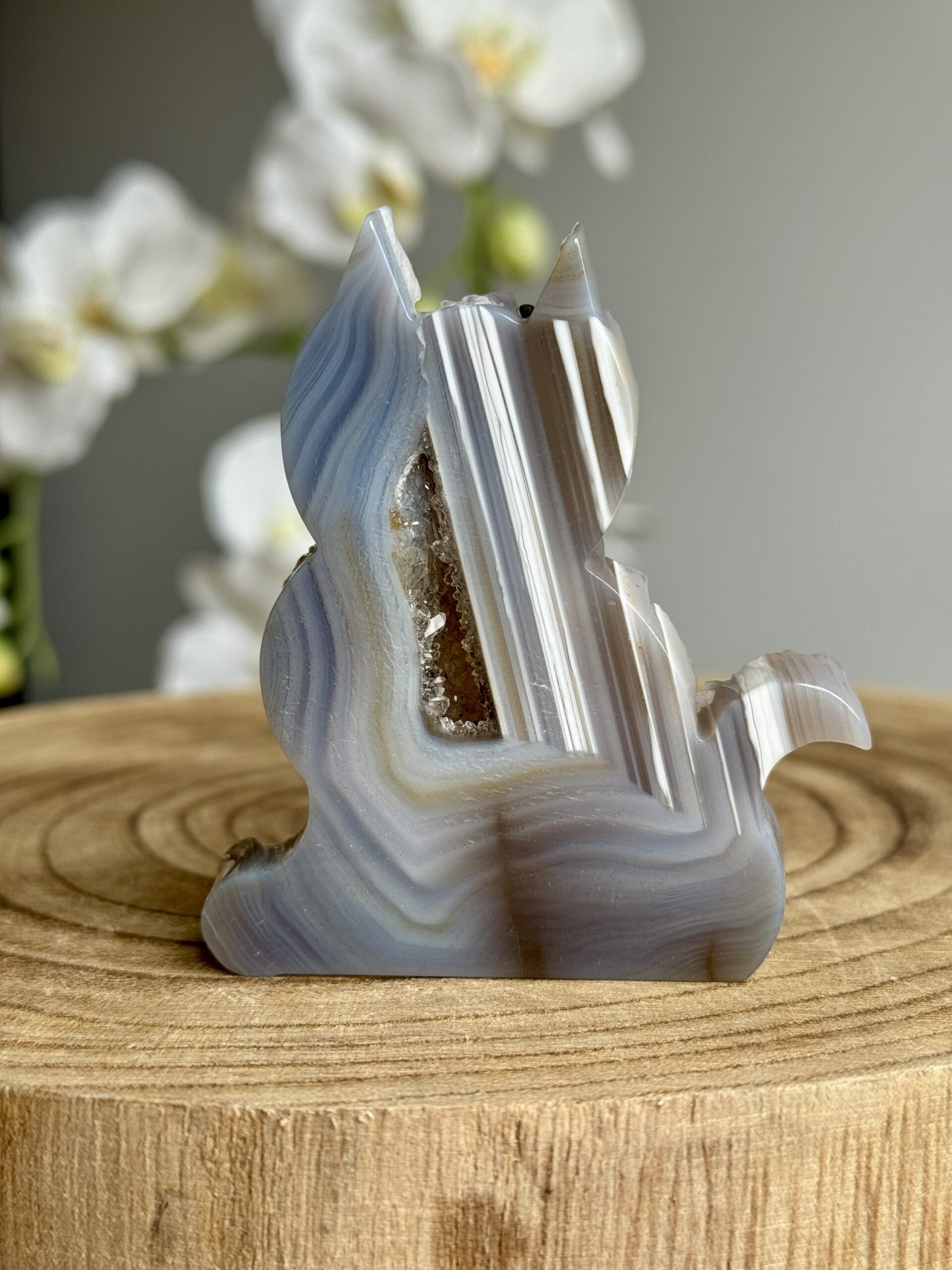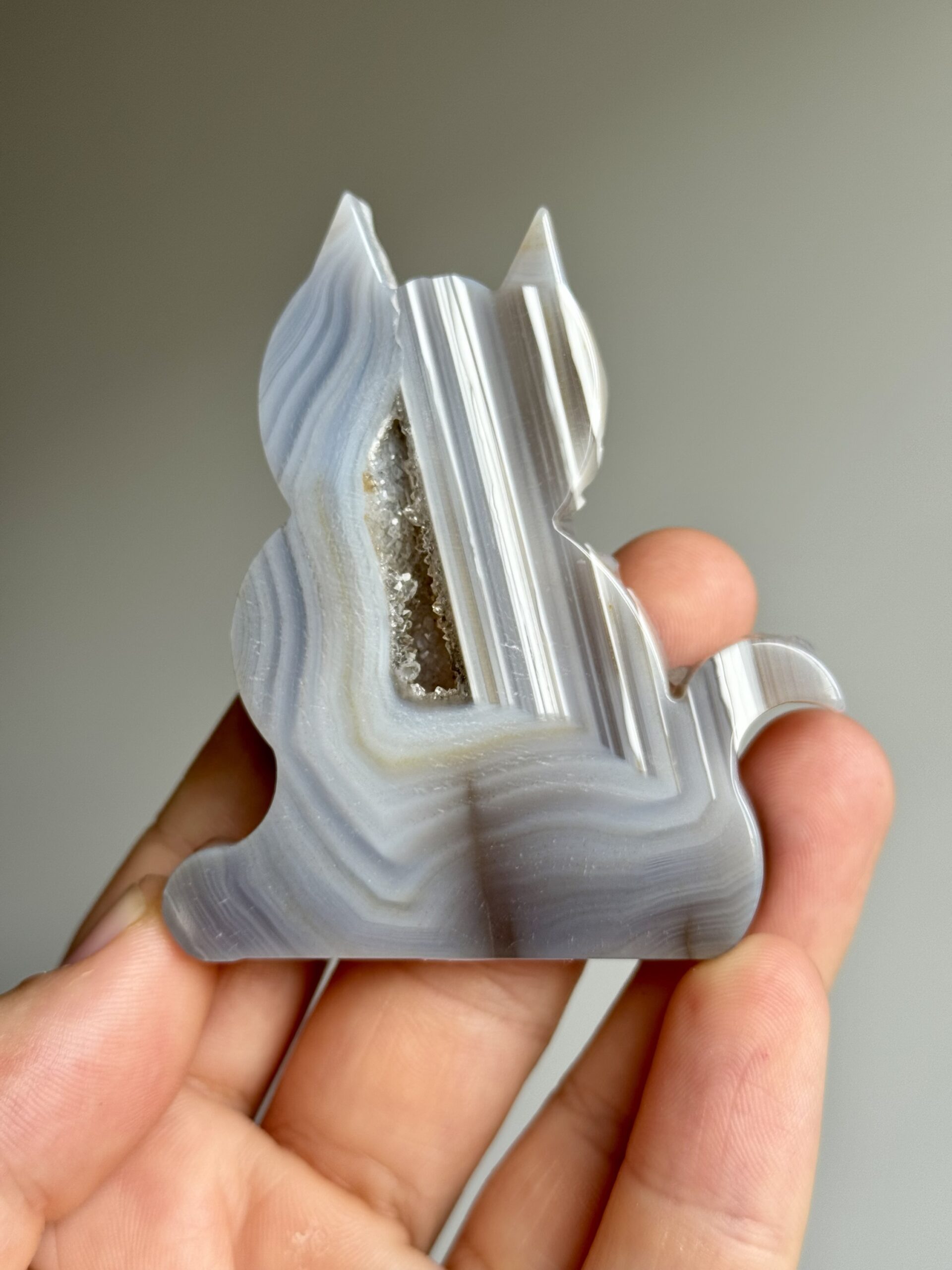 Ontdek deze prachtige carving van een katje van agaat in zachte lichtblauw-grijze tinten. In het midden schittert een natuurlijke kwarts groei, wat dit beeldje extra bijzonder maakt. Een echte eyecatcher voor elke verzamelaar of liefhebber van edelstenen en katten.