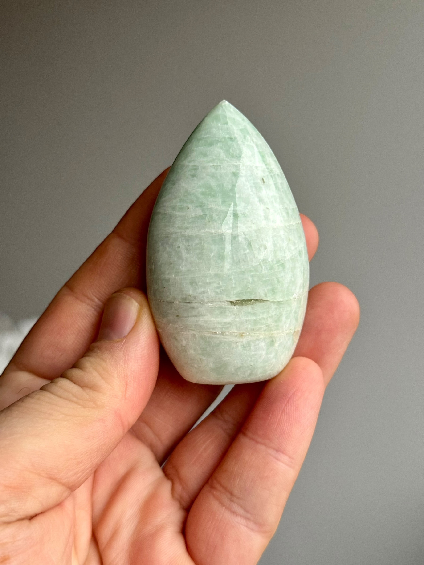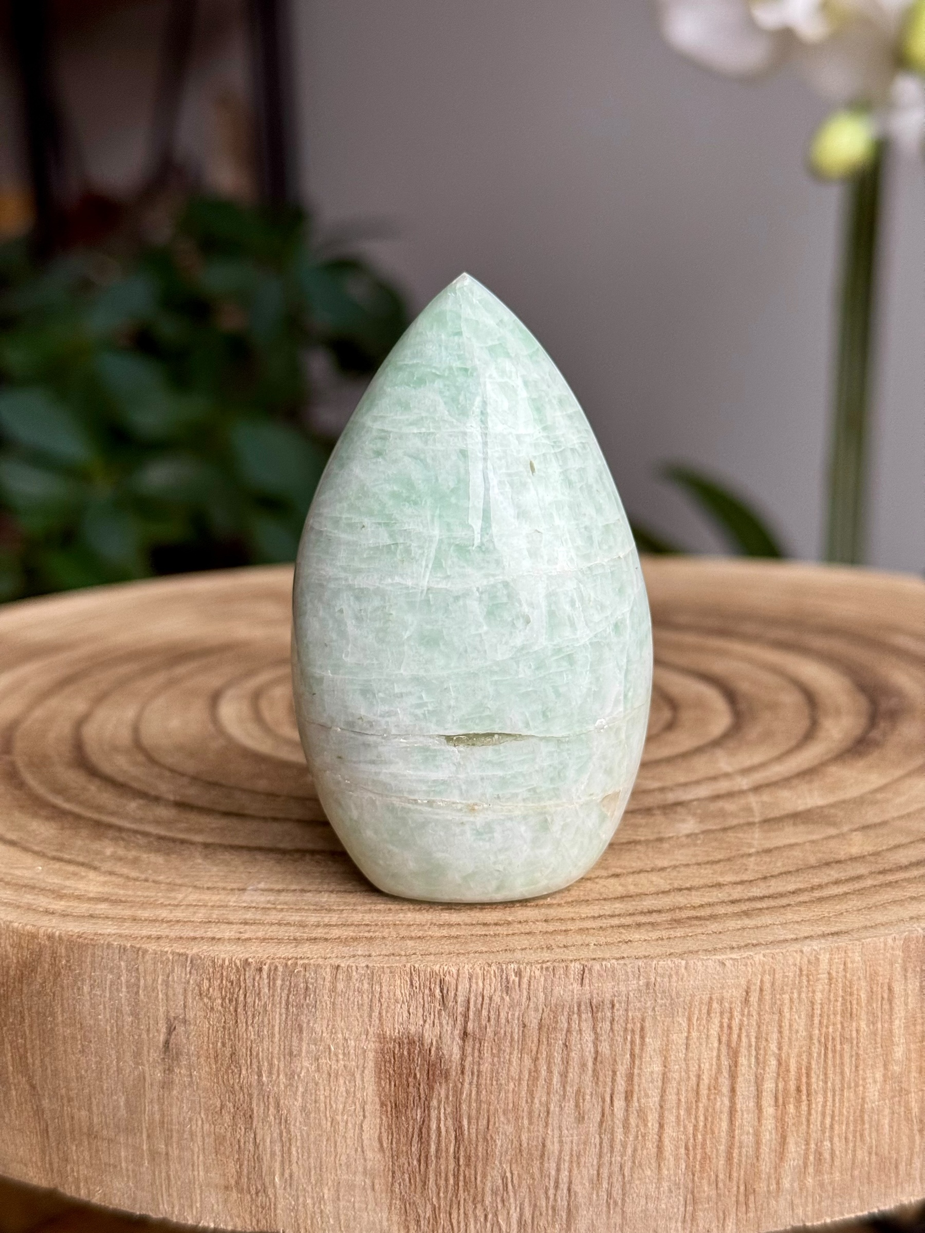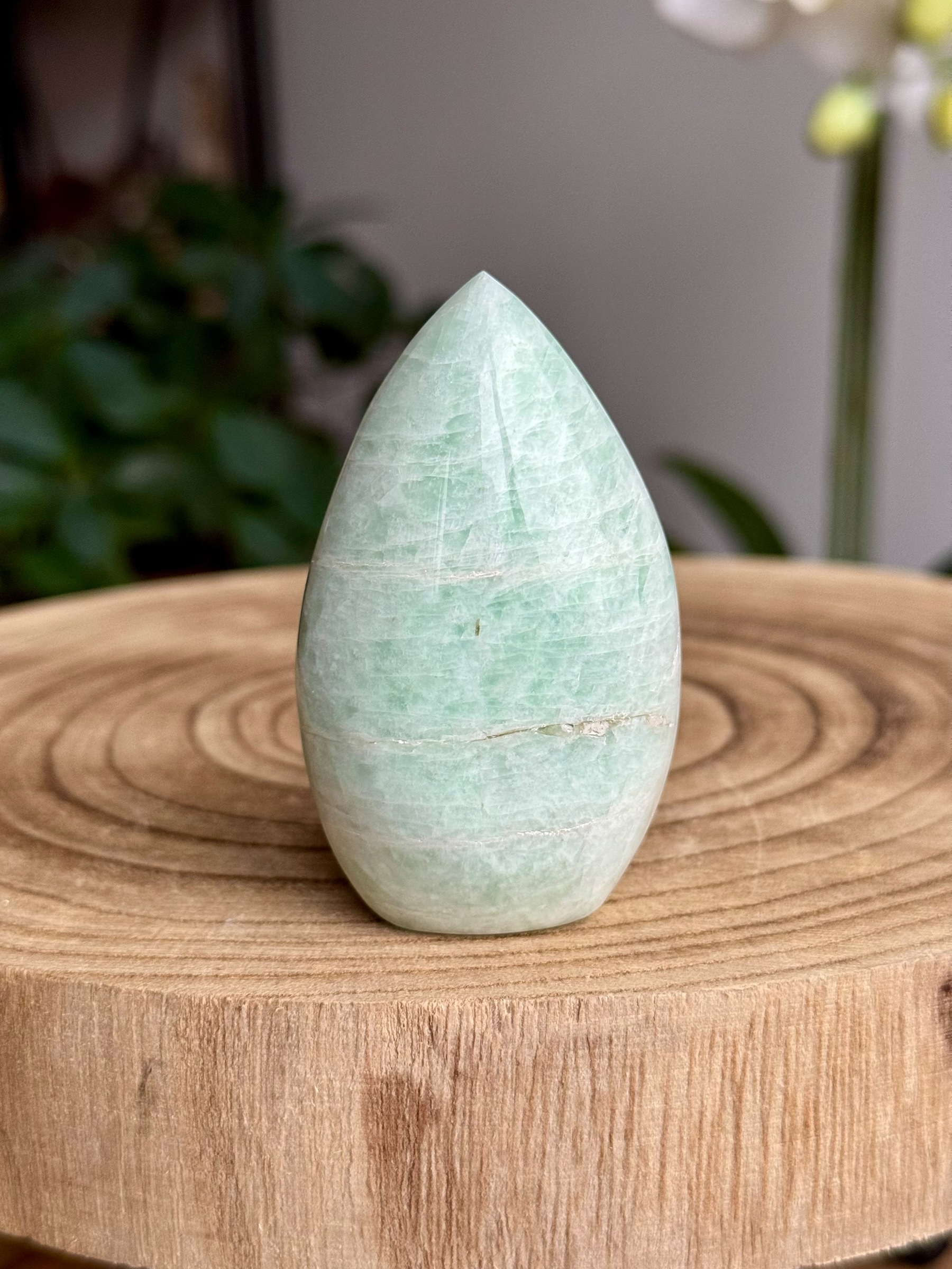 Deze schitterende amazoniet, afkomstig uit India, valt op door zijn zeldzame mintgroene kleur. Amazoniet, ook wel bekend als “Amazonstone”, is een variëteit van microklien en voegt een vleugje natuurlijke elegantie toe aan elke ruimte.