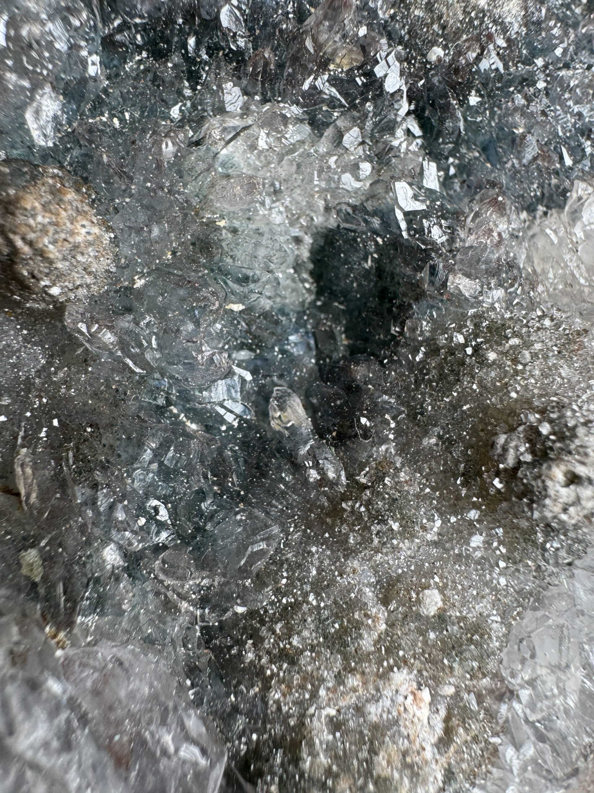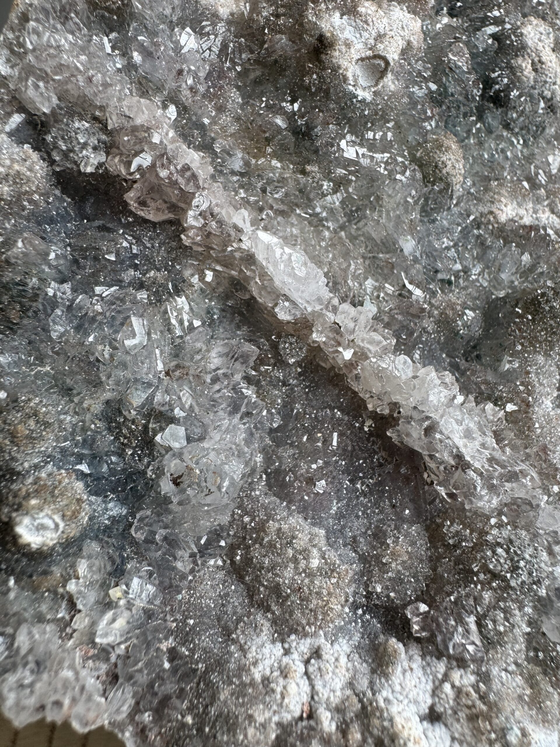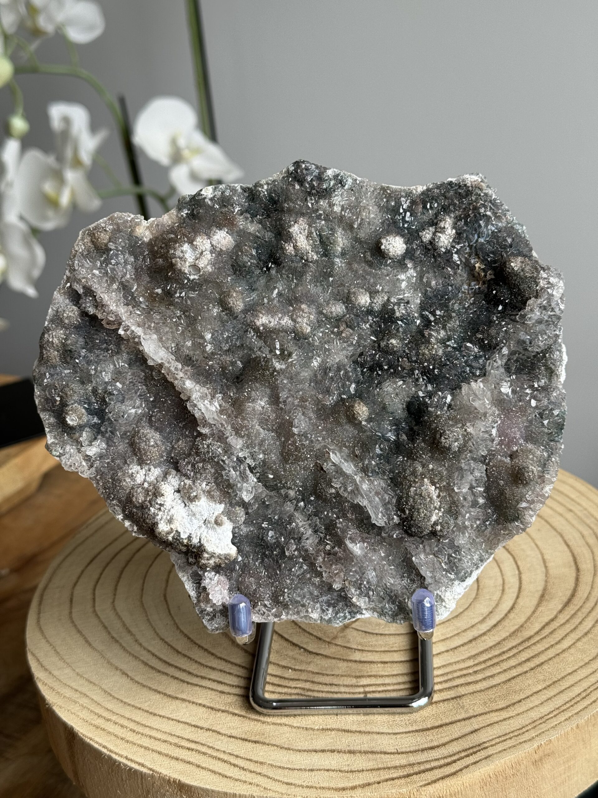 Deze amethist cluster wordt ook wel “Galaxy Amethist” genoemd en laat een bijzondere combinatie zien van amethist en kwartsgroei. Het kristal heeft zich mogelijk gevormd over een ondergrond van chalcedoon en chloriet, wat zorgt voor een speels patroon en een mooie glans.