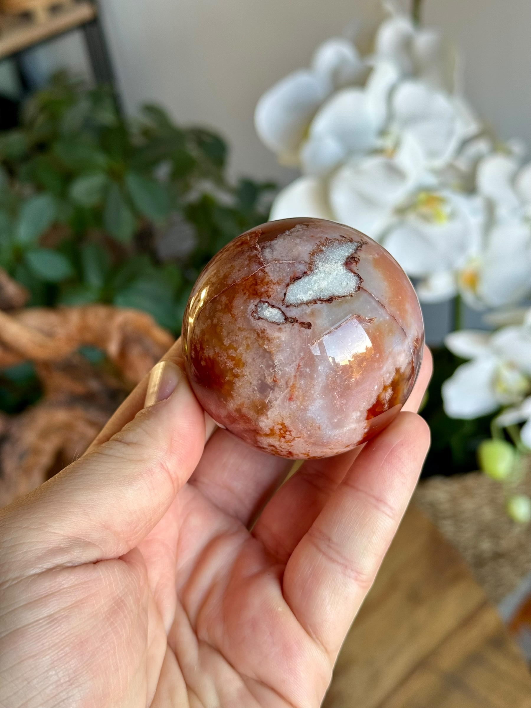 Deze bloemagaat straalt bijzonder dankzij zijn unieke rode kleur. Waar bloemagaat vaak voorkomt in zachte beige tinten of soms met groene accenten, maakt deze opvallende rode variant het echt een speciaal en onderscheidend stuk. Een prachtige steen die een warm, natuurlijk accent toevoegt aan elke ruimte!