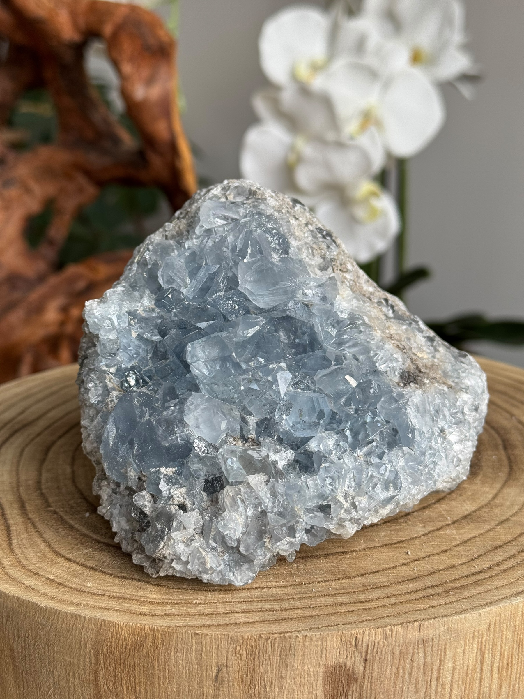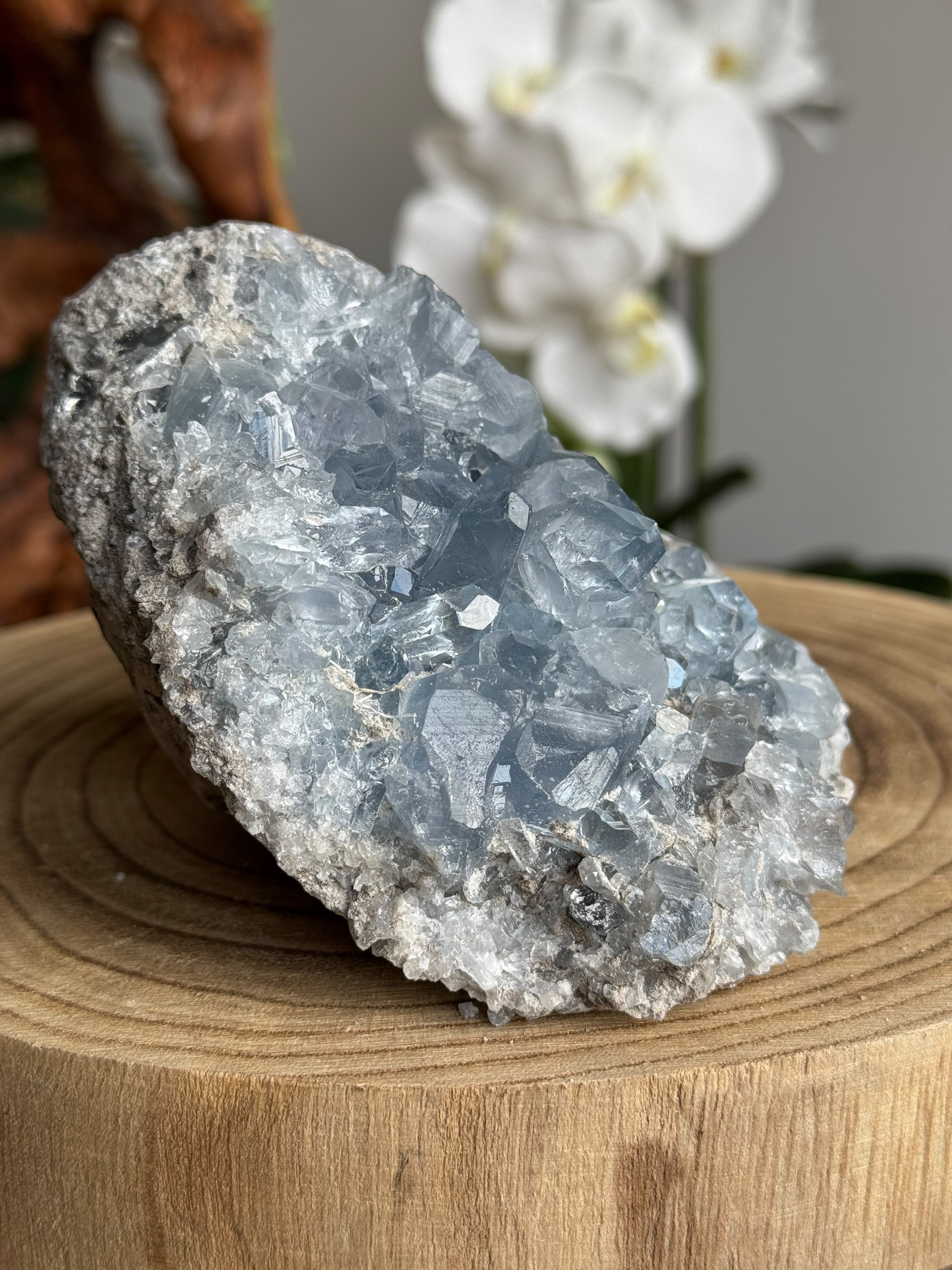 Celestien, ook bekend als celestiet. Het komt vaak voor in kristalvorm en wordt gewaardeerd om zijn hemelsblauwe tinten. Celestien wordt vaak gevonden in geoden en kan delicate en fragiele kristalstructuren hebben.