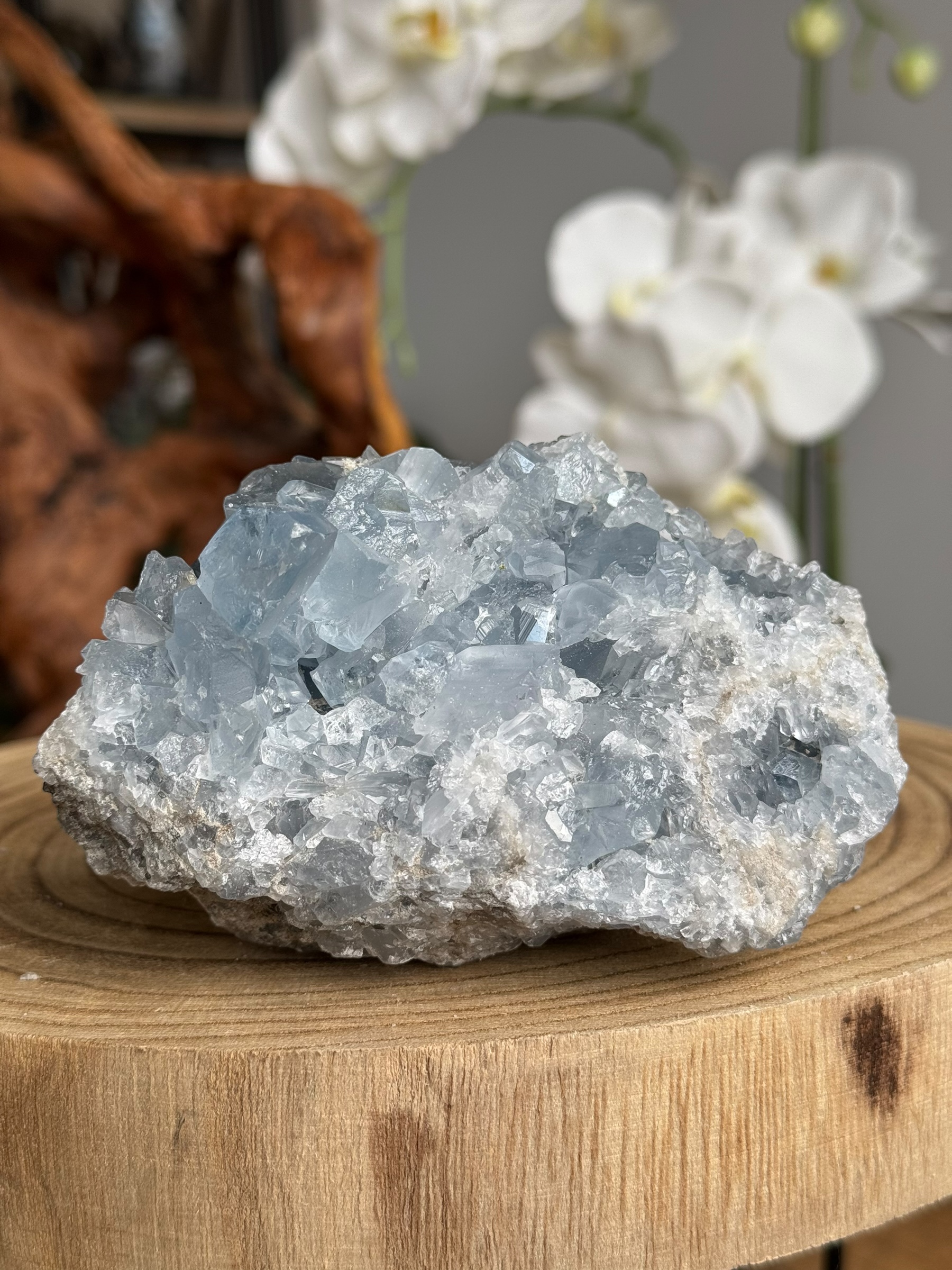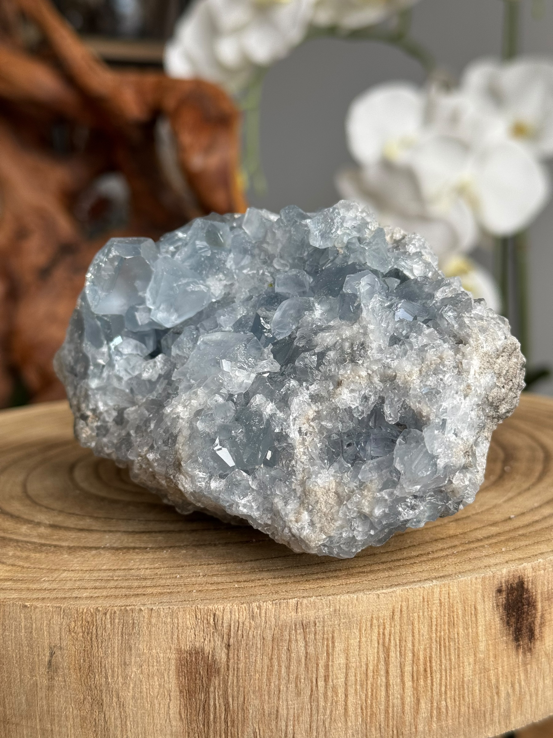 Celestien, ook bekend als celestiet. Het komt vaak voor in kristalvorm en wordt gewaardeerd om zijn hemelsblauwe tinten. Celestien wordt vaak gevonden in geoden en kan delicate en fragiele kristalstructuren hebben.