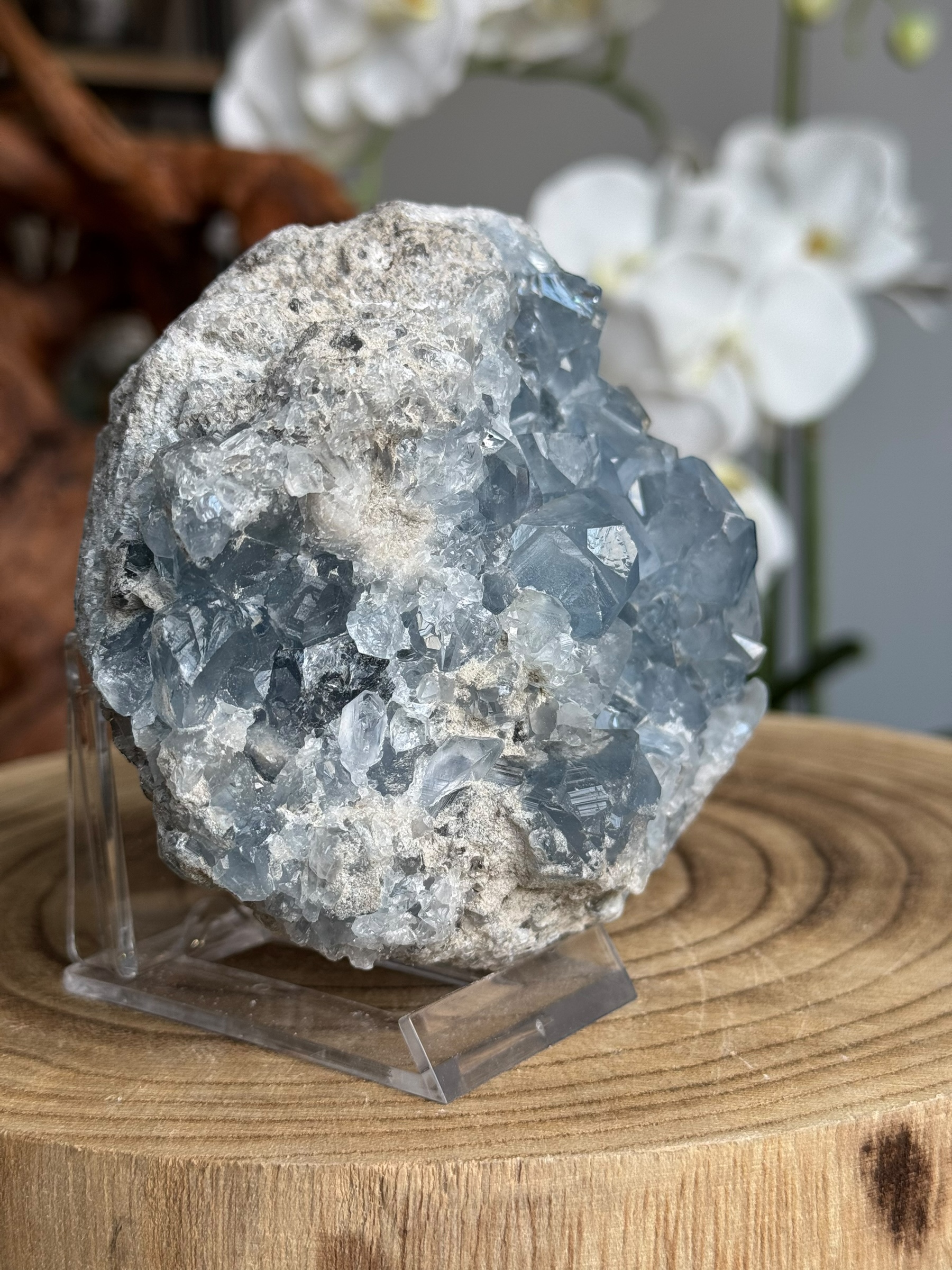 Celestien, ook bekend als celestiet. Het komt vaak voor in kristalvorm en wordt gewaardeerd om zijn hemelsblauwe tinten. Celestien wordt vaak gevonden in geoden en kan delicate en fragiele kristalstructuren hebben.