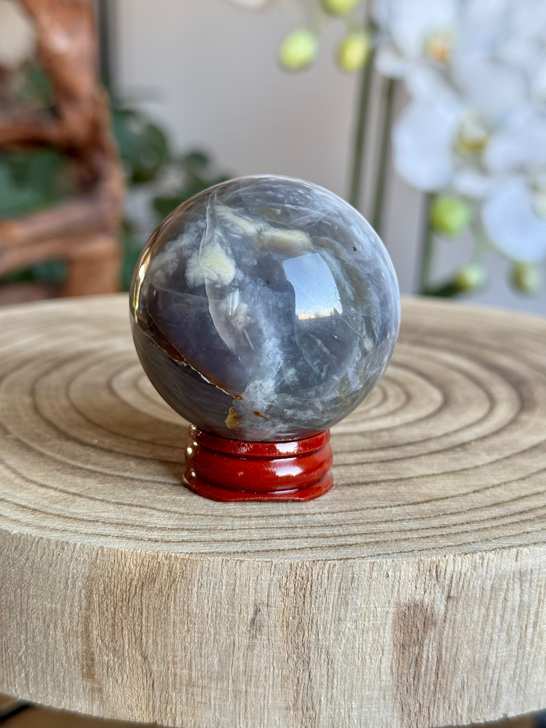 Deze prachtige chalcedoonbol uit Indonesië doet denken aan een schilderij, met zijn betoverende vegen van wit, blauw, bruin en subtiele tinten paars. De natuurlijke kleuren en patronen geven deze bol een kunstzinnige uitstraling die echt opvalt.