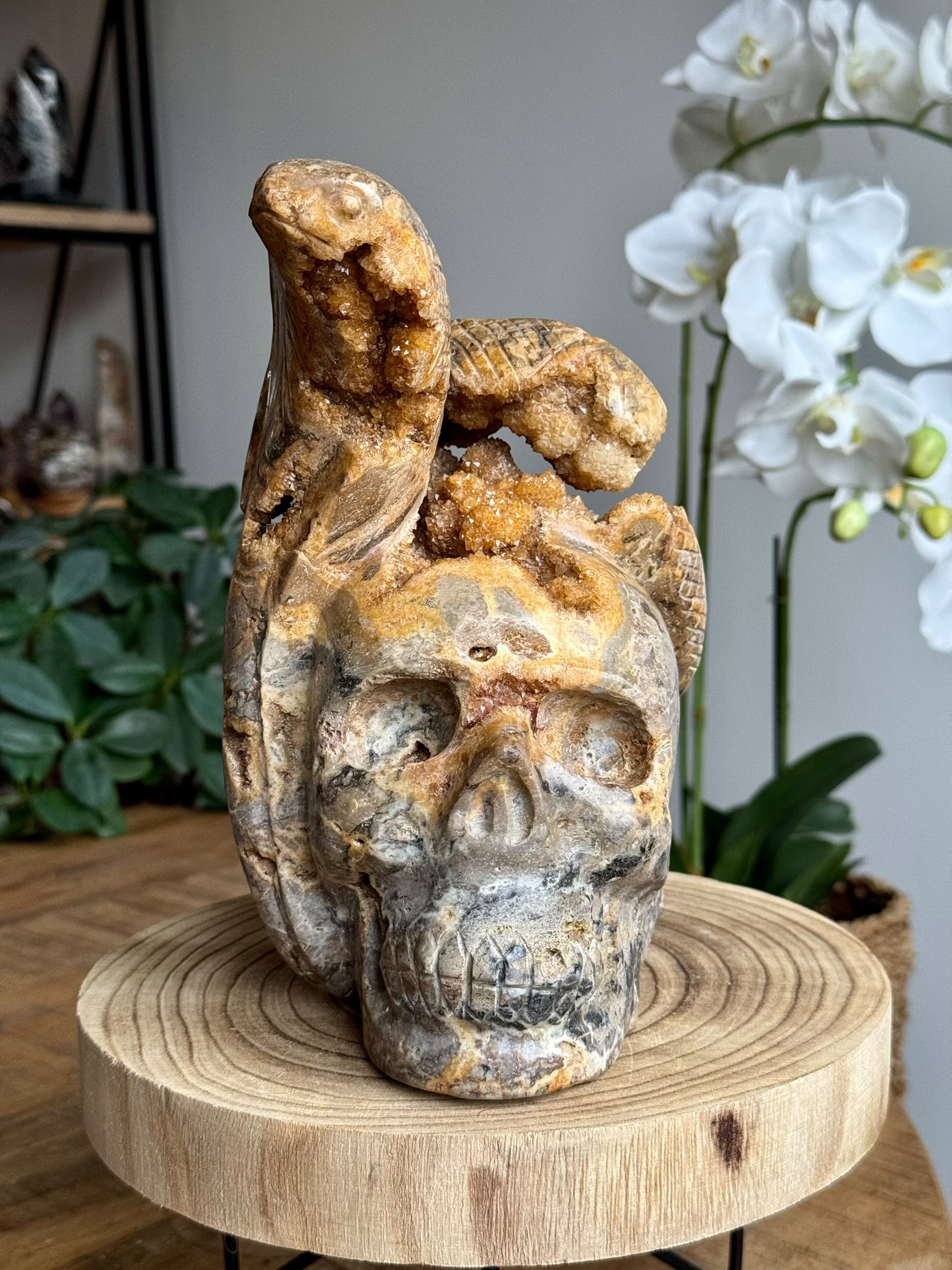 Ontdek de intrigerende schoonheid van deze prachtige chalcedoon carving, verrijkt met natuurlijke kwarts en goud/bruine kristallen. Dit bijzondere kunstwerk toont een gedetailleerde schedel met een slang die zich sierlijk bovenop het hoofd bevindt, wat het een opvallend en uniek stuk maakt. Deze carving is met de hand gemaakt in Indonesië wat het een waar meesterwerk maakt.