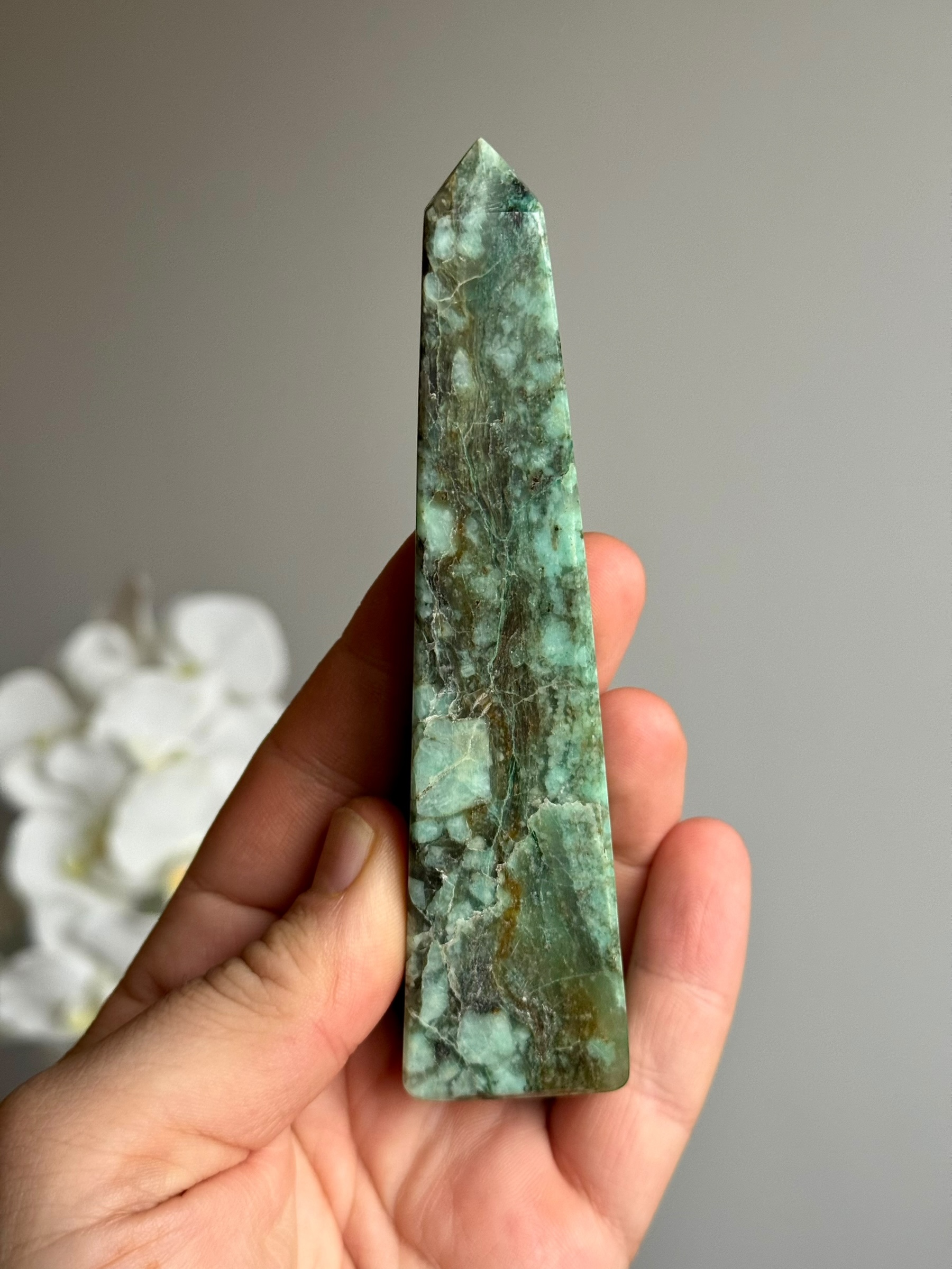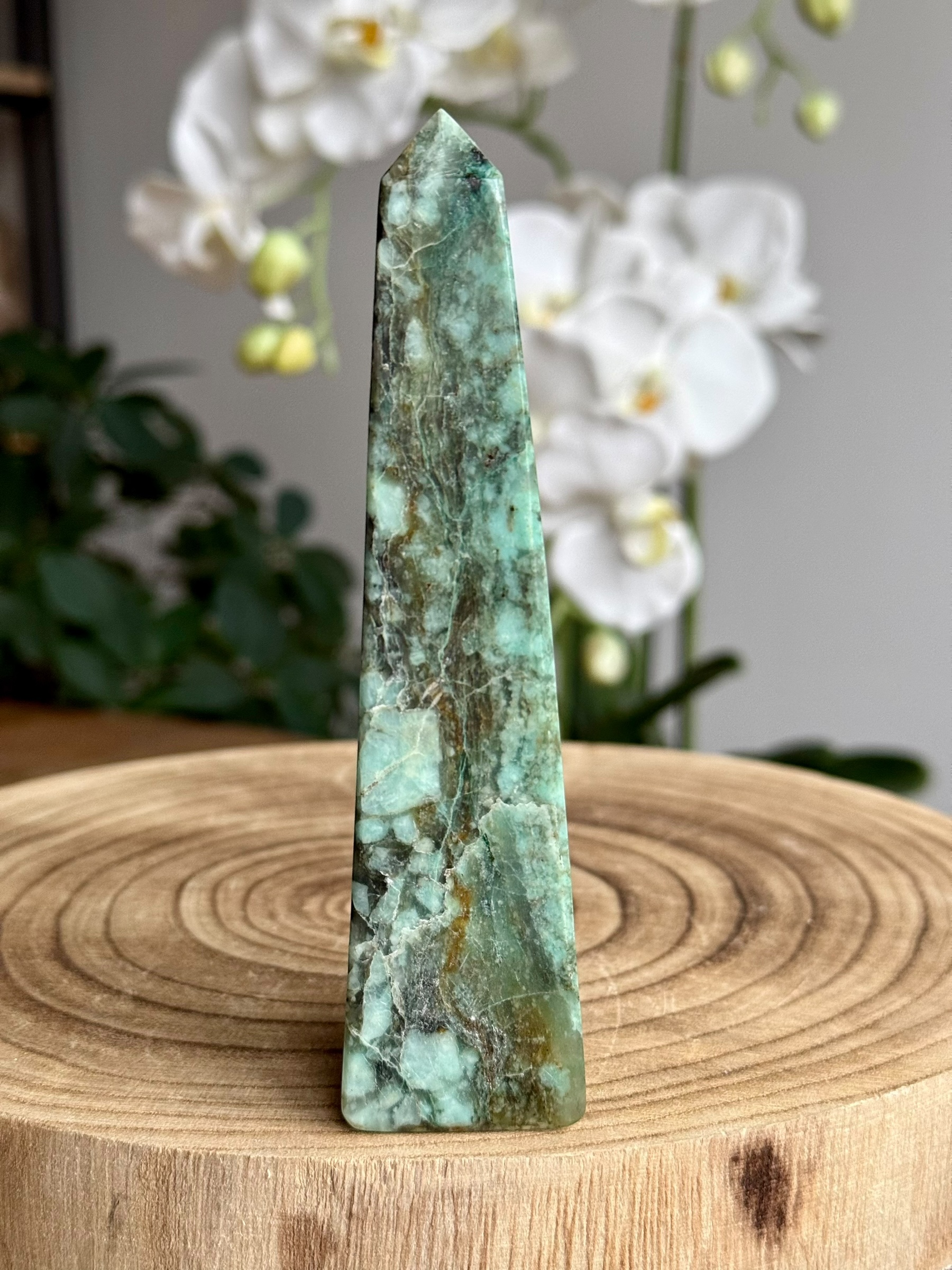 Deze prachtige Chrysocolla in Kwarts toren, afkomstig uit Pakistan, heeft een indrukwekkende en unieke tekening. De levendige kleuren van de chrysocolla worden prachtig verweven met kwarts.