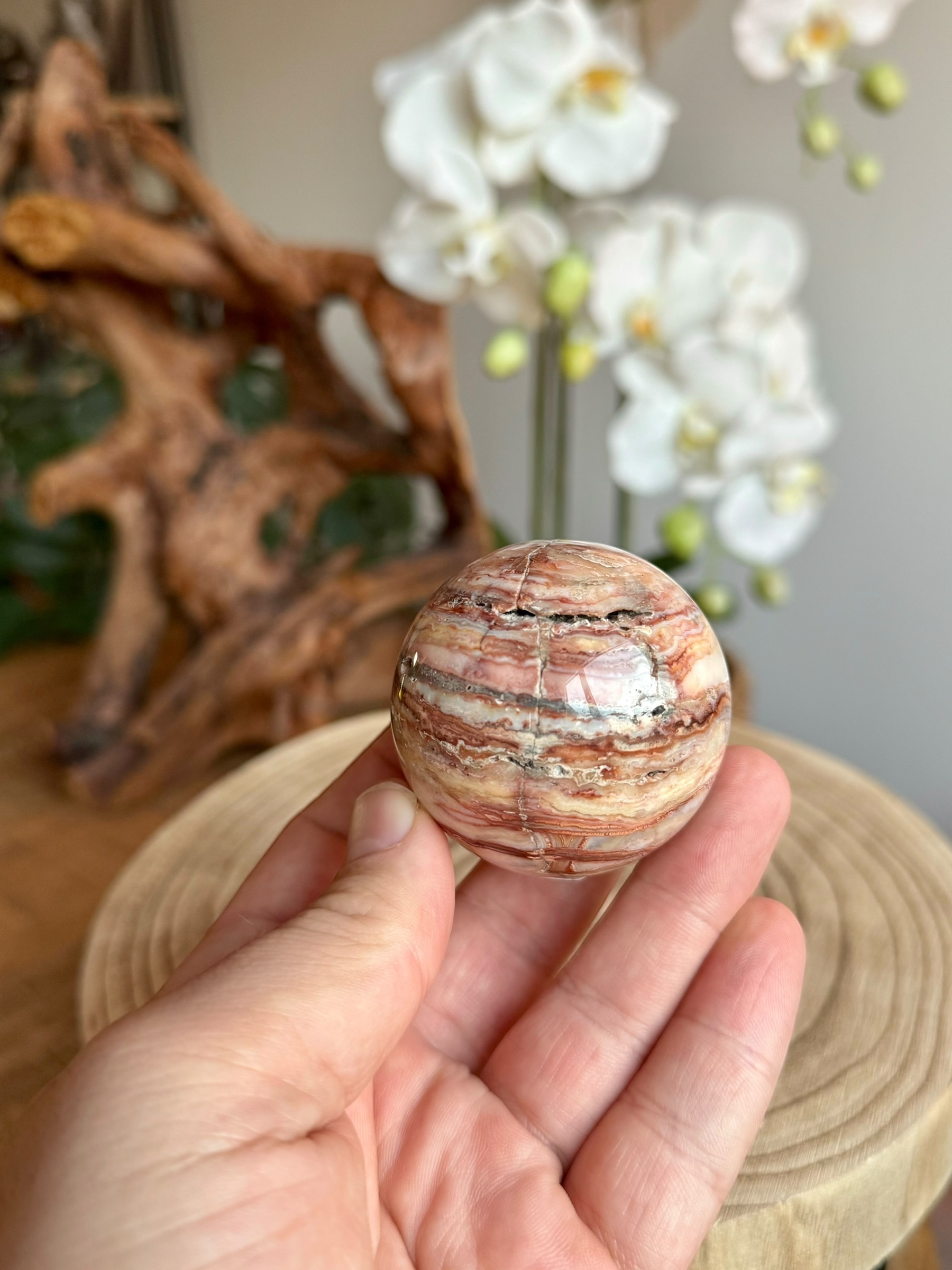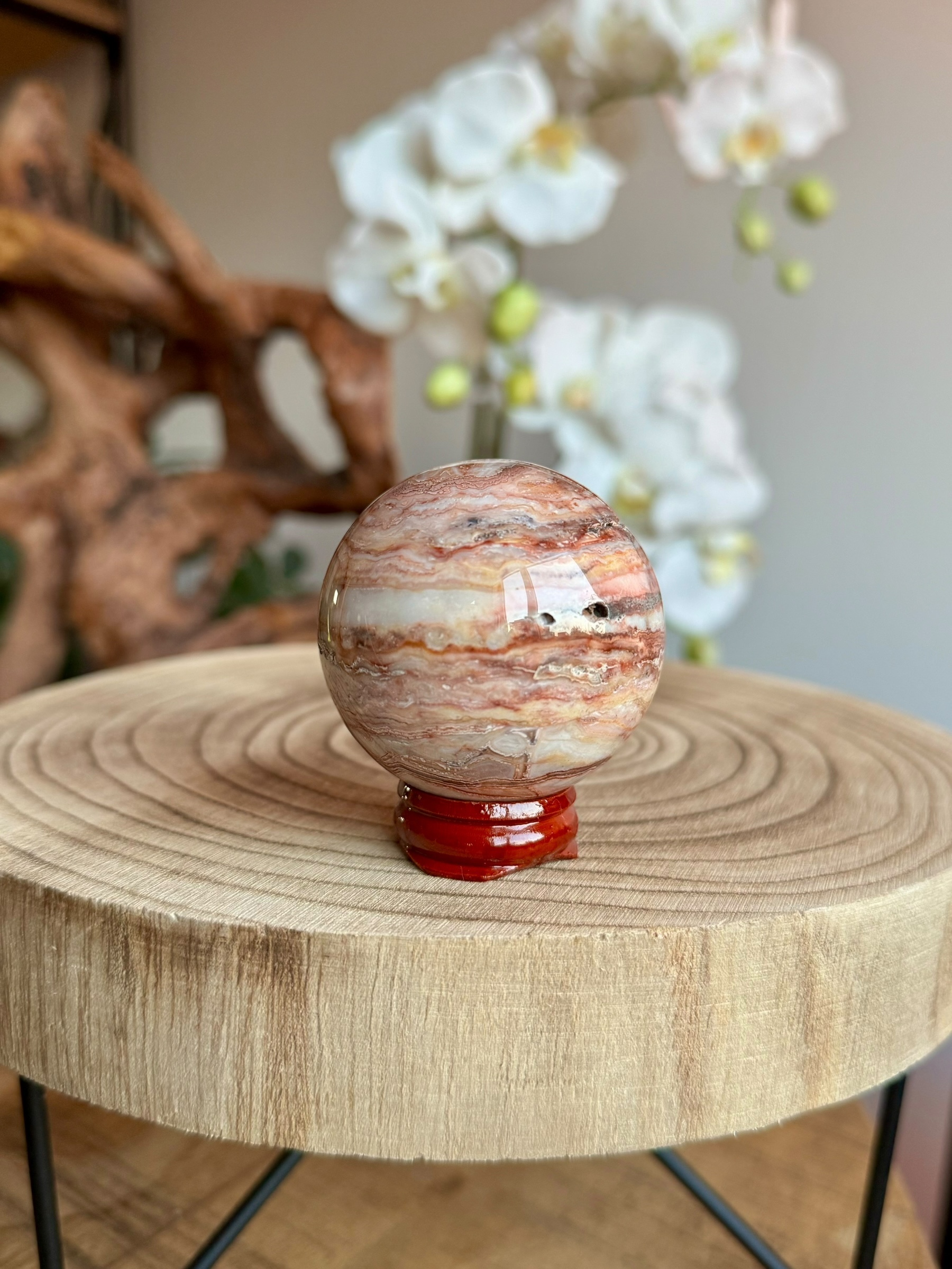 Deze mooie crazy lace agaat bol valt op door zijn bijzondere bruin, witte en roze lijnen. Met zijn unieke kleuren en patronen is deze bol een fraaie aanvulling voor elke hoek van je huis.