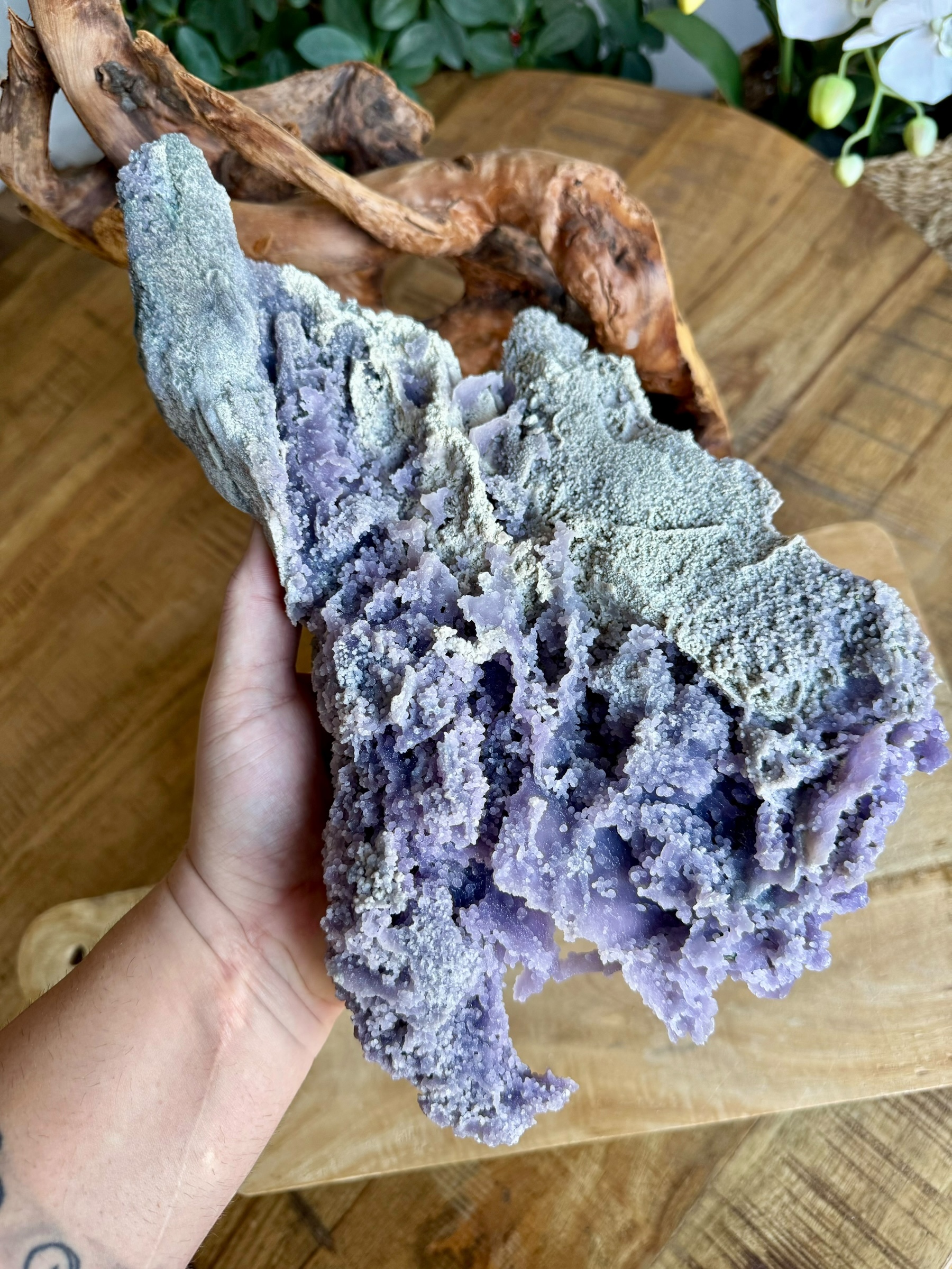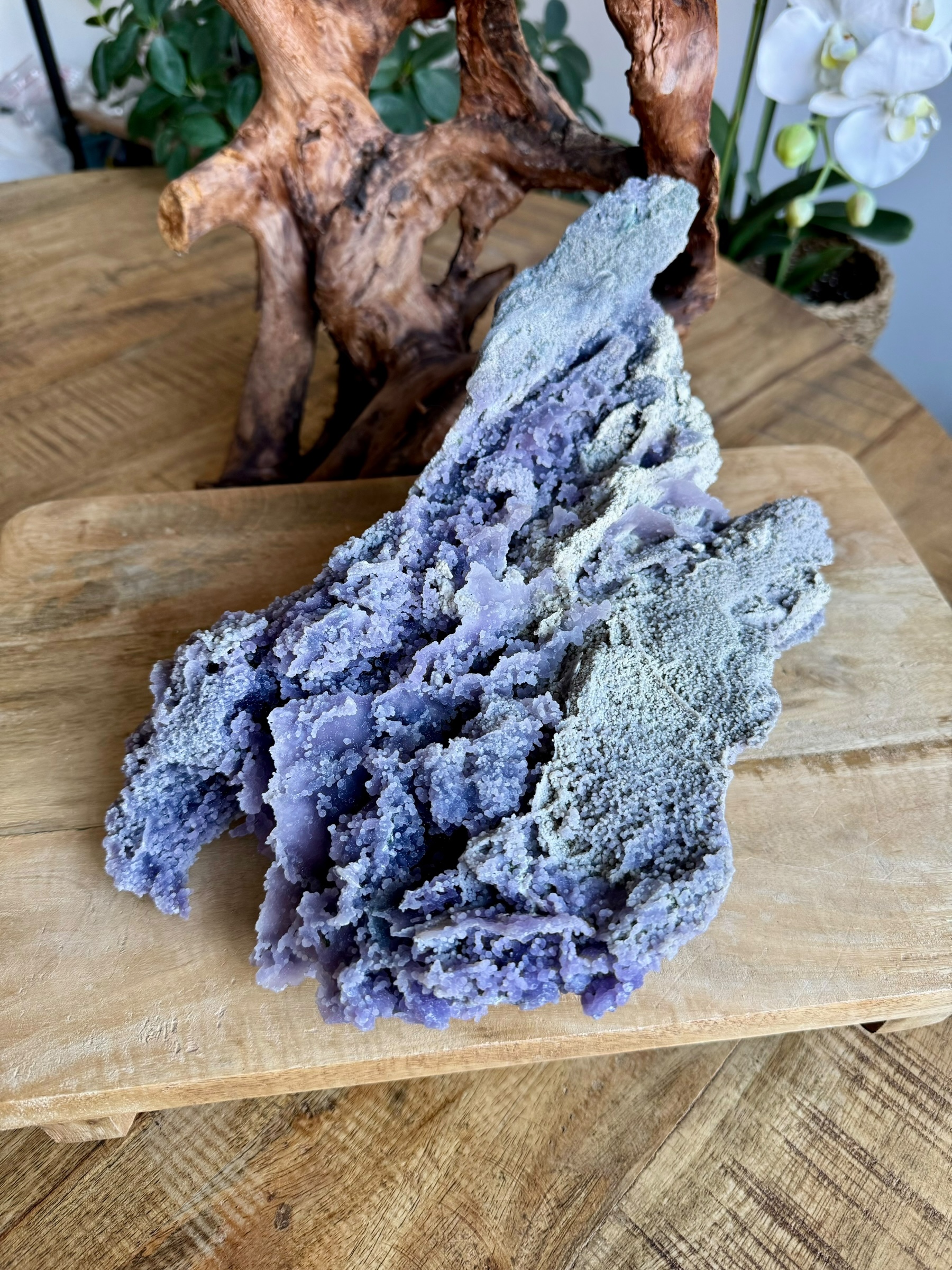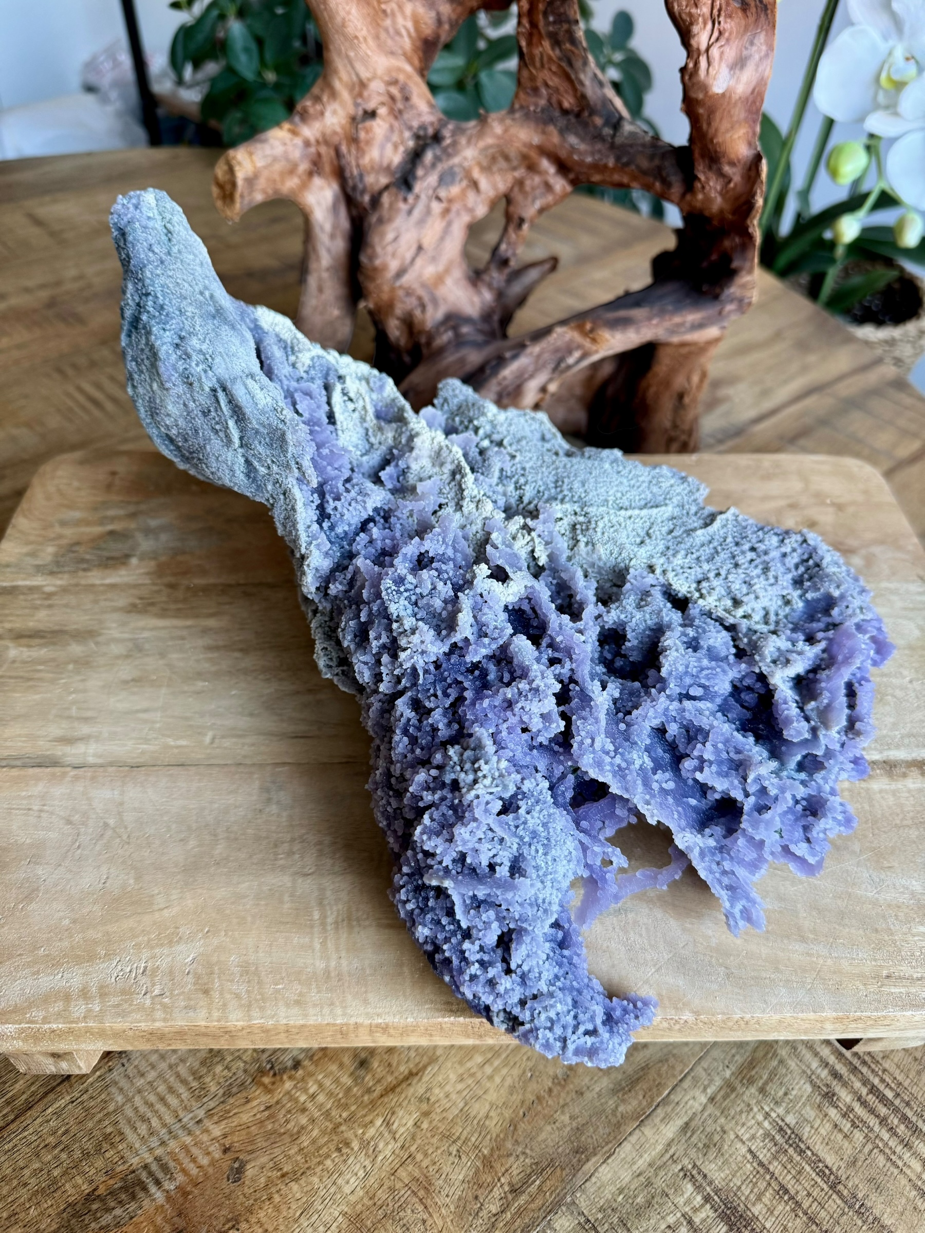 Deze indrukwekkende druifagaat is een ware eye-catcher en valt zeker in de categorie statement stukken. Met een gewicht van maar liefst 2,930 kilo en een krachtige, elegante vorm, heeft dit stuk een unieke uitstraling die zelfs doet denken aan de vorm van een schorpioen. De diepe paarse kleur en robuuste, natuurlijke vlakken geven het geheel een indrukwekkende en sterke uitstraling.