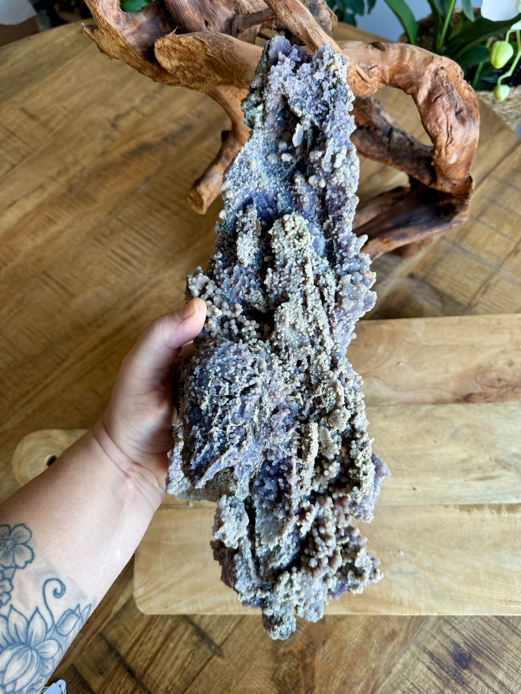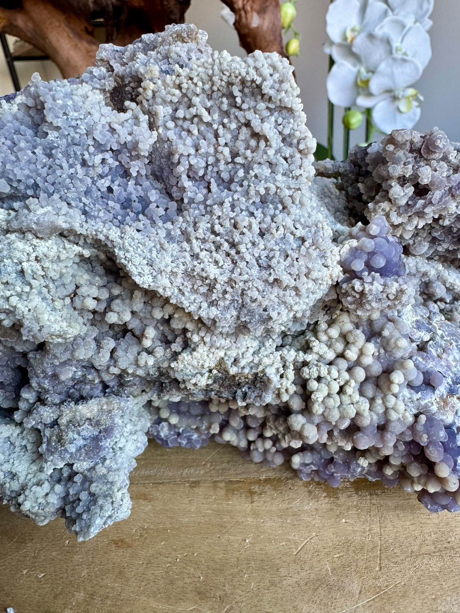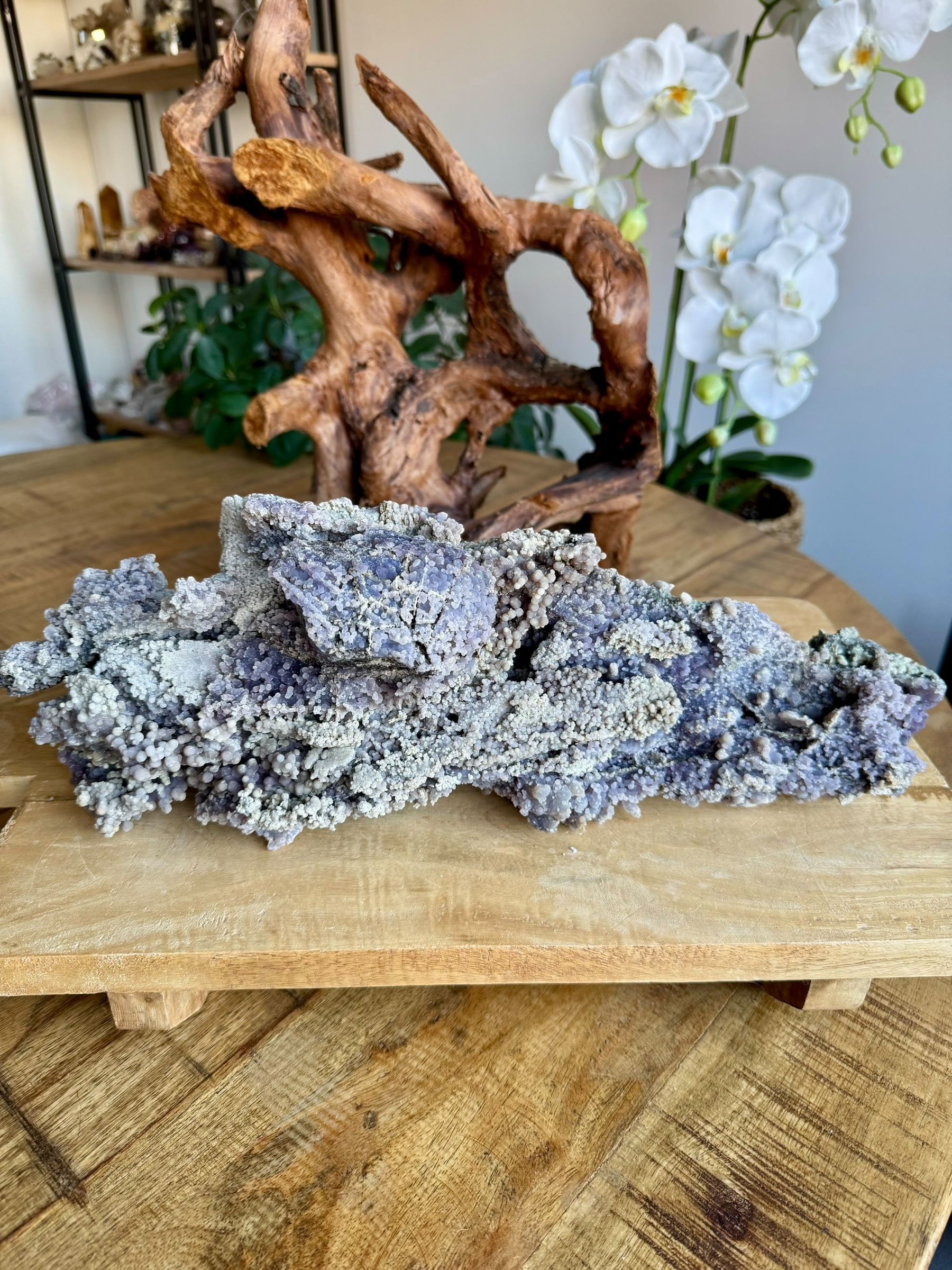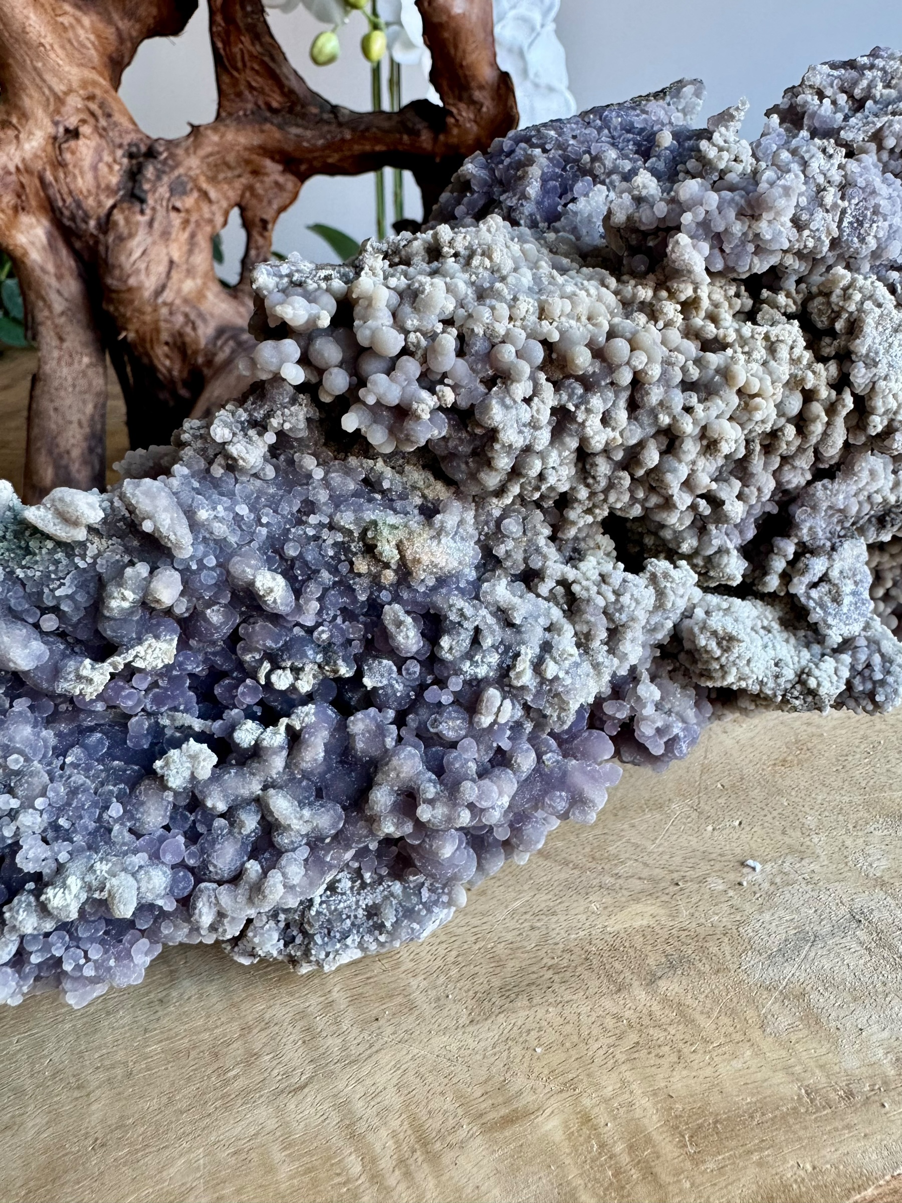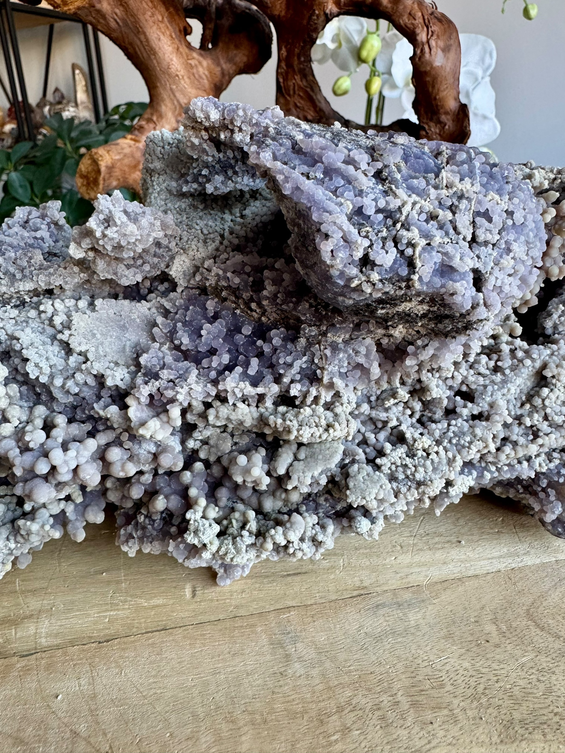 Deze bijzondere druifagaat van 3,780 kilo is een ware blikvanger die niet te missen is. Zijn imposante formaat en de prachtige paarse kleur zorgen voor een krachtige uitstraling die elke ruimte transformeert. De unieke vorm en textuur geven deze steen een karakter dat uitnodigt tot bewondering.