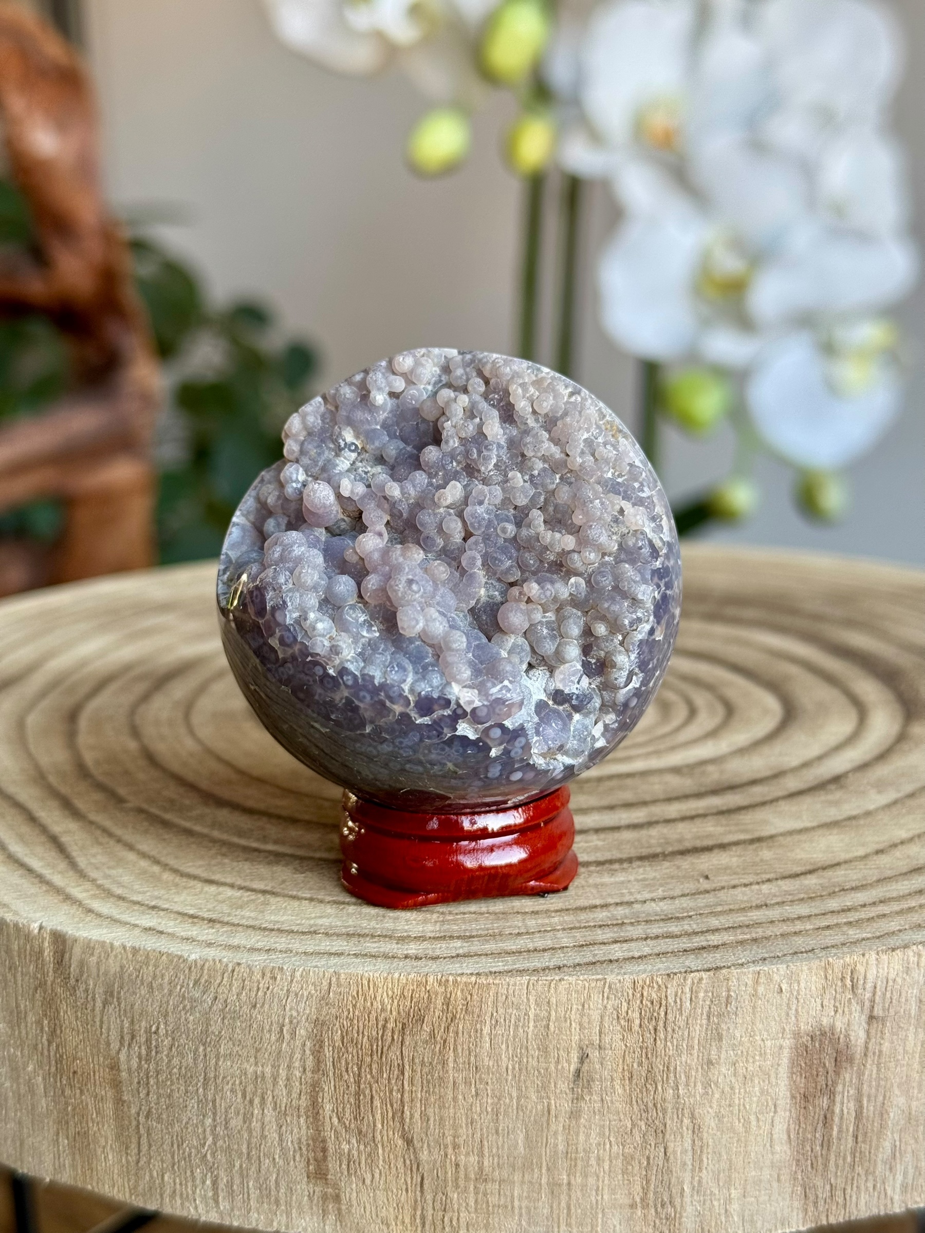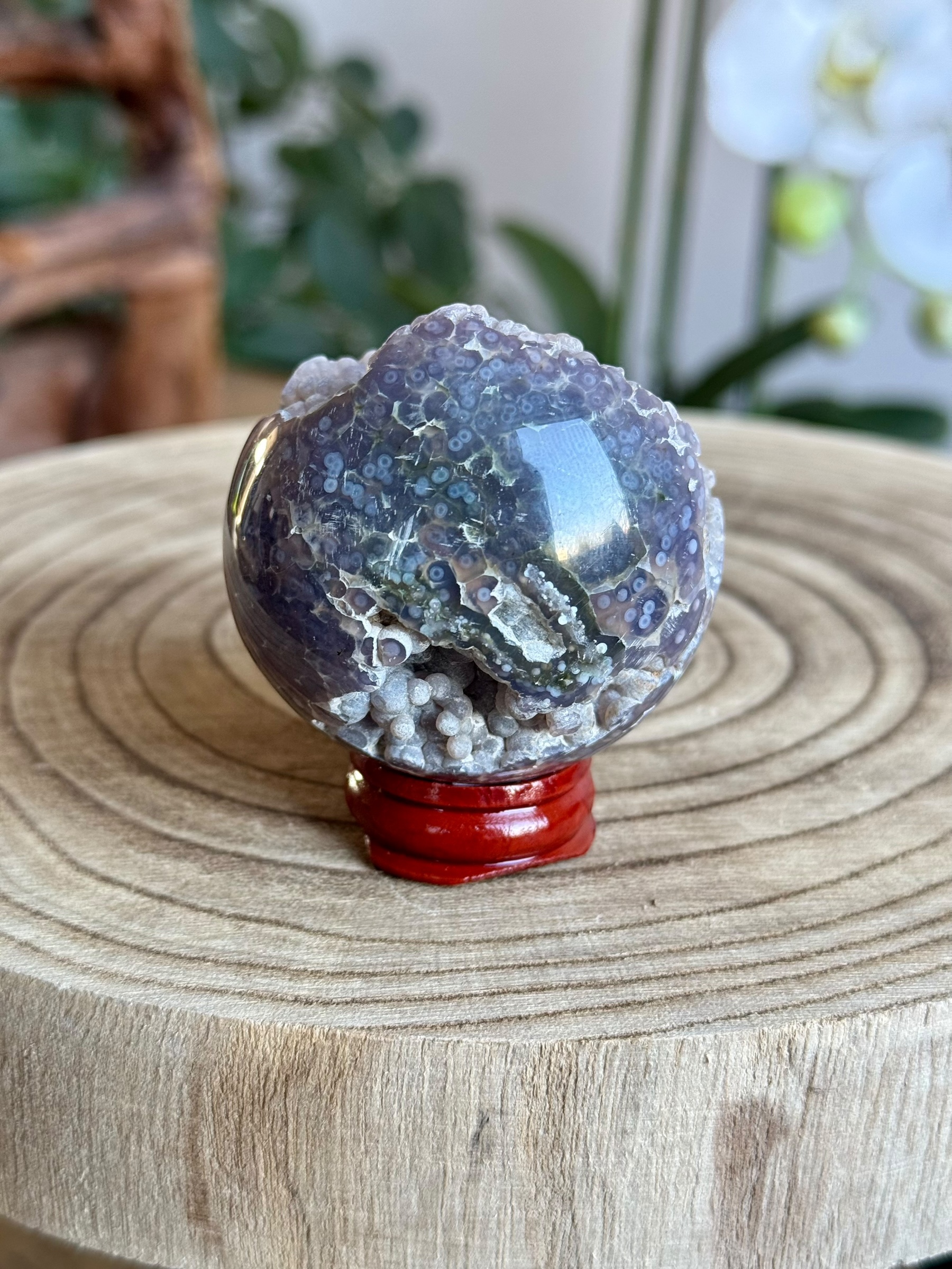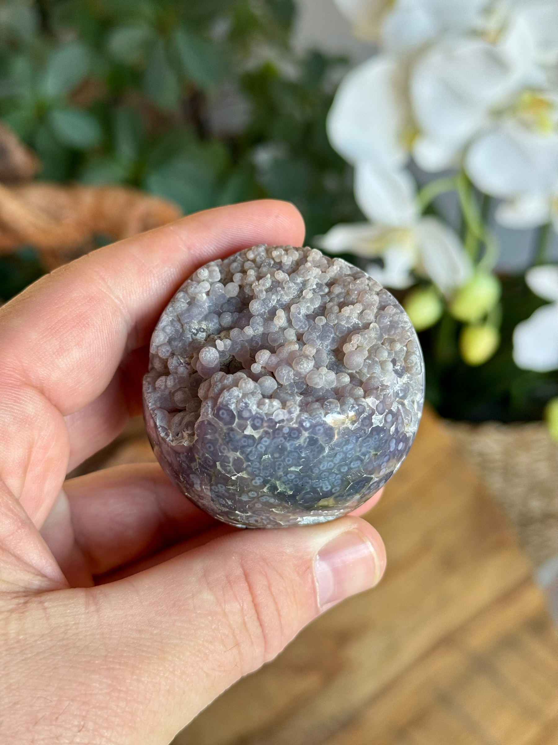 Druifagaat wordt vaak in prachtige ruwe stukken verkocht (ook op onze webshop), maar soms worden er ook mooie bollen van gemaakt. Dit geeft een andere dimensie aan de steen, vooral voor liefhebbers van bollen en druifagaat.