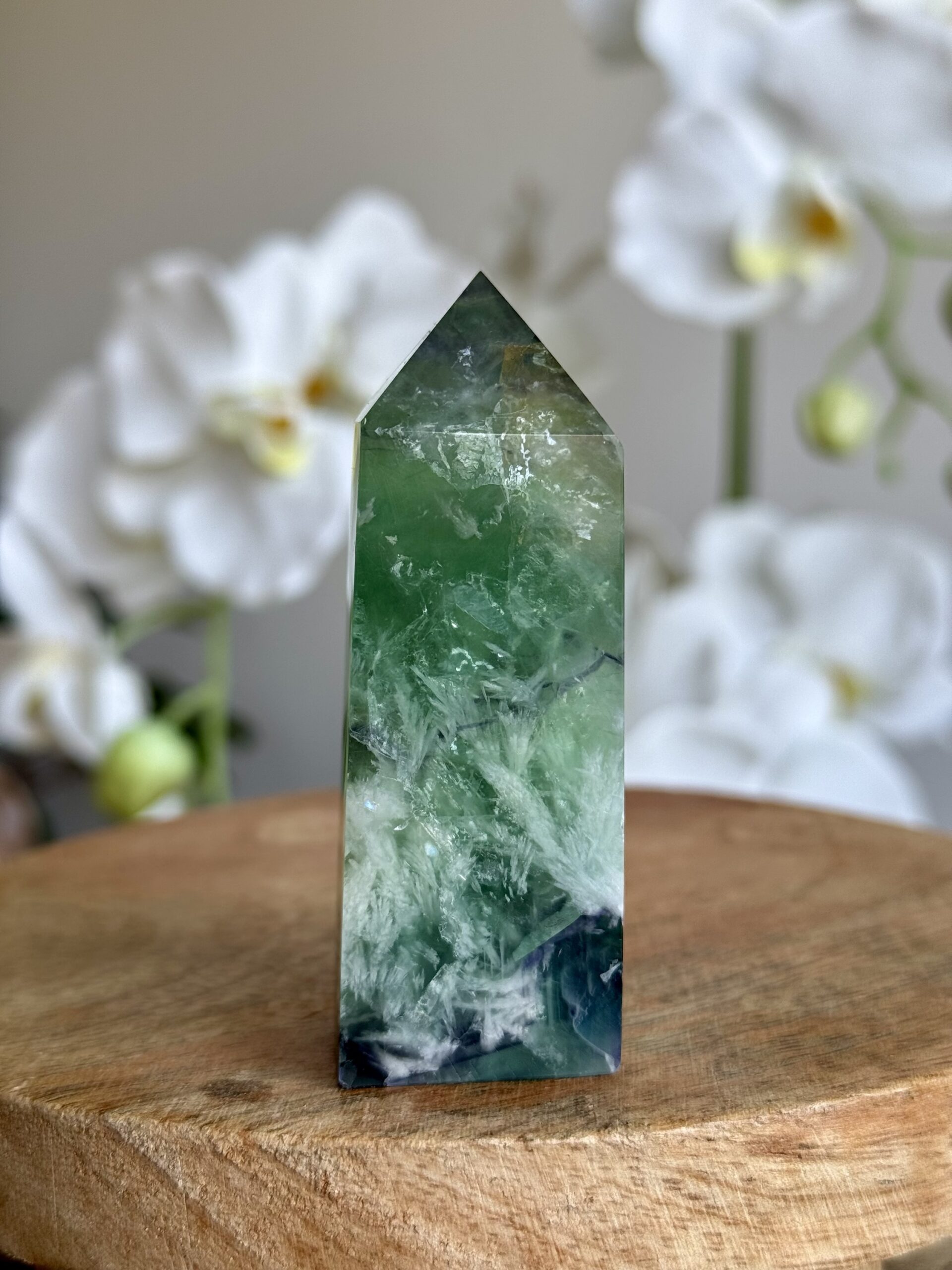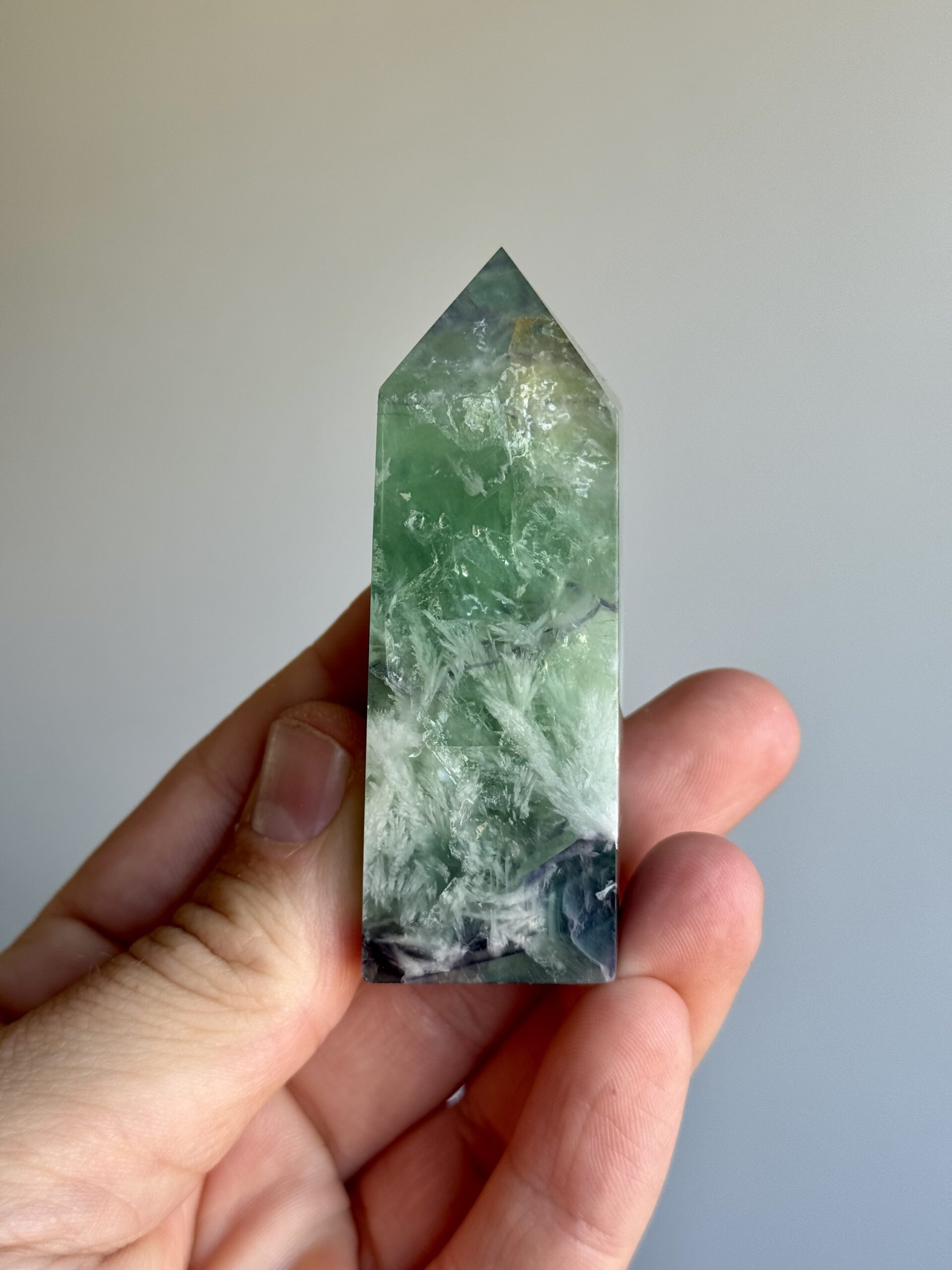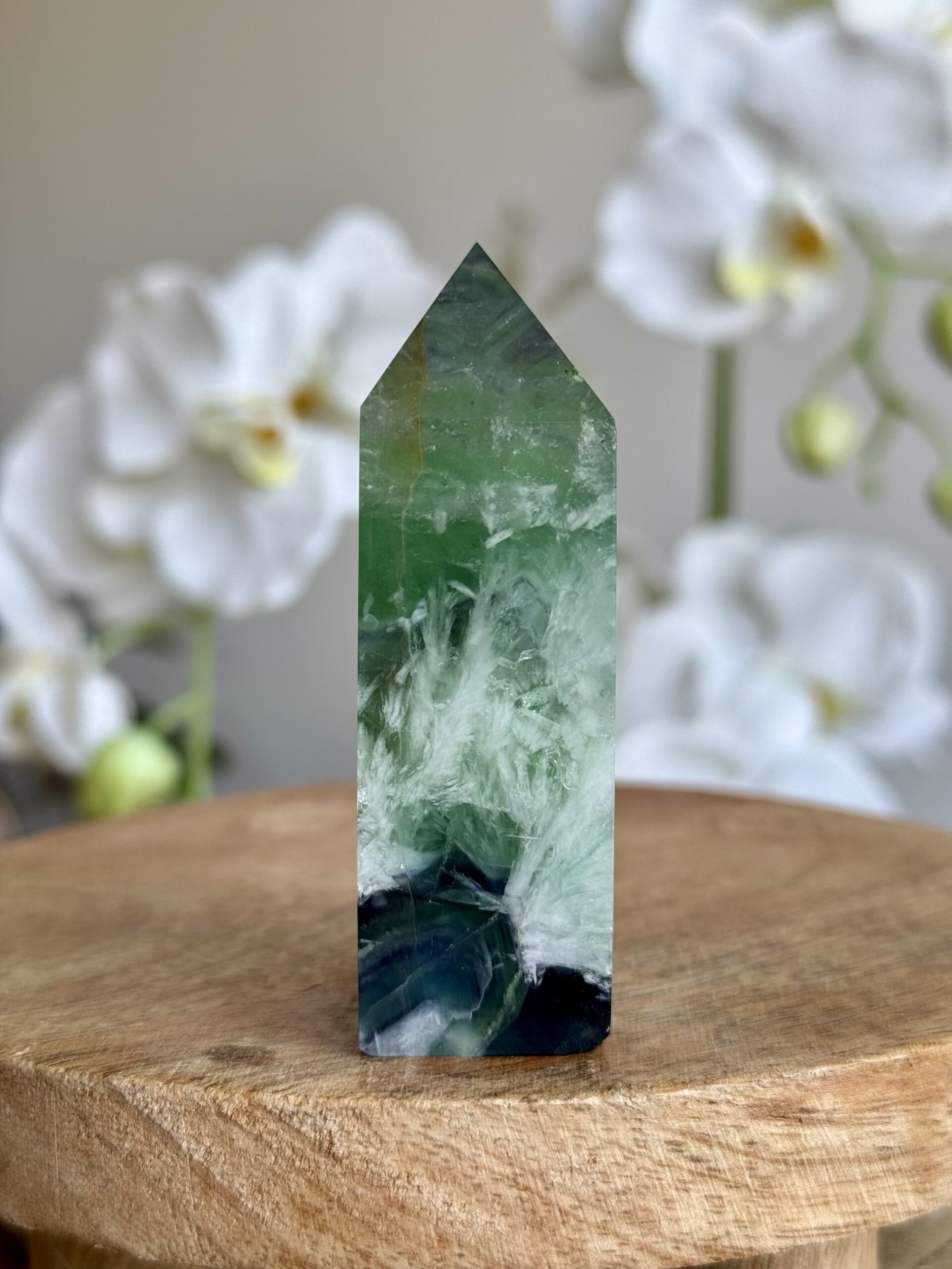 Dit verfijnde torentje van fluoriet valt op door zijn unieke, veerachtige patronen en gelaagde kleuren. Het gladde oppervlak en de zachte kleurovergangen maken het tot een stijlvol decoratief object en een echte blikvanger in elk interieur of verzameling.
