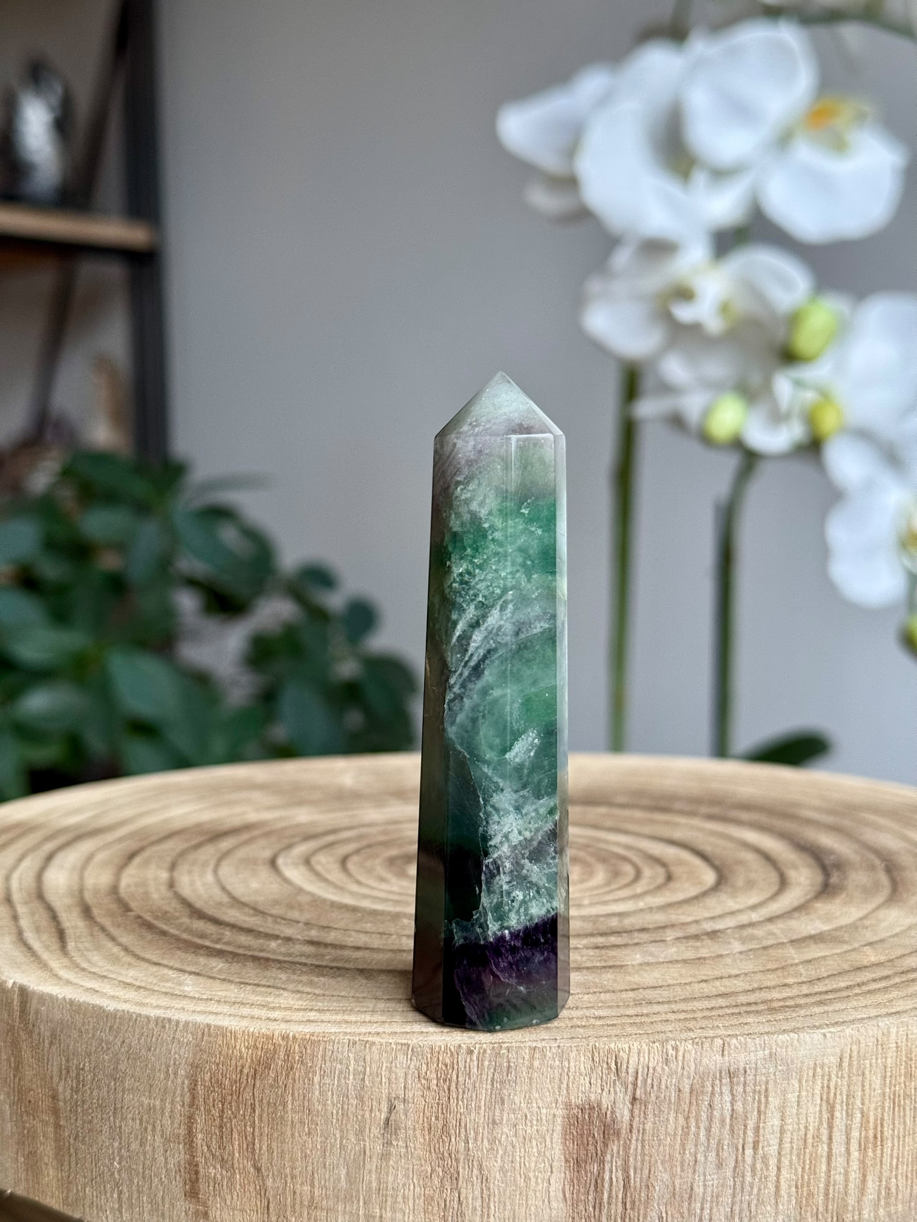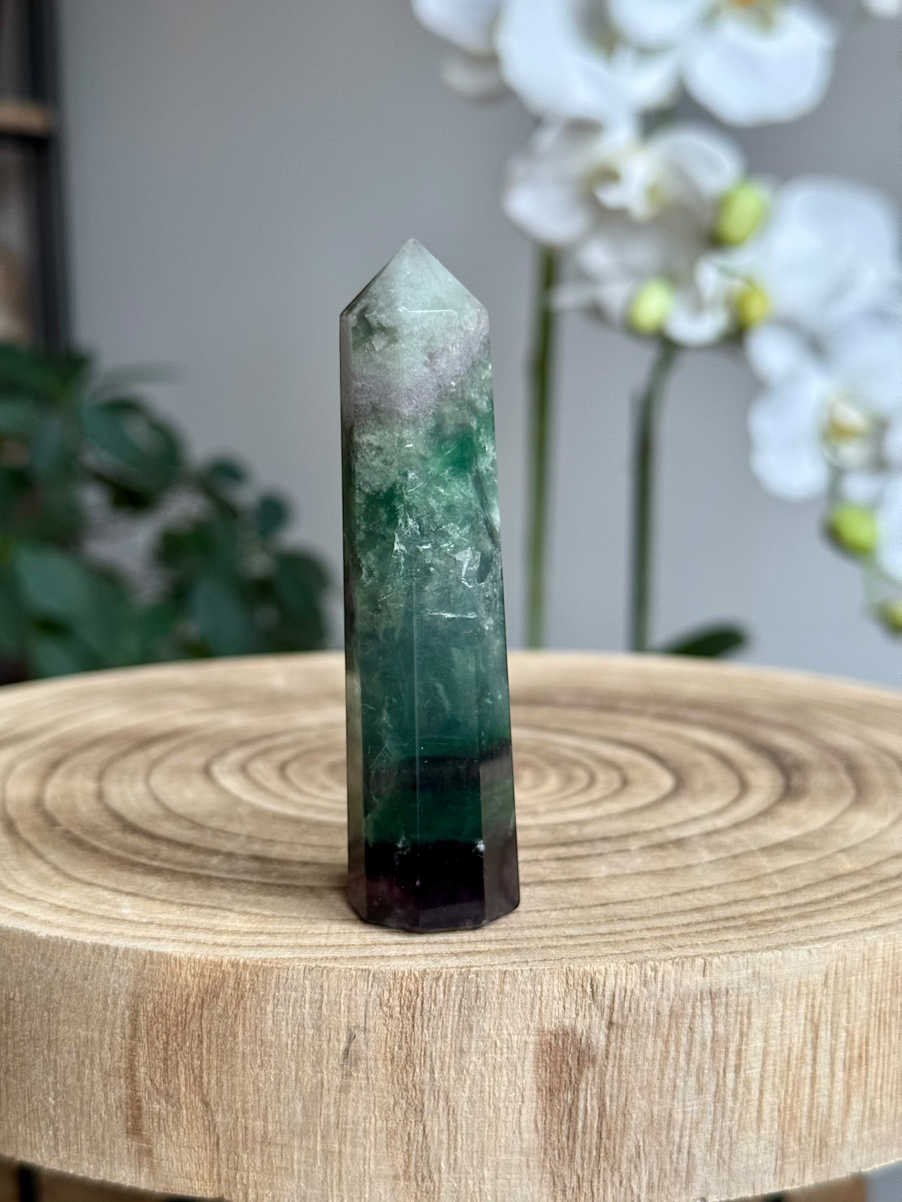 Dit fluoriet torentje is perfect als decoratief stuk en voegt een vleugje natuurlijke elegantie toe aan elke ruimte. De bijzondere kleurencombinatie maakt het niet alleen aantrekkelijk, maar ook een verfijnde en stijlvolle toevoeging aan je interieur.