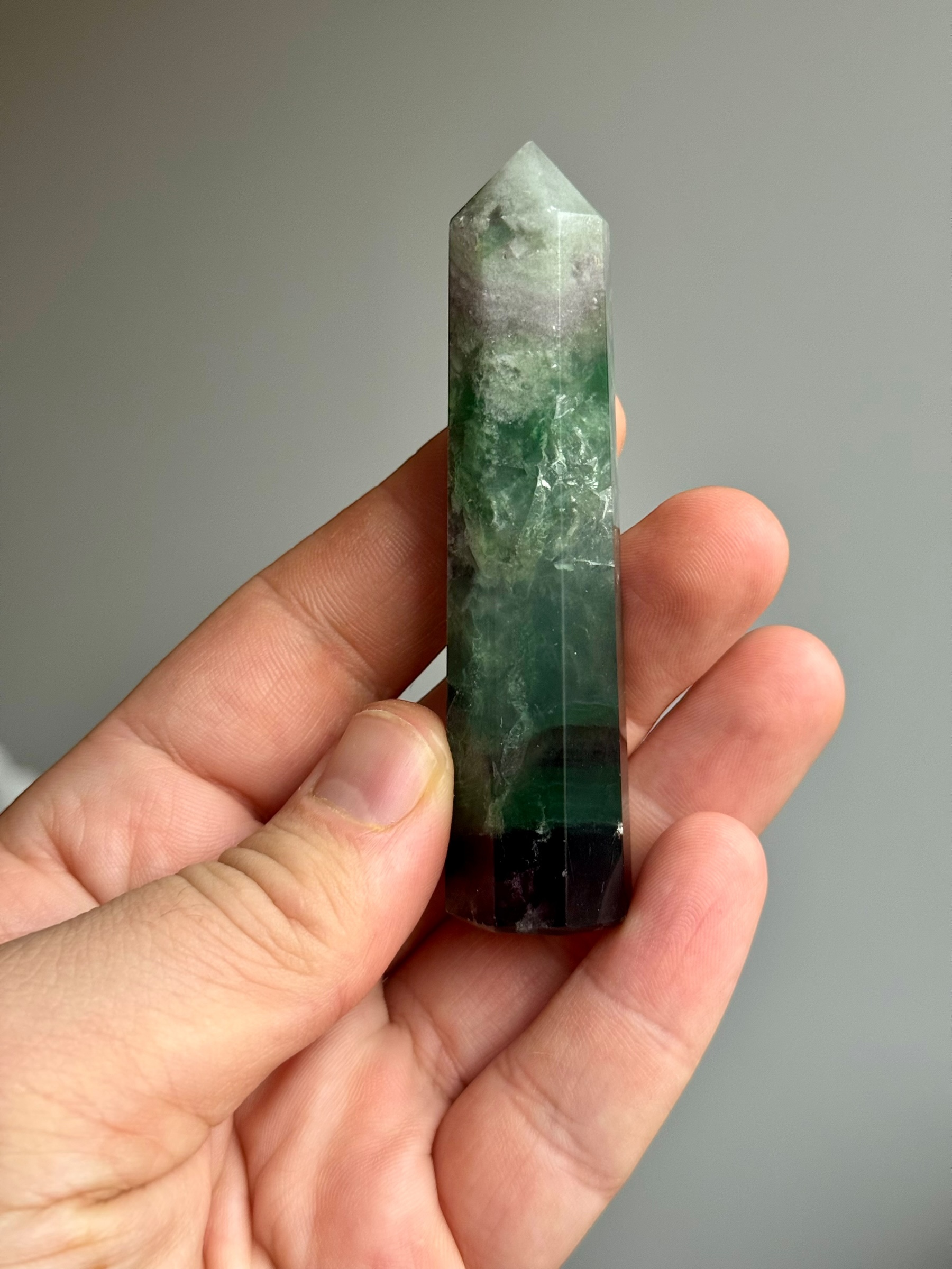 Dit prachtige fluoriet torentje heeft een betoverend kleurenpalet van wit, paars en groen. Elk torentje is uniek en straalt een serene schoonheid uit door de harmonieuze combinatie van deze kleuren. De natuurlijke gelaagdheid en transparantie van de fluoriet zorgen voor een fascinerend visueel effect dat zowel rustgevend als oogverblindend is.
