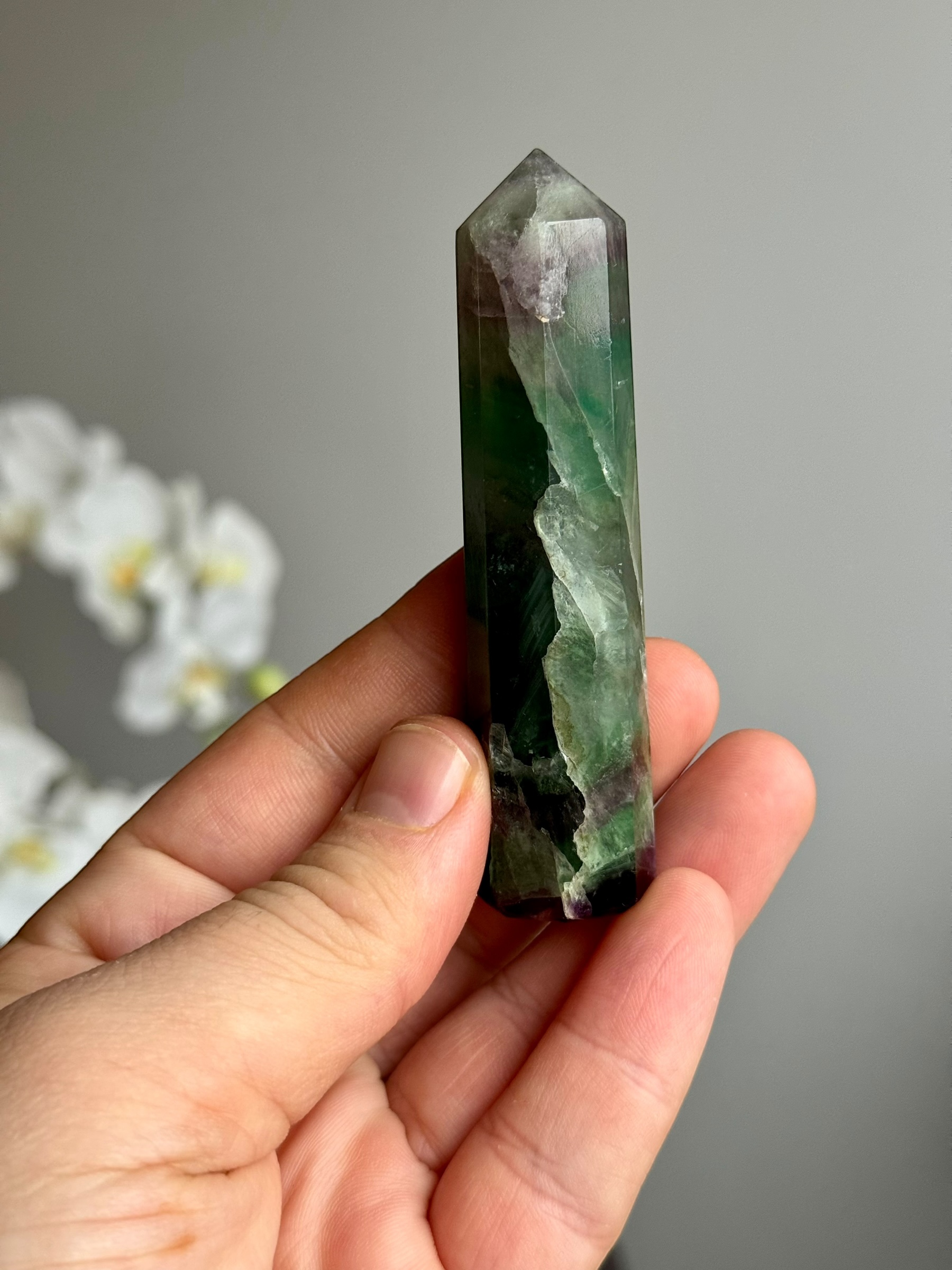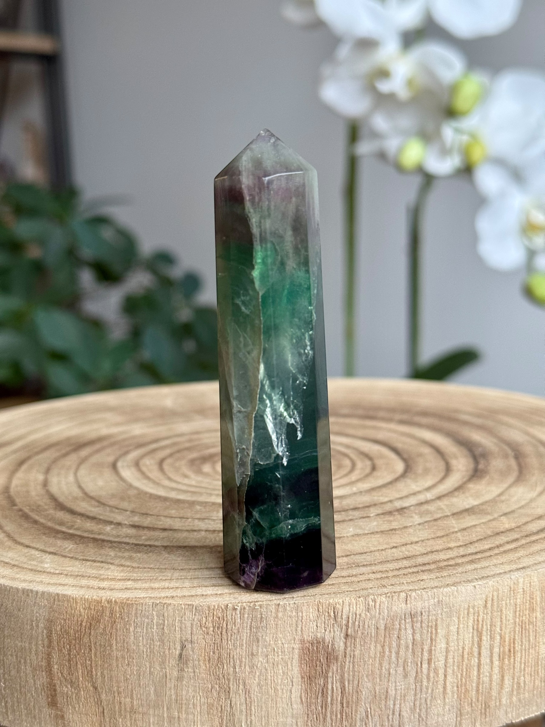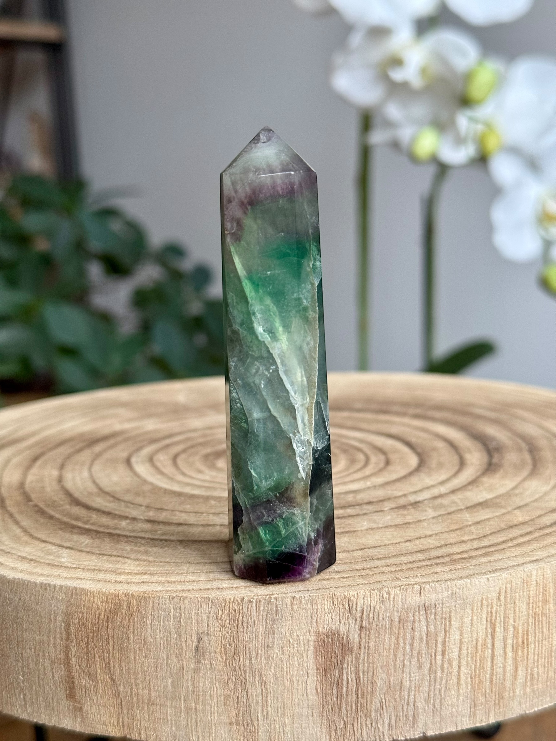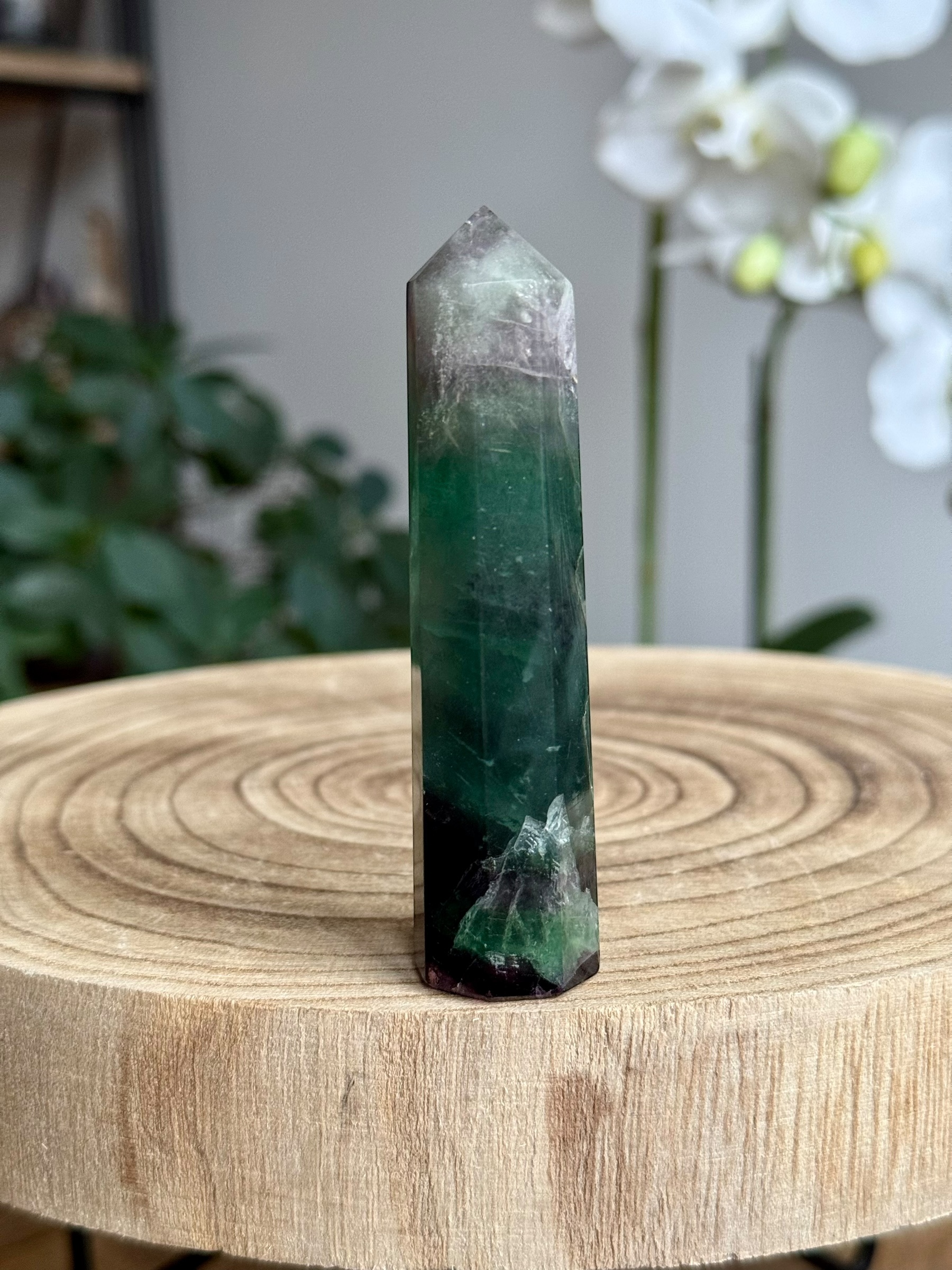 Dit fluoriet torentje is perfect als decoratief stuk en voegt een vleugje natuurlijke elegantie toe aan elke ruimte. De bijzondere kleurencombinatie maakt het niet alleen aantrekkelijk, maar ook een verfijnde en stijlvolle toevoeging aan je interieur.