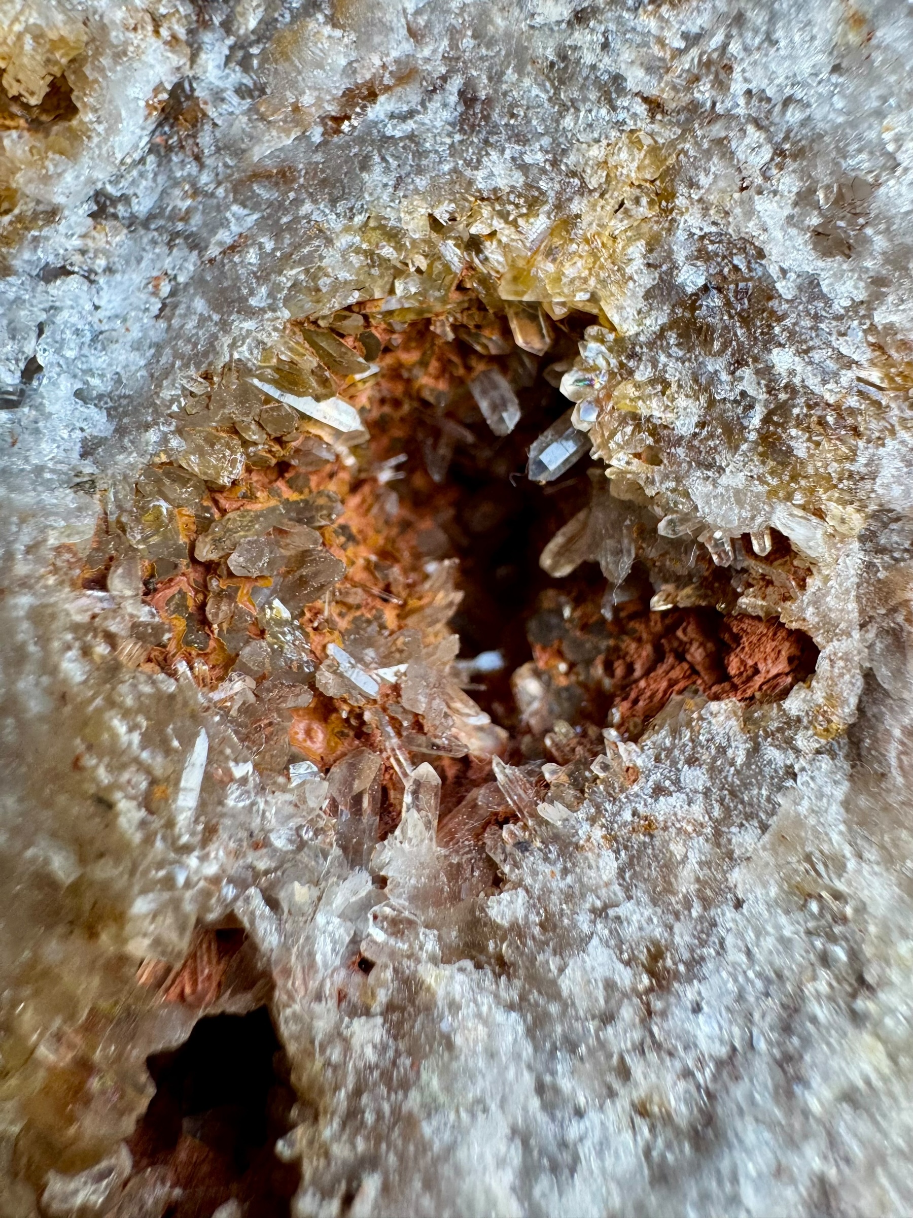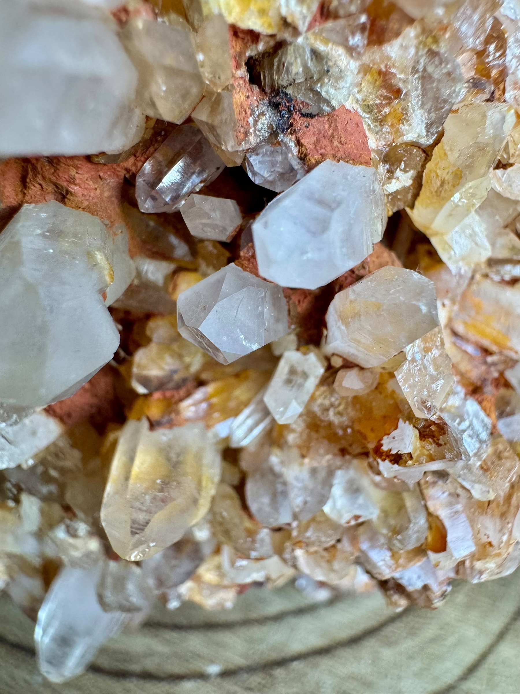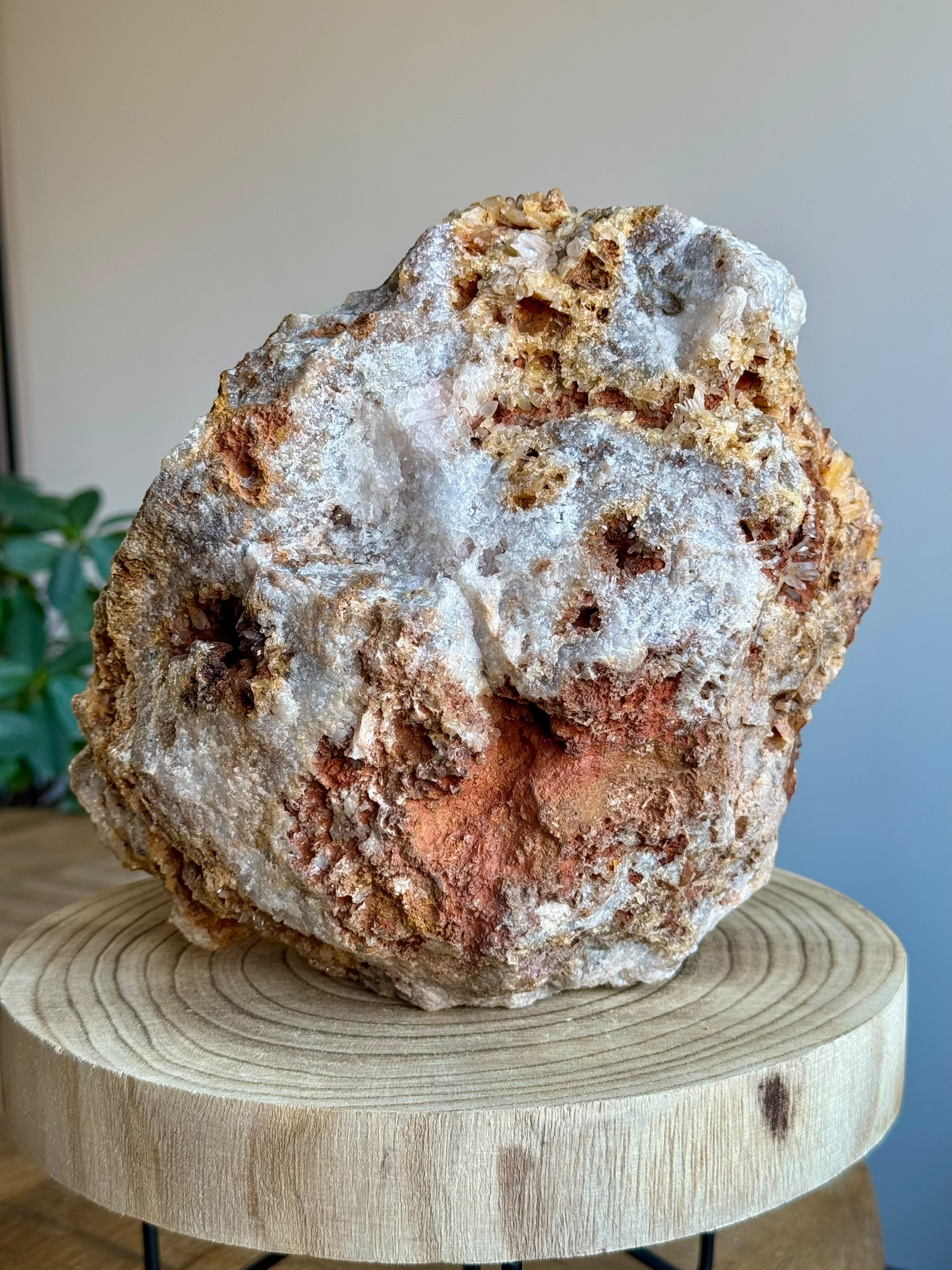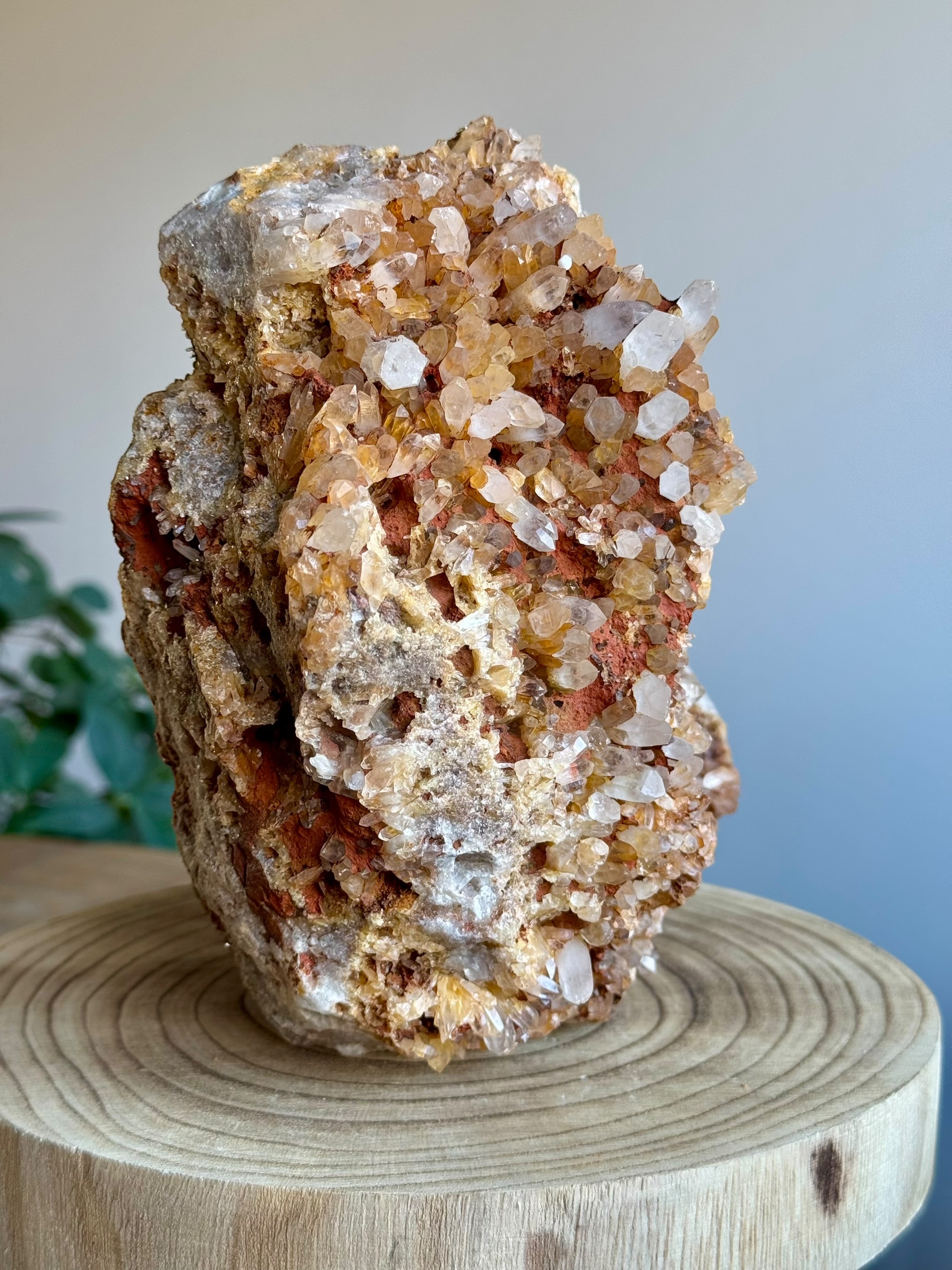 Dit prachtige stuk moedergesteente met schitterende kwarts kristallen is afkomstig uit Indonesië. De robuuste uitstraling van het moedergesteente geeft het direct een imposante uitstraling, waarbij de kwarts kristallen voor een mooi contrast zorgen. Hier en daar zijn de kristallen bedekt met fijne laagjes hematiet en limoniet, wat subtiele tinten toevoegt en de natuurlijke energie van het stuk versterkt. Dit maakt het niet alleen een visueel indrukwekkend exemplaar, maar ook een krachtig stuk om in huis te hebben.