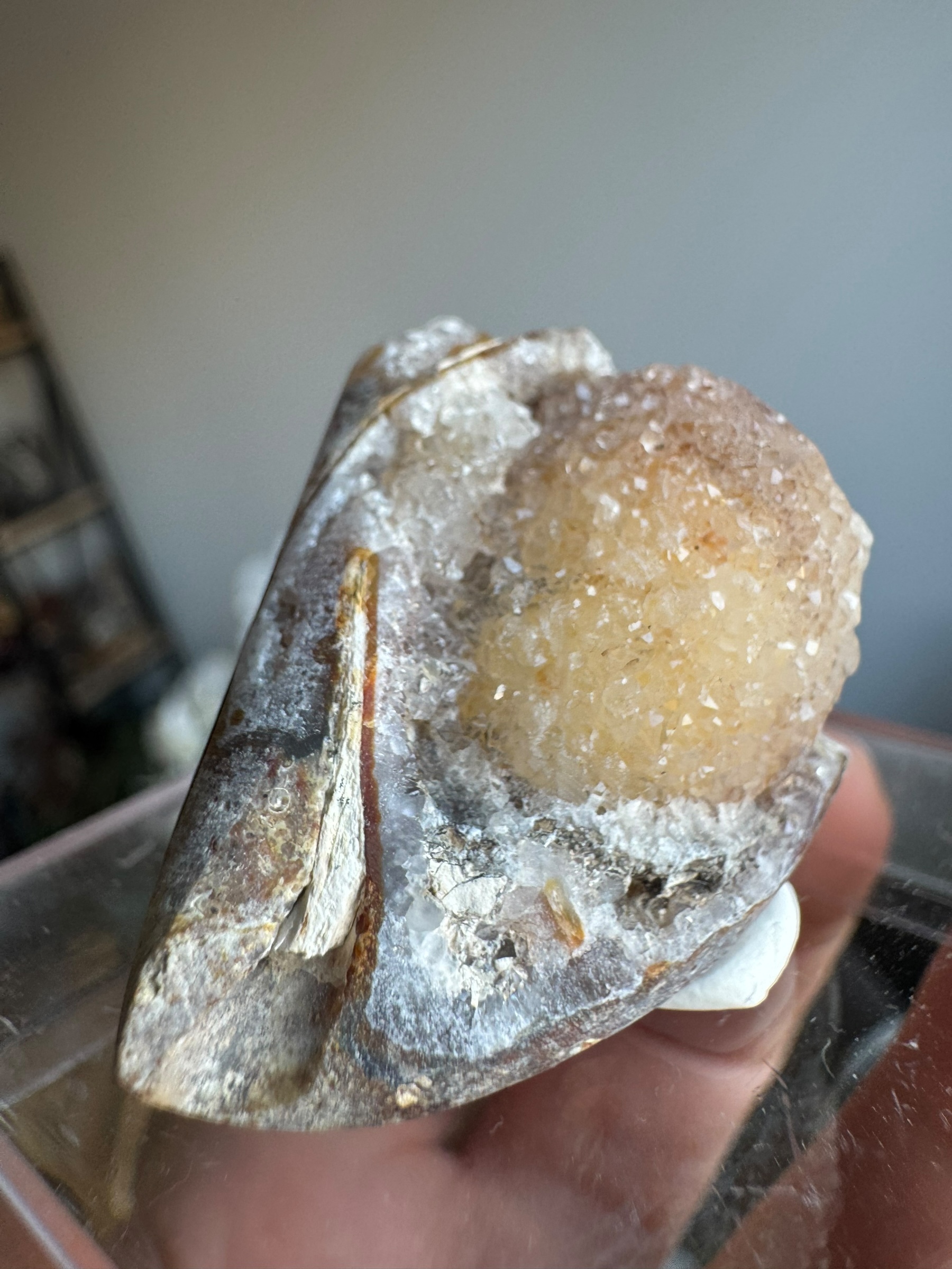 Elke schelp heeft zijn eigen unieke vorm en kristalstructuur, wat een glinsterend en betoverend effect creëert. De combinatie van de natuurlijke schoonheid van kwarts en de historische betekenis van de schelp maakt dit een bijzonder en opvallend stuk voor elke collectie of interieur.