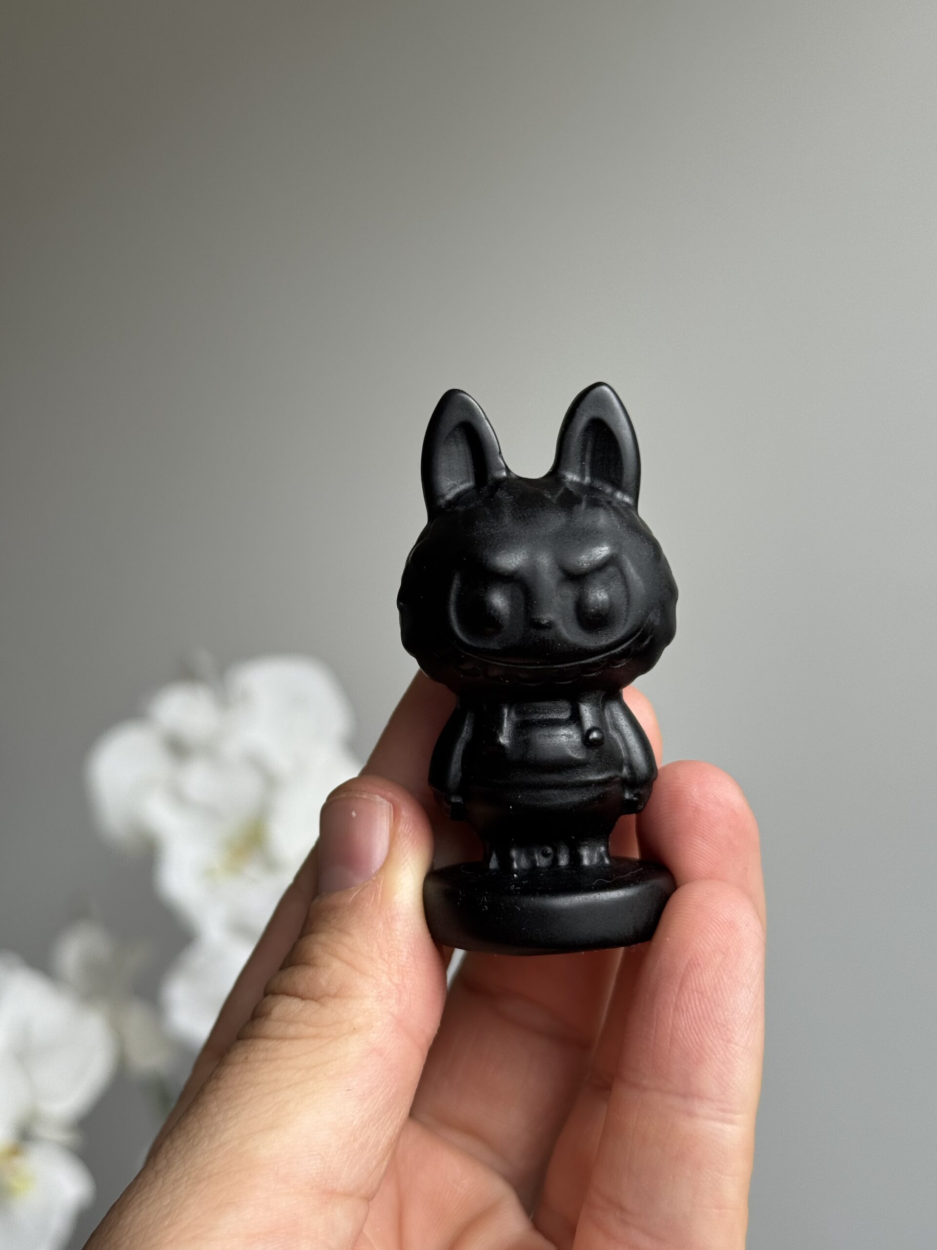 Deze schattige L-a-bubu carving is met de hand gemaakt van zwarte obsidiaan. Een uniek en speels beeldje voor verzamelaars of als bijzonder decoratief item. Perfect als cadeau of voor op je altaar of plankj
