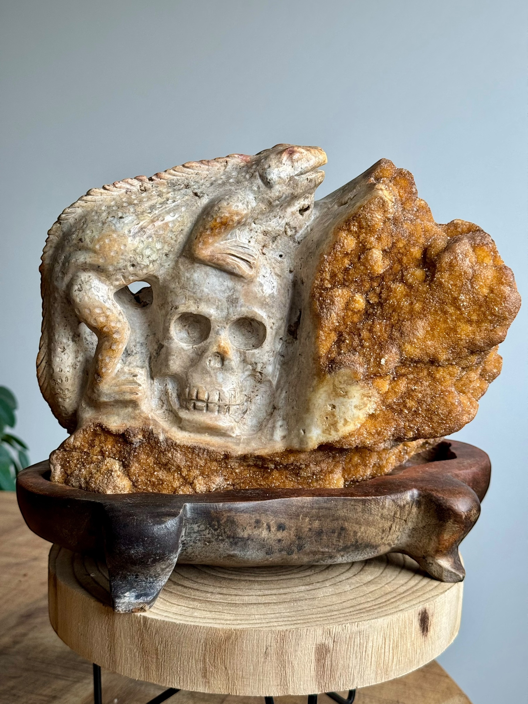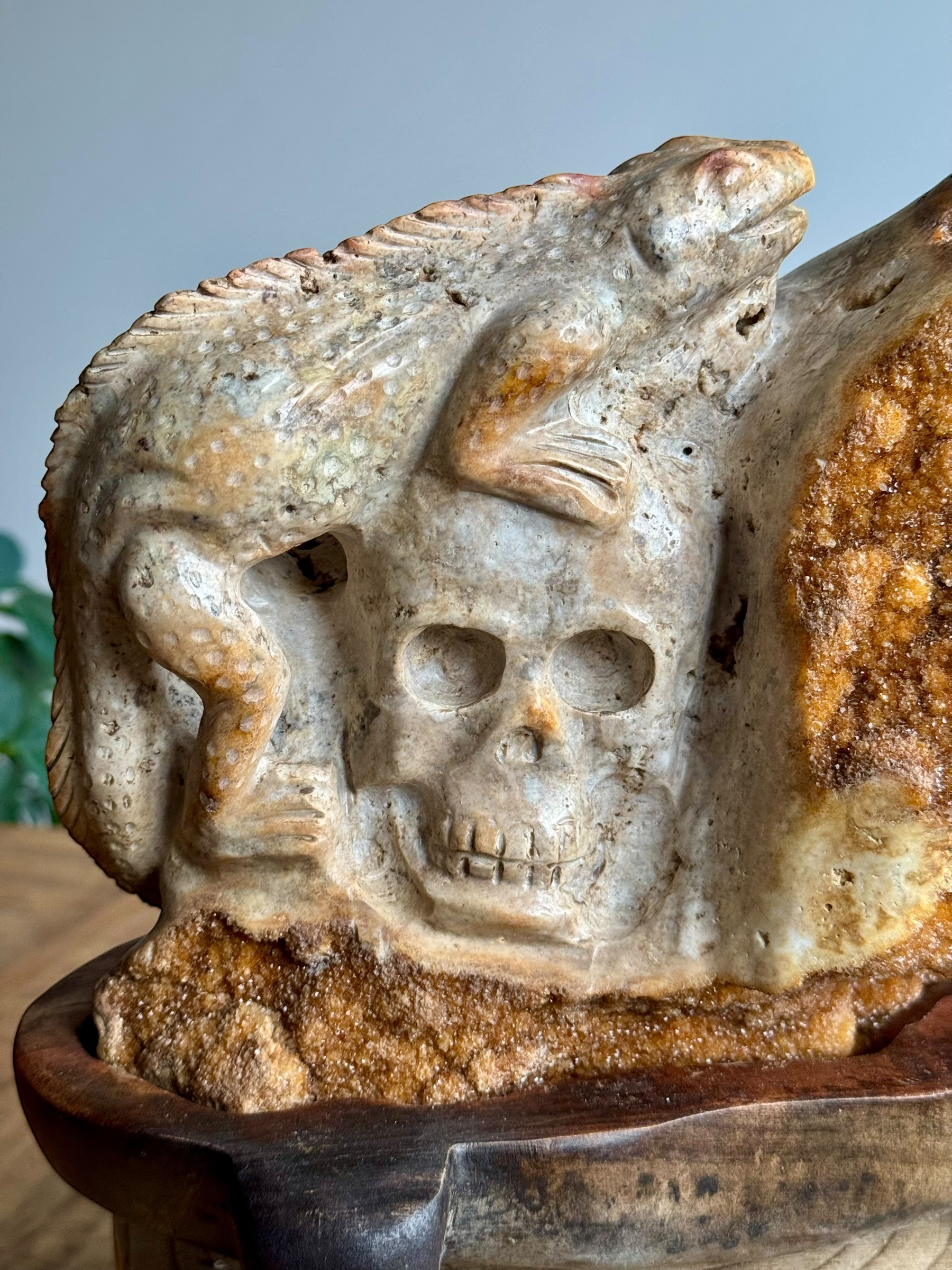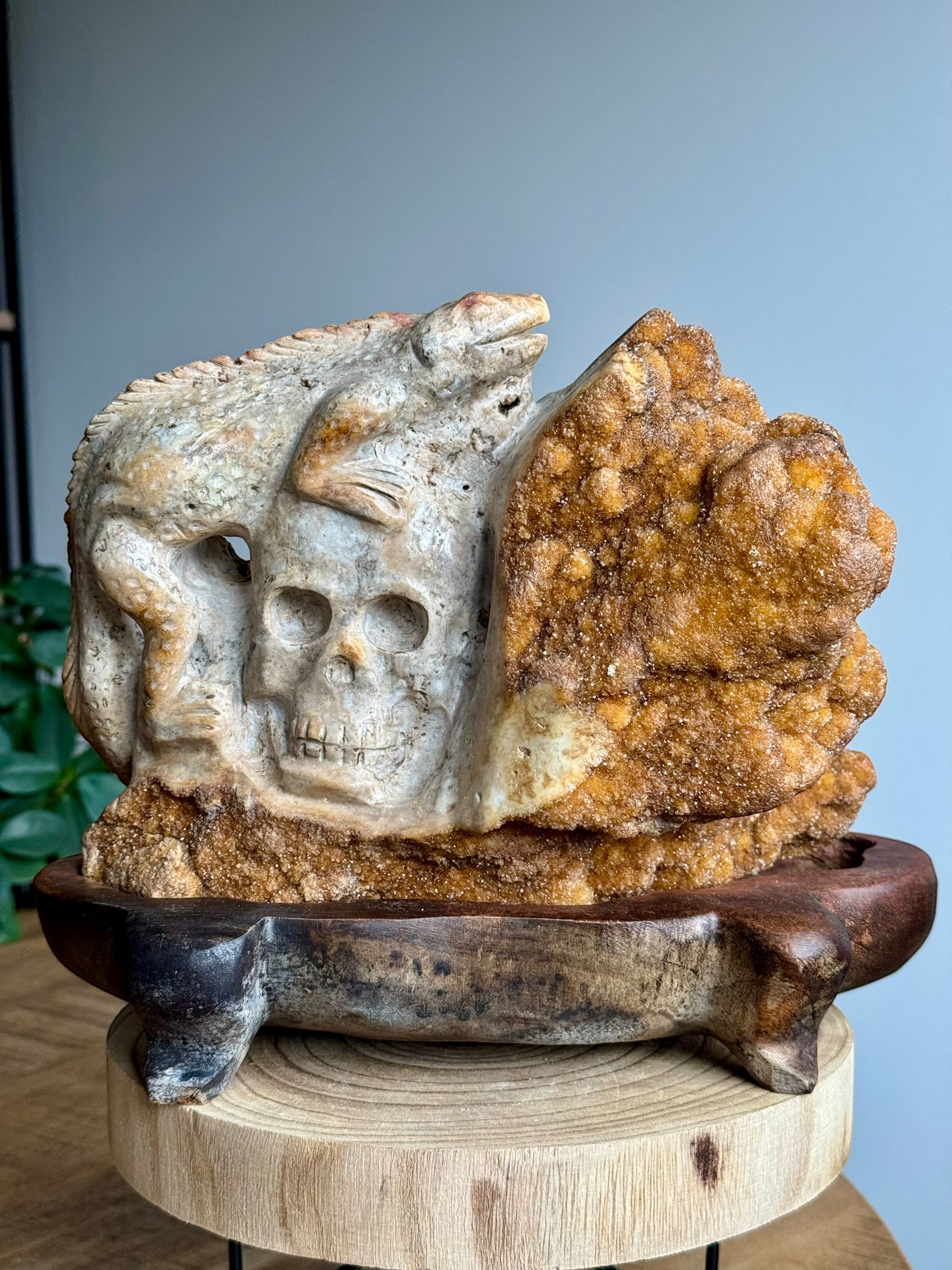 Ontdek de intrigerende schoonheid van deze prachtige chalcedoon carving, verrijkt met kwarts en goud/bruine kristallen. Dit bijzondere kunstwerk toont een gedetailleerde schedel met een leguaan die sierlijk bovenop het hoofd zit, wat het een opvallend en uniek stuk maakt. Het lijkt net alsof de leguaan over een rots loopt, wat een extra dynamiek en levensechtheid aan het object toevoegt.