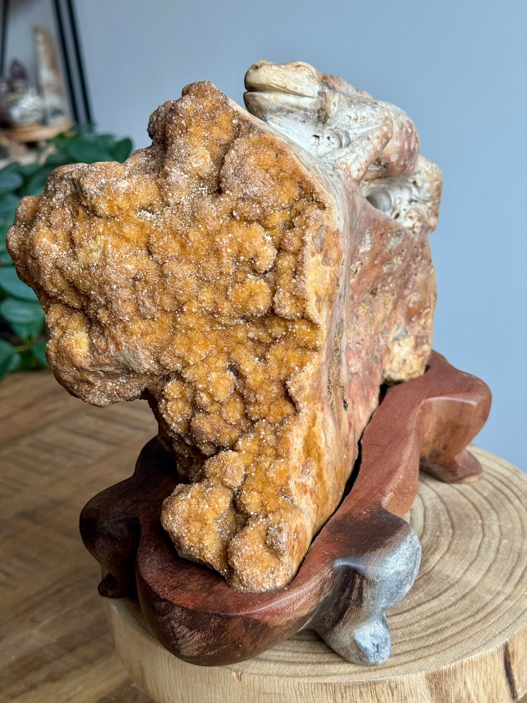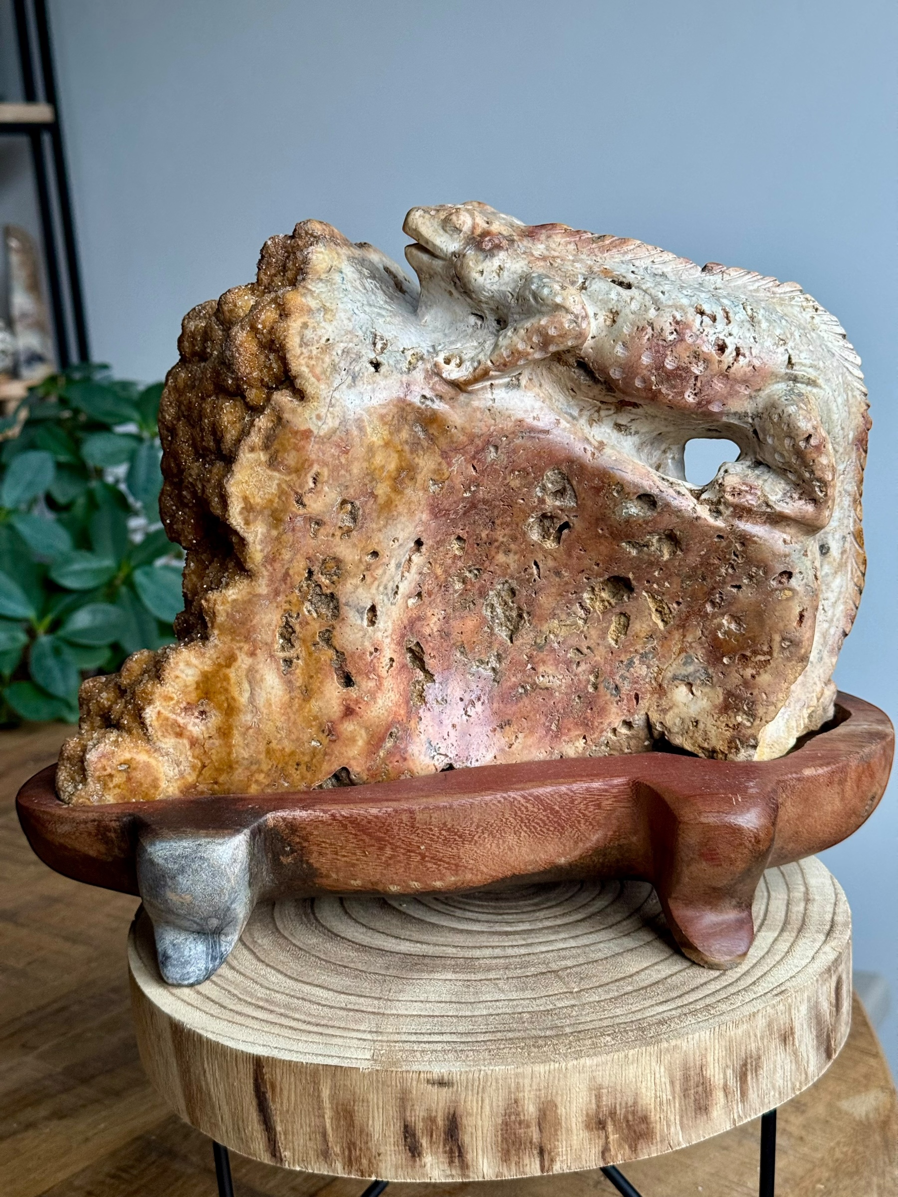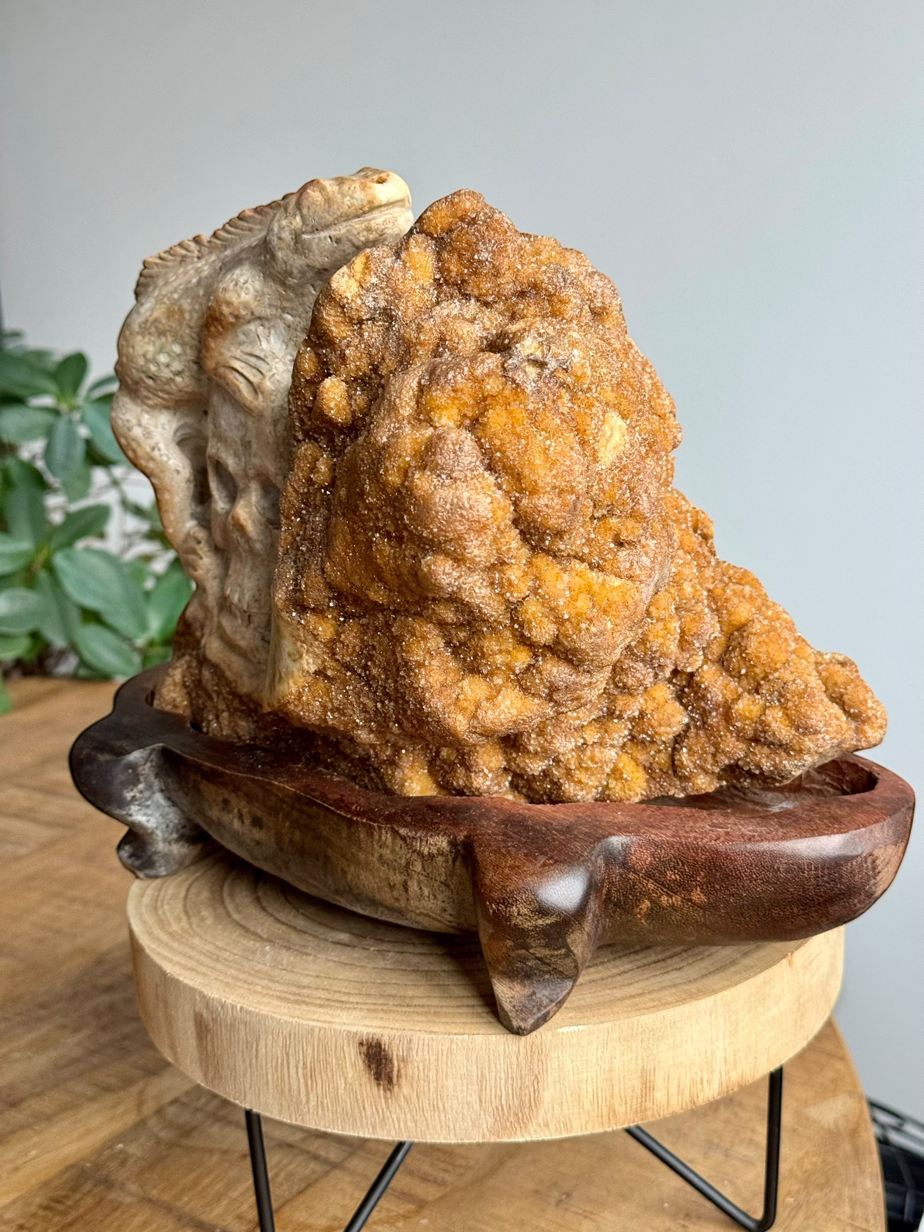 Ontdek de intrigerende schoonheid van deze prachtige chalcedoon carving, verrijkt met kwarts en goud/bruine kristallen. Dit bijzondere kunstwerk toont een gedetailleerde schedel met een leguaan die sierlijk bovenop het hoofd zit, wat het een opvallend en uniek stuk maakt. Het lijkt net alsof de leguaan over een rots loopt, wat een extra dynamiek en levensechtheid aan het object toevoegt.