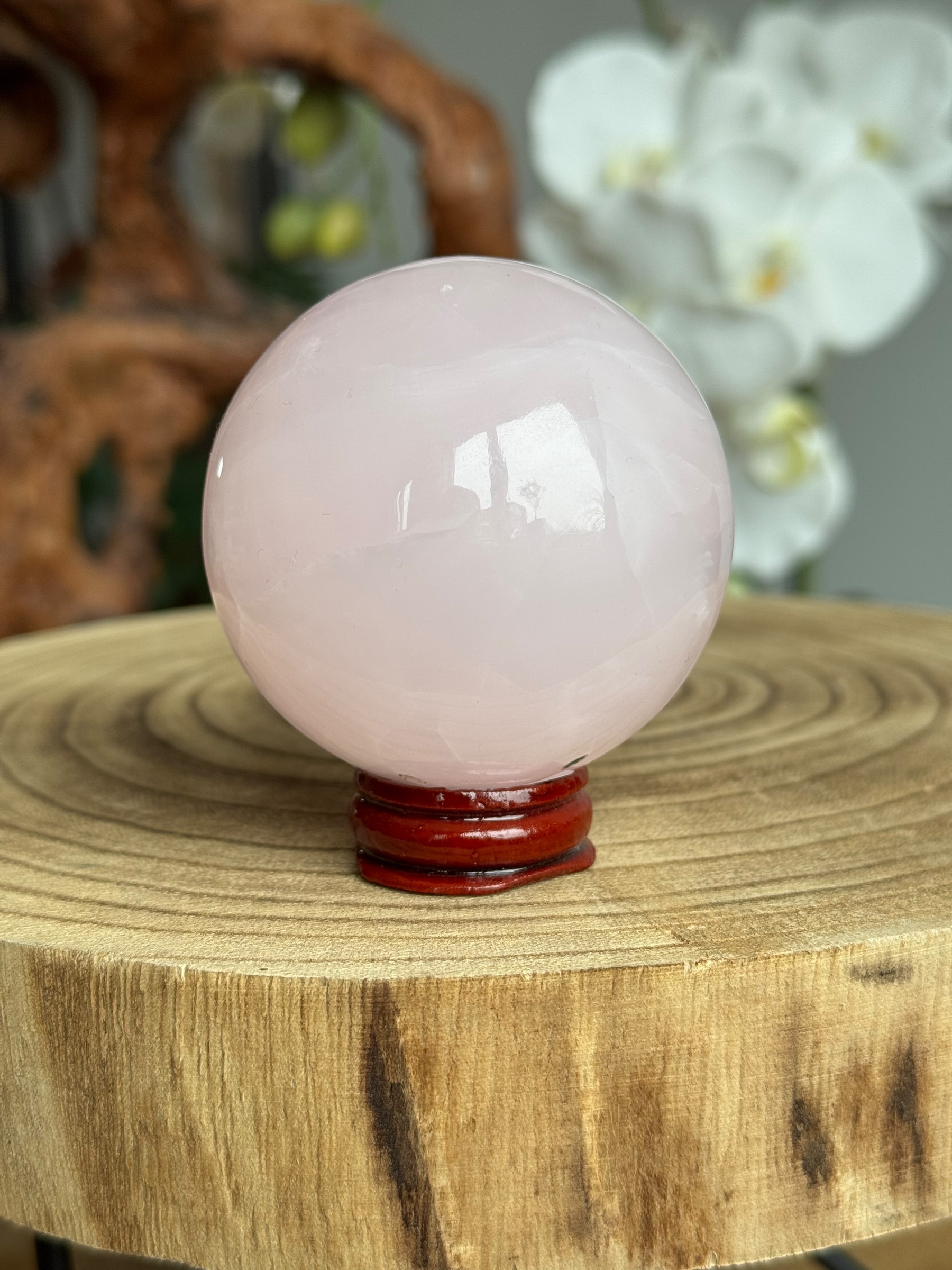 Ontdek de betoverende schoonheid van onze Mangano calciet bol. Deze natuurlijke edelsteen straalt een zachte, lichtroze kleur uit.