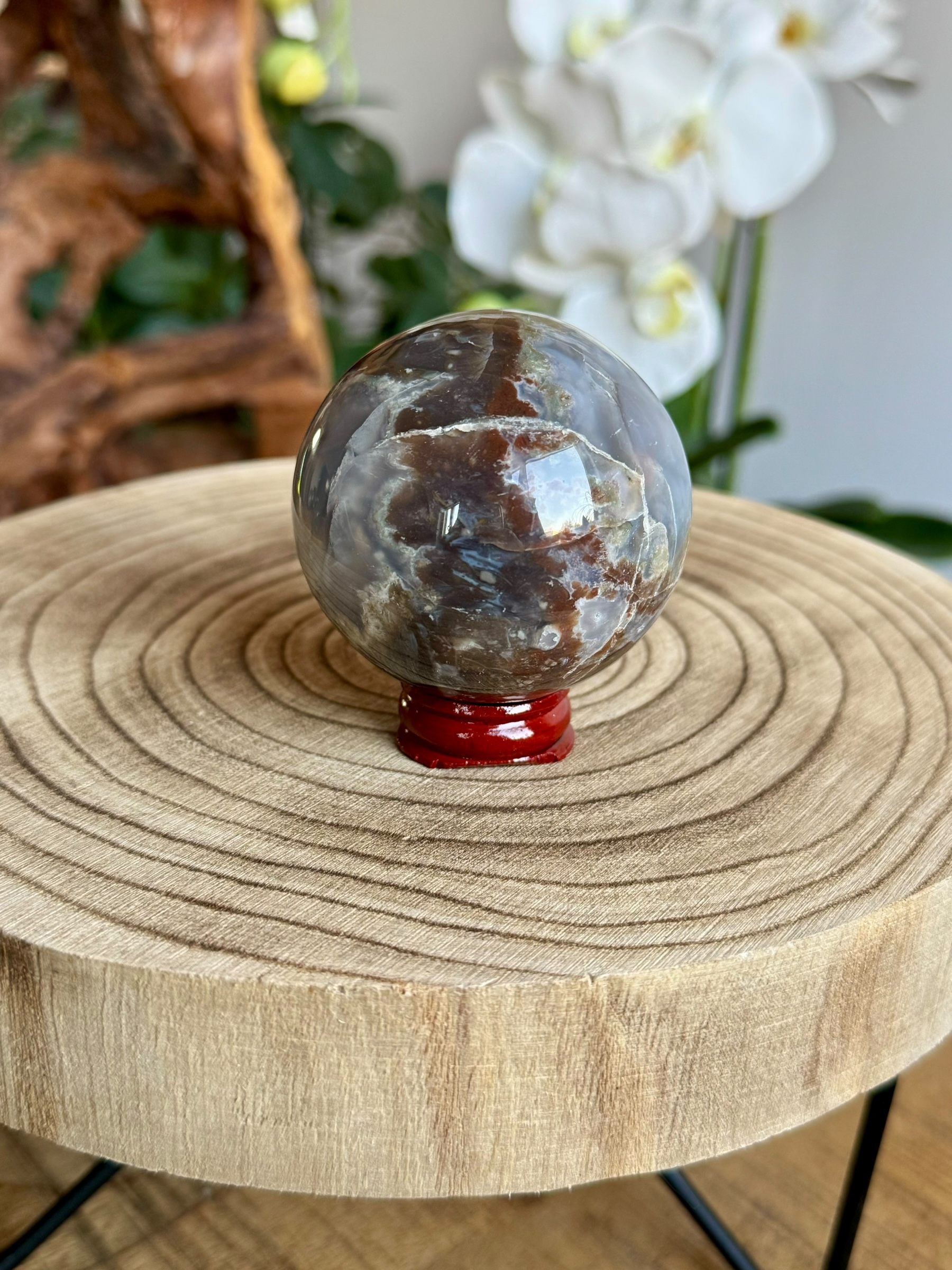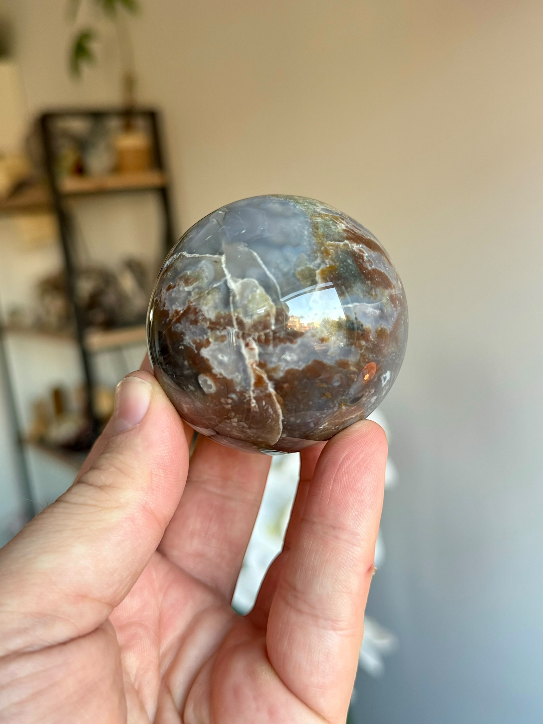 Deze prachtige mosagaat bol komt uit Indonesië en heeft een uitstraling die zich onderscheidt van de meer bekende varianten uit bijvoorbeeld Madagaskar. De unieke patronen en kleuren maken deze bol tot een echt bijzonder stuk.