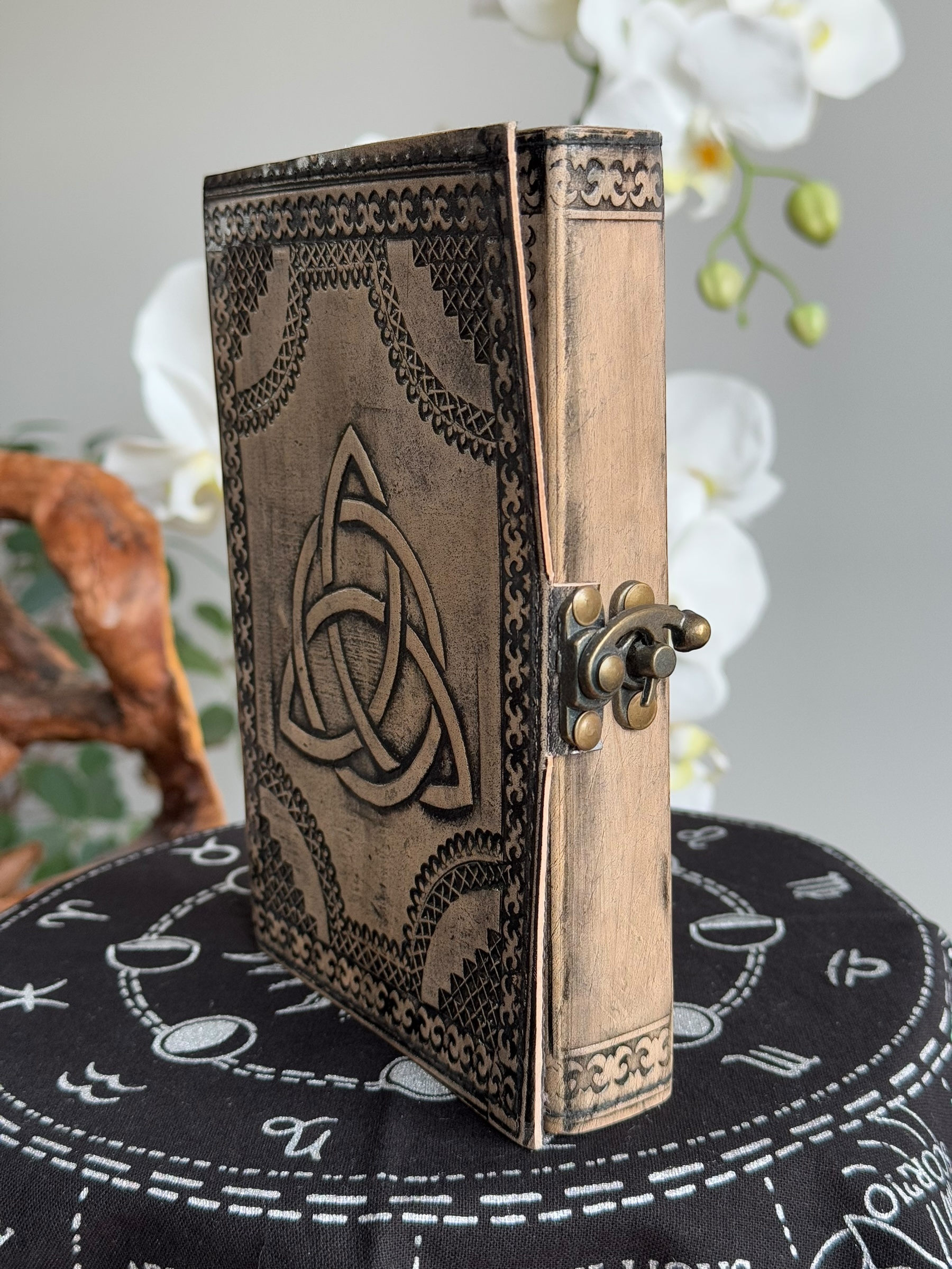 De Triquetra, omringd door een cirkel, is een krachtig symbool van oneindige verbinding, eeuwigheid en de drie-eenheid van lichaam, geest en ziel. De leren kaft biedt duurzaamheid en een luxe uitstraling, terwijl het compacte formaat ervoor zorgt dat je het gemakkelijk overal mee naartoe kunt nemen.