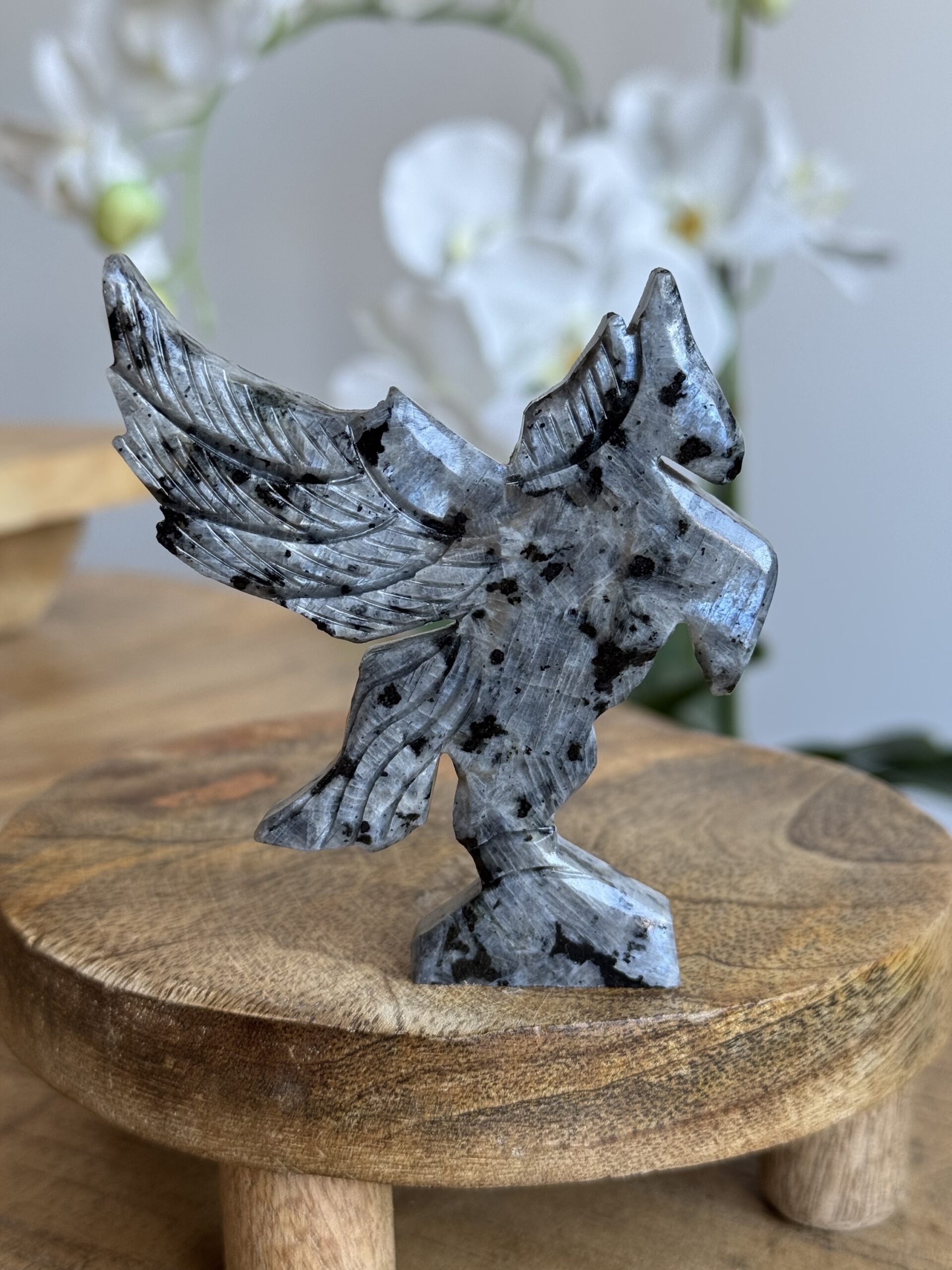 Deze schitterende Pegasus van larvikiet is een leuke aanvulling voor elke collectie. Gemaakt van prachtige larvikiet, straalt deze Pegasus een gevoel van magie en majesteit uit.