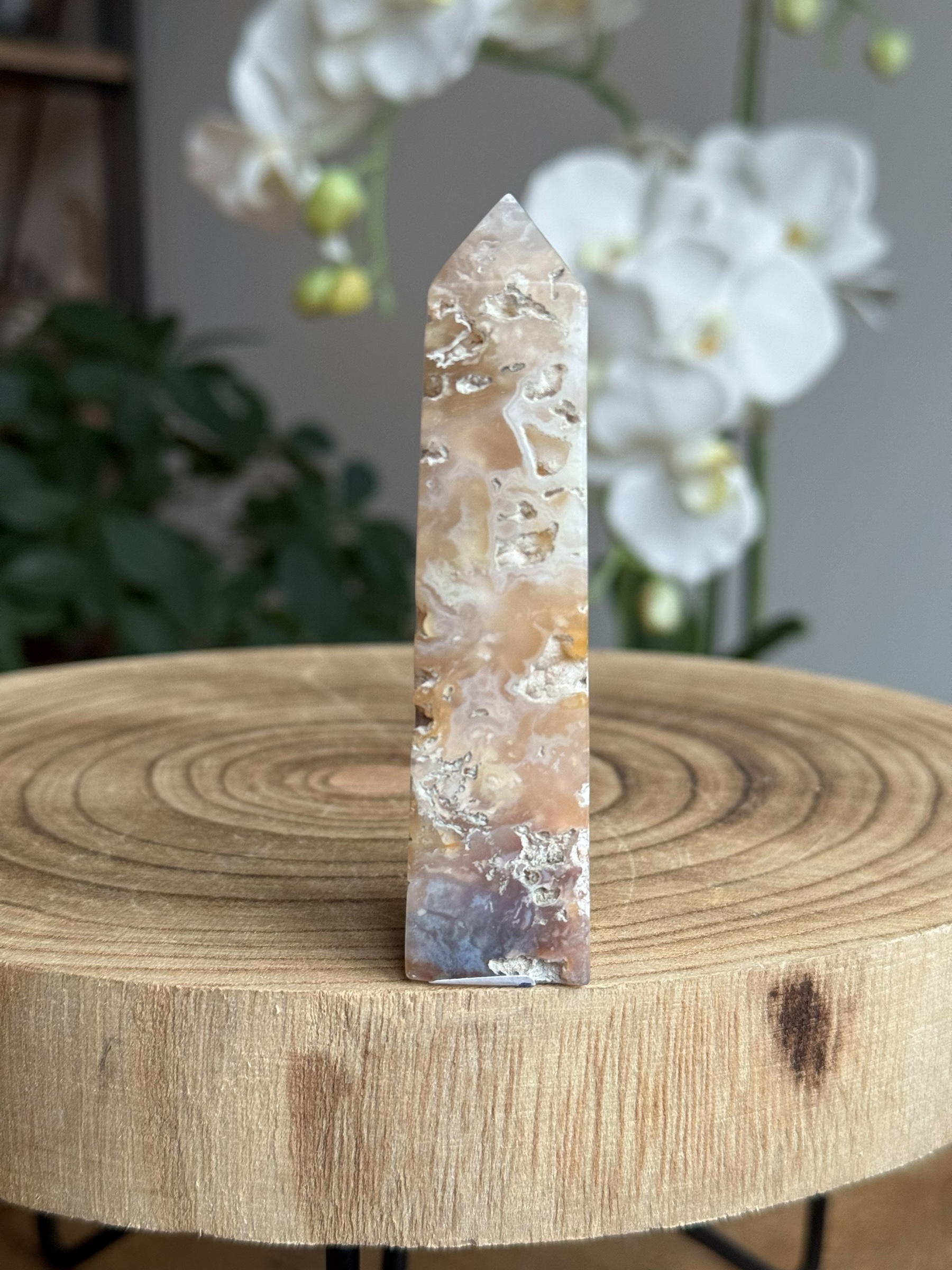 Deze prachtige pluimagaat toren is met veel zorg en vakmanschap geslepen uit de mooiste agaat, rechtstreeks afkomstig uit Indonesië. De toren heeft een betoverende combinatie van kleuren, waaronder wit, zwart, roze en lichtgeel, wat het een uniek en fascinerend uiterlijk geeft.
