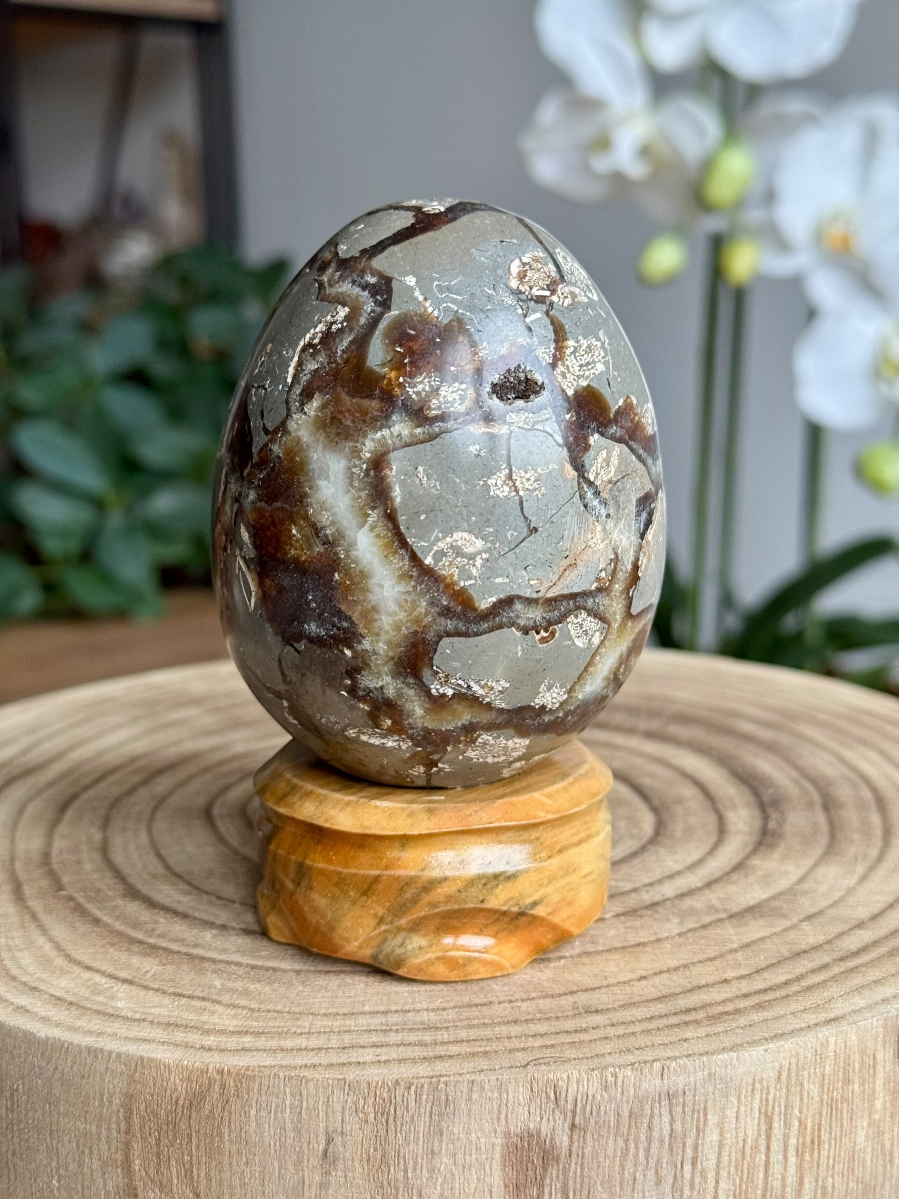 Septarie, ook bekend als drakenei, is een intrigerend mineraal dat ontstaat wanneer sedimenten van klei, kalksteen en andere mineralen zich ophopen in oude oceanische bodemlagen. Na verloop van miljoenen jaren barsten deze sedimenten open en vullen zich met calciet, aragoniet en soms bariet, wat zorgt voor de mooie patronen en kristalformaties die we zien in septarie.
