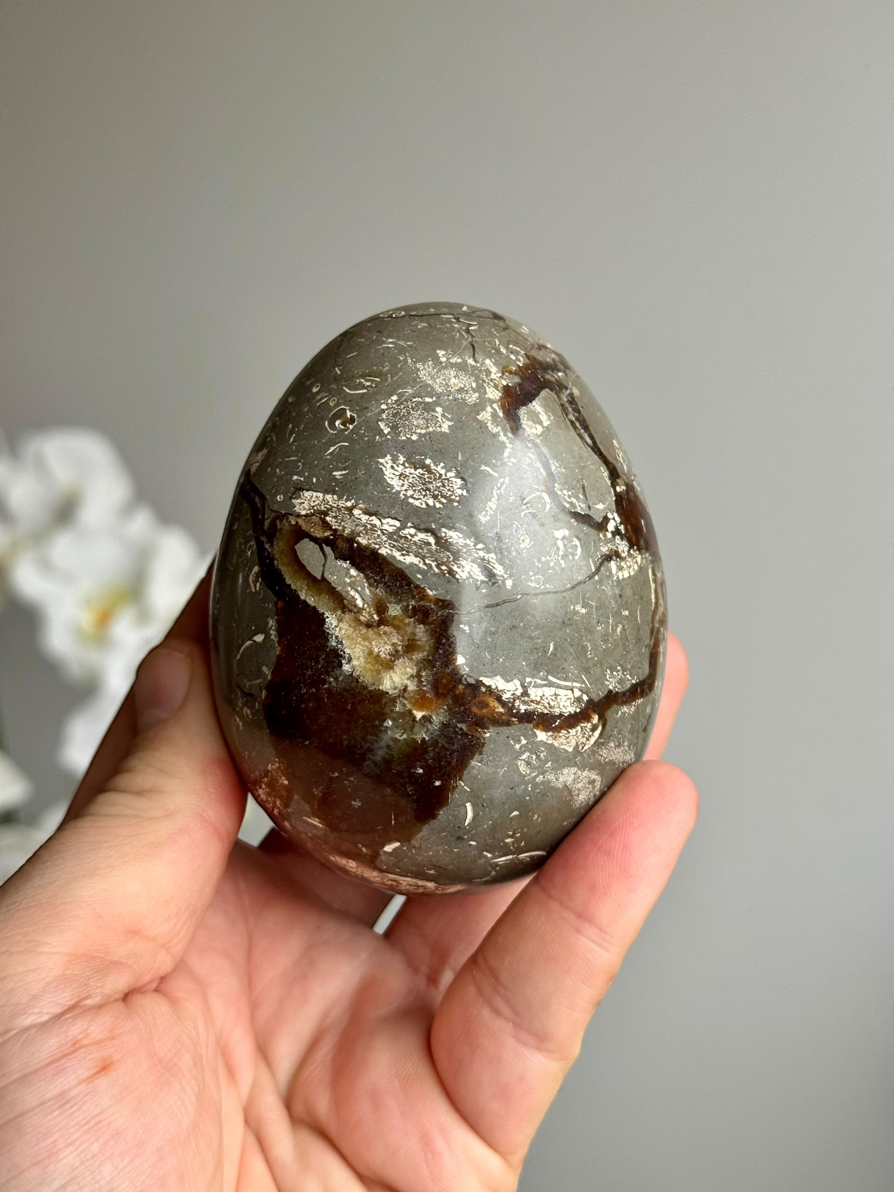 Deze prachtige septarie is net even anders dan je wellicht gewend bent uit Madagaskar of andere locaties. Deze unieke steen komt uit Indonesië en zit vol met kleine fossielen, wat het een bijzonder en boeiend stuk maakt.