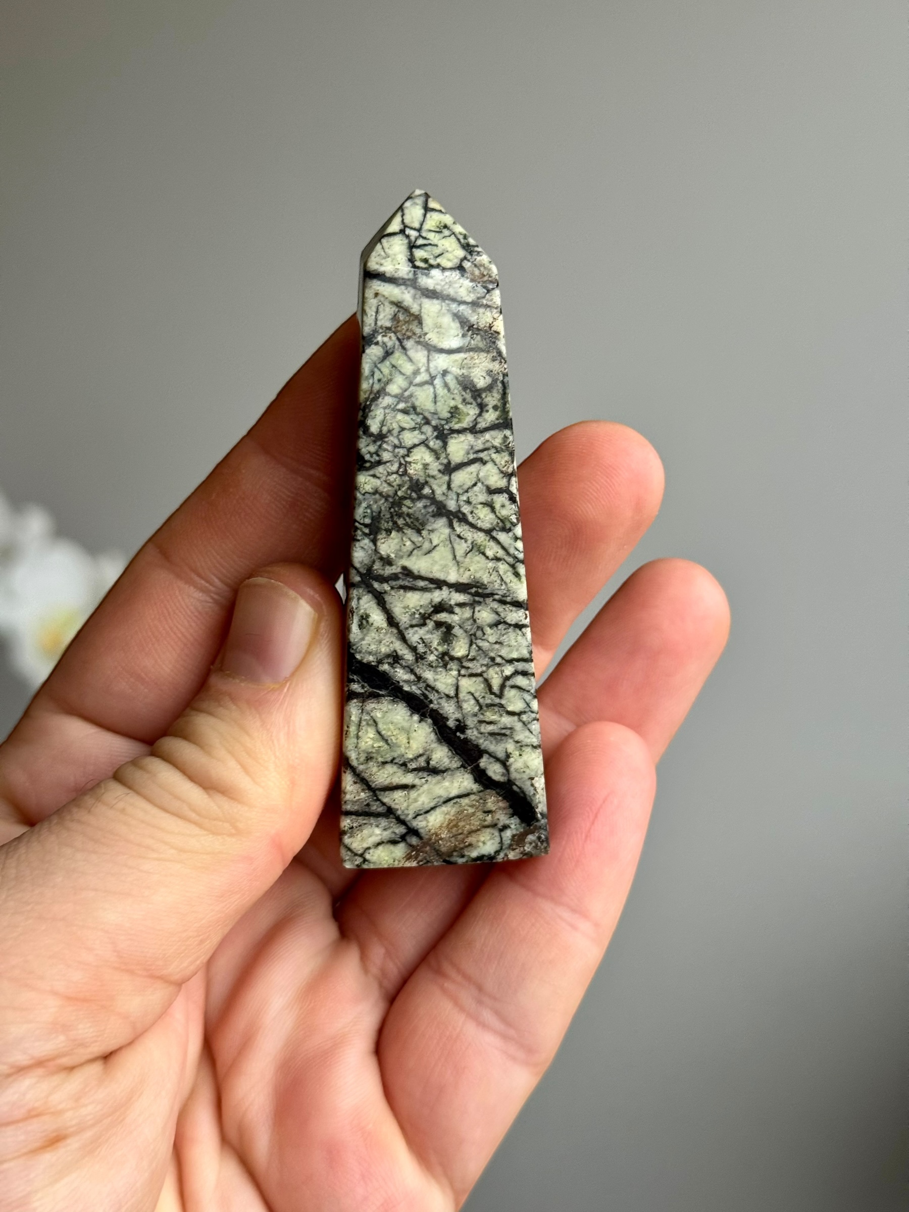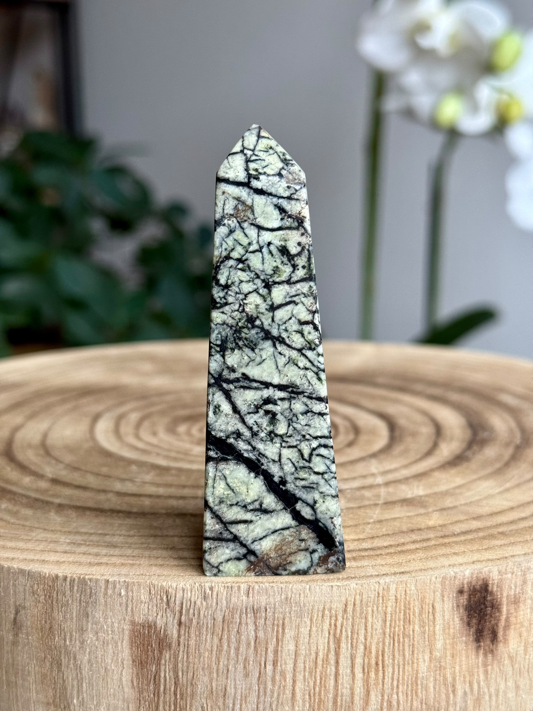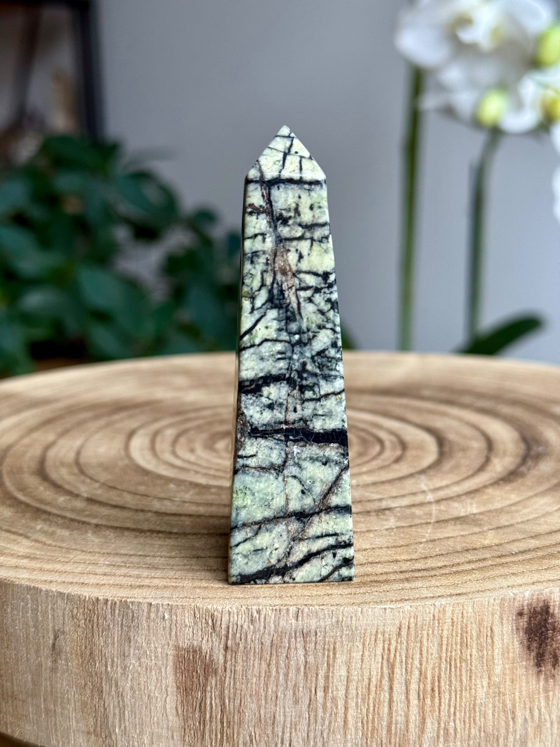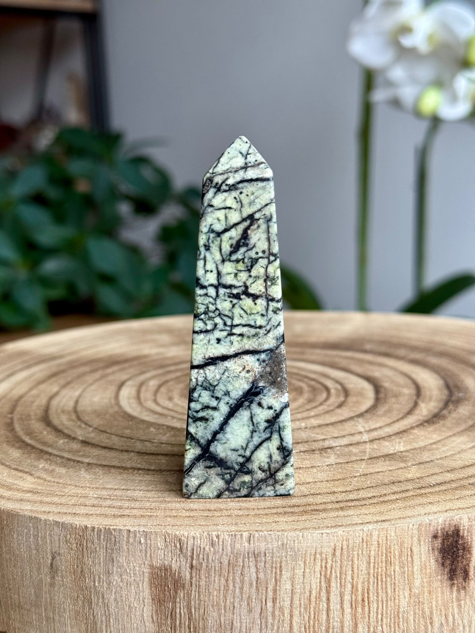 De combinatie van de zacht groene tinten met de kenmerkende zwarte lijnen maakt deze rutielserpentijn toren niet alleen visueel aantrekkelijk, maar ook een elegant decoratief stuk voor elke ruimte. Het voegt een vleugje natuurlijke schoonheid toe aan je interieur.