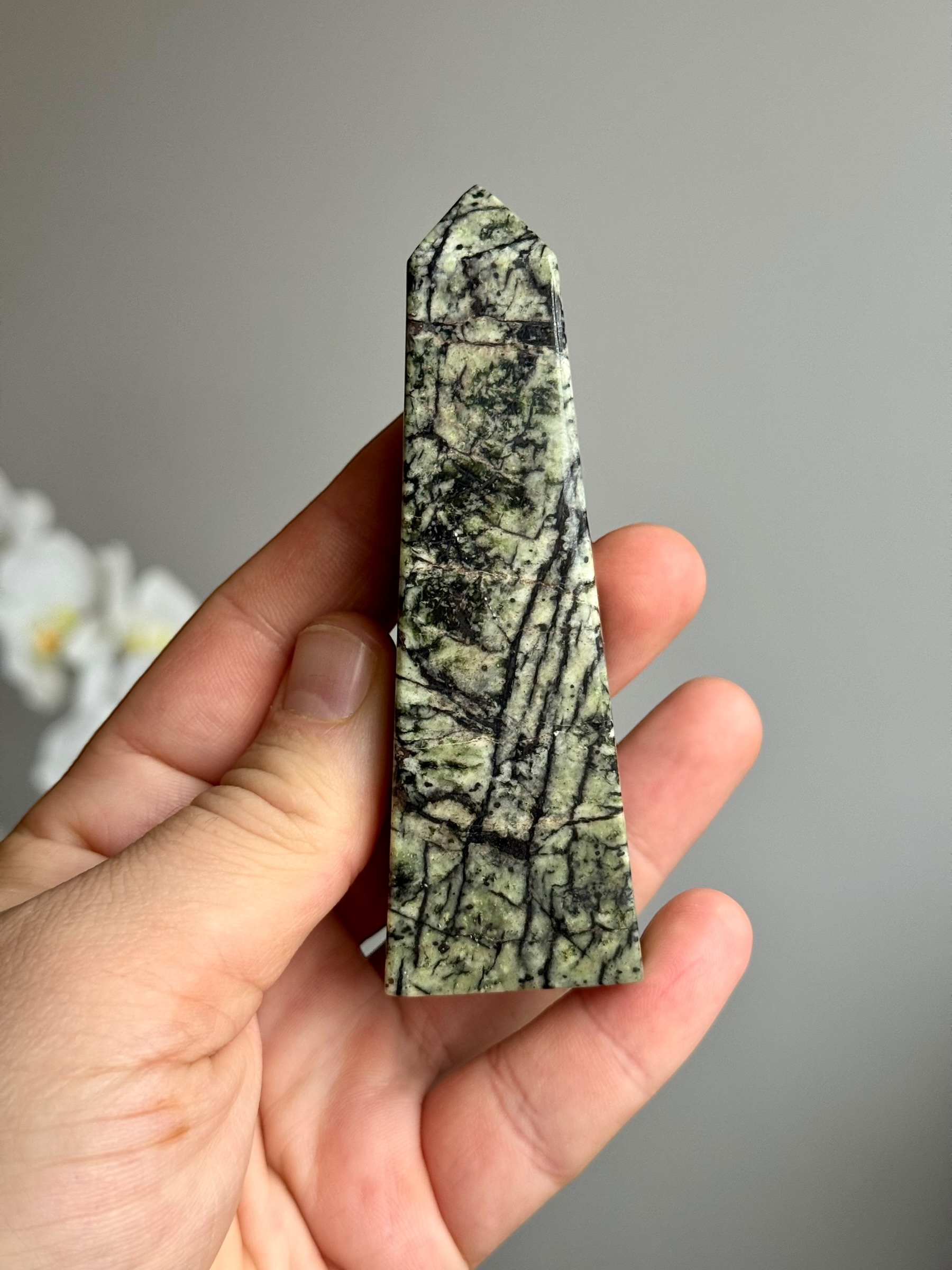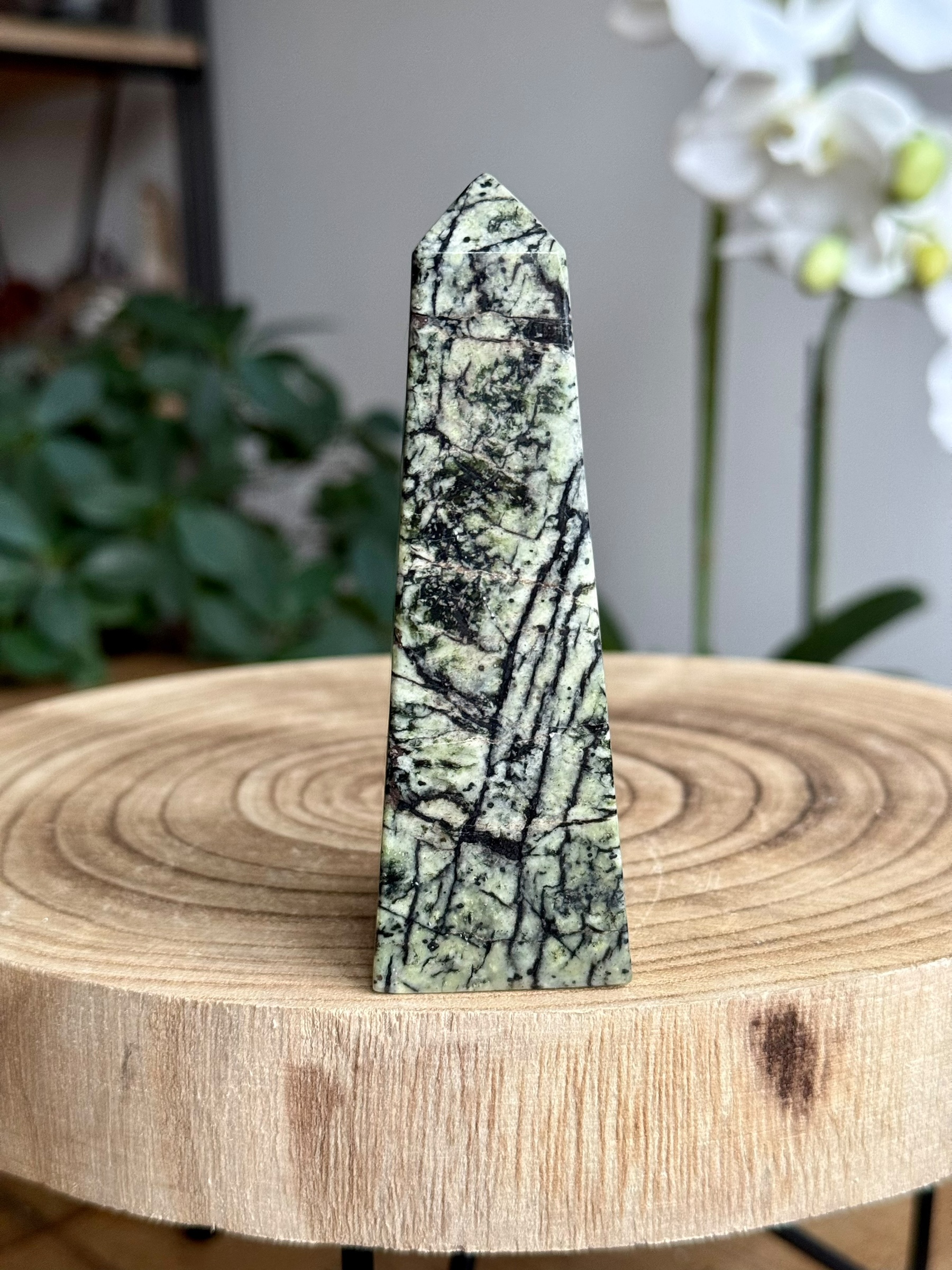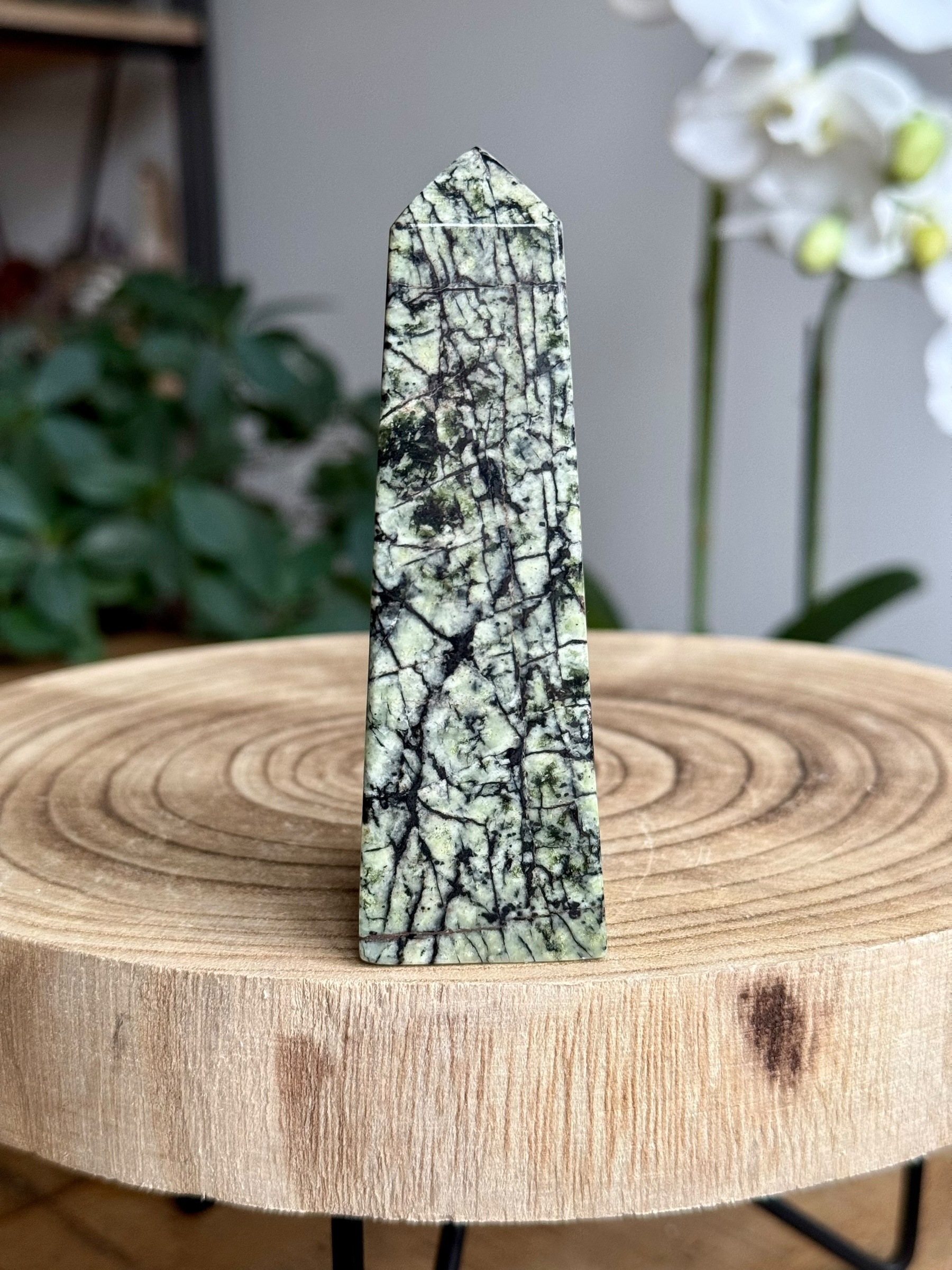 De combinatie van de zacht groene tinten met de kenmerkende zwarte lijnen maakt deze rutielserpentijn toren niet alleen visueel aantrekkelijk, maar ook een elegant decoratief stuk voor elke ruimte. Het voegt een vleugje natuurlijke schoonheid toe aan je interieur.