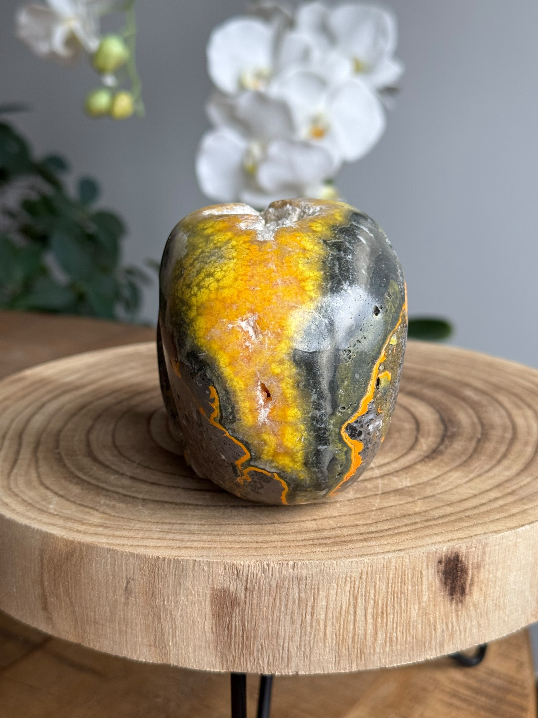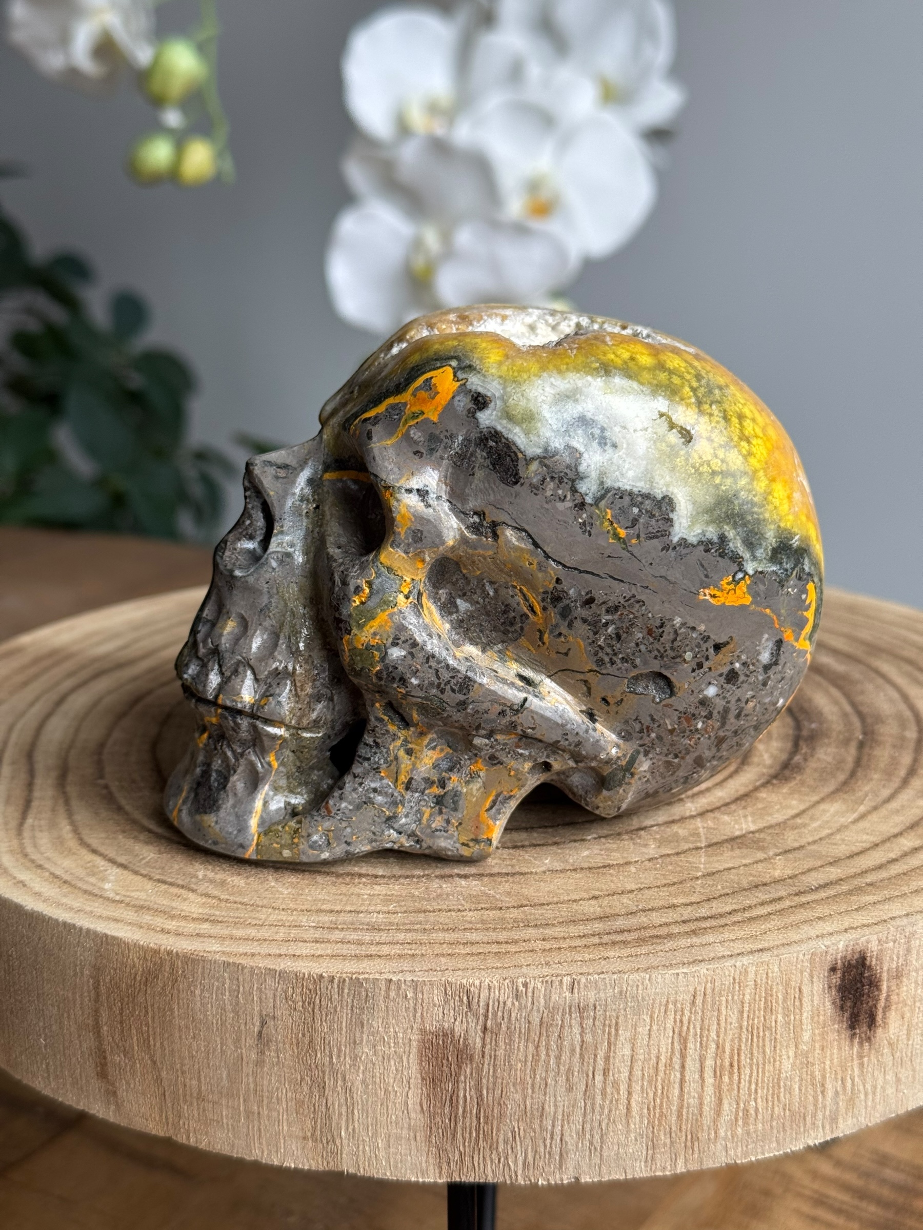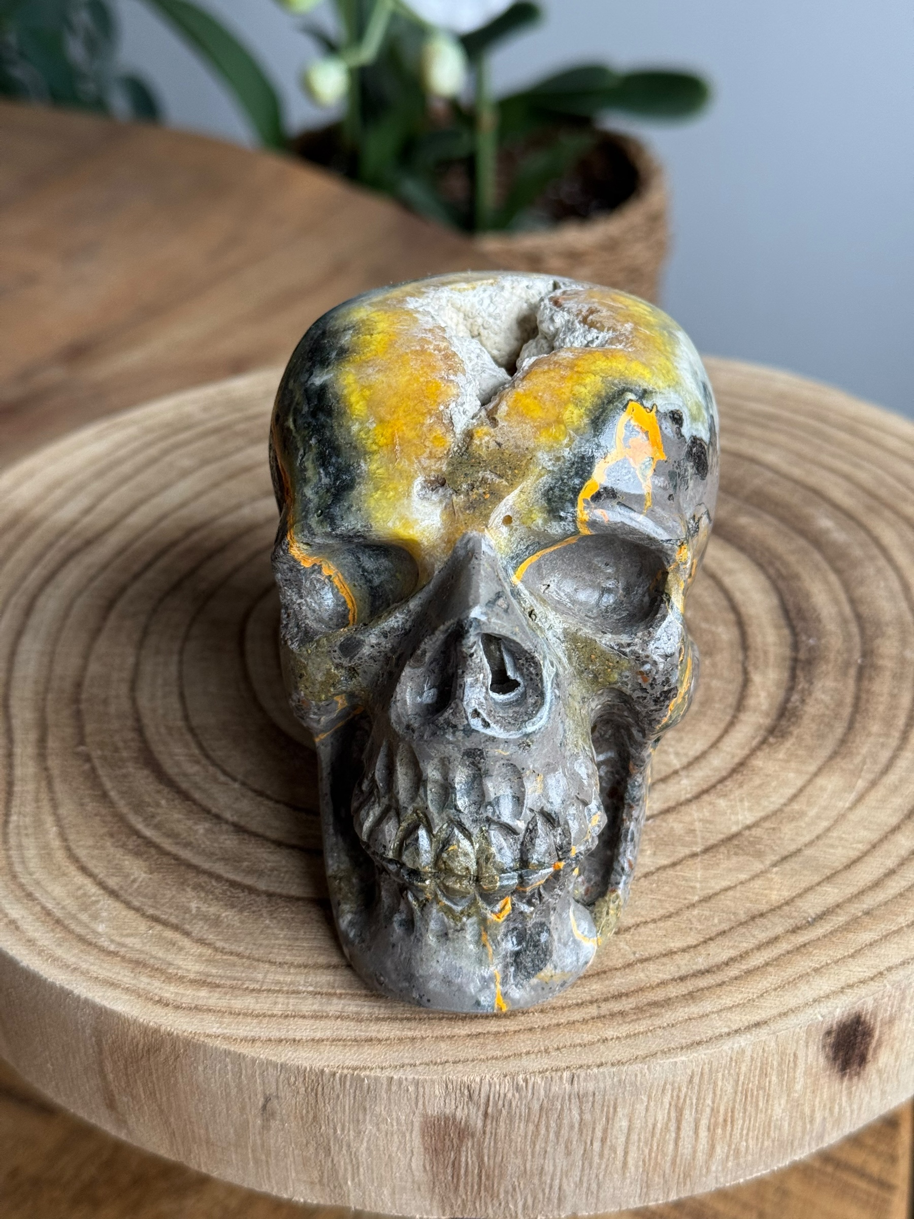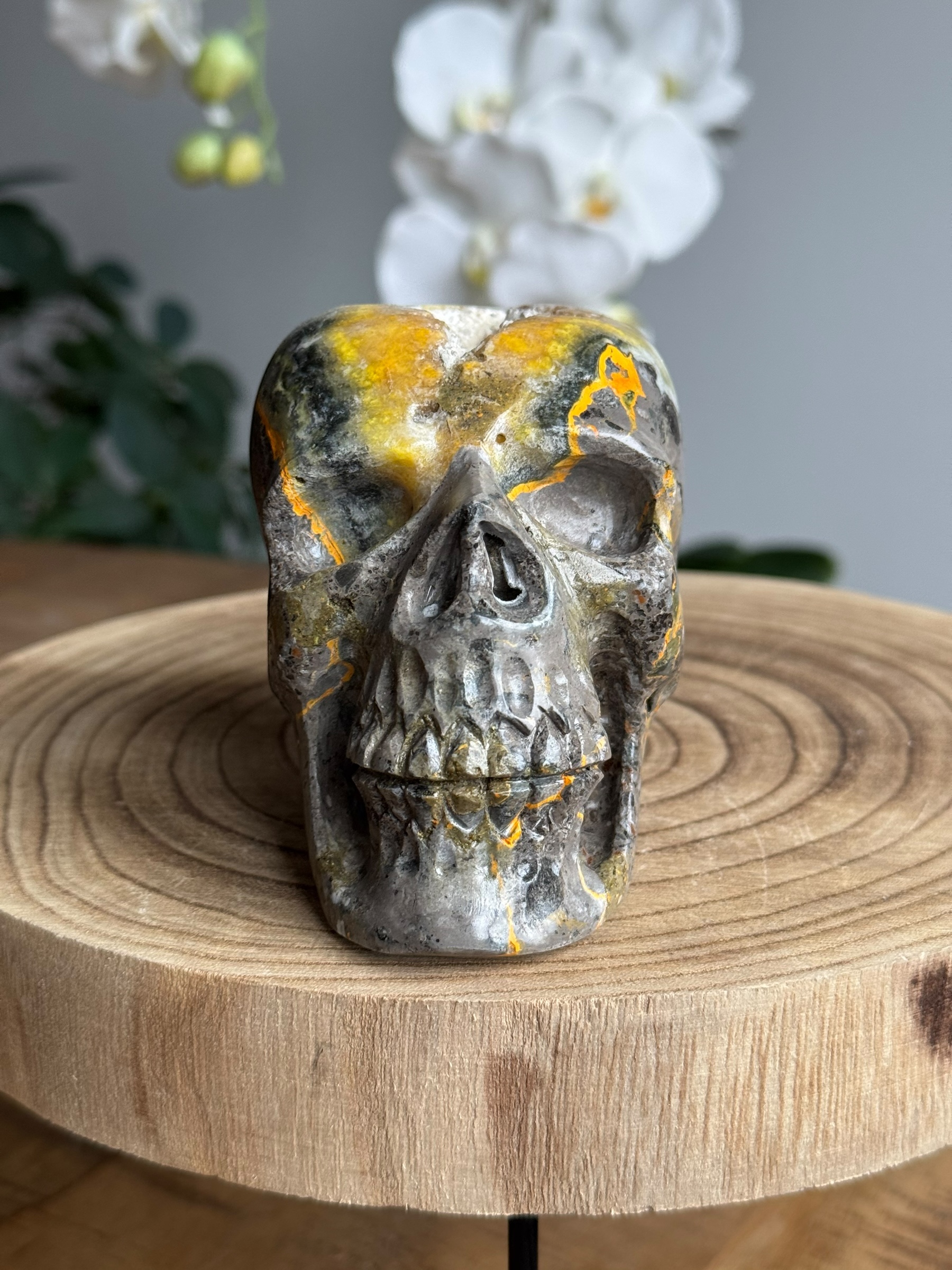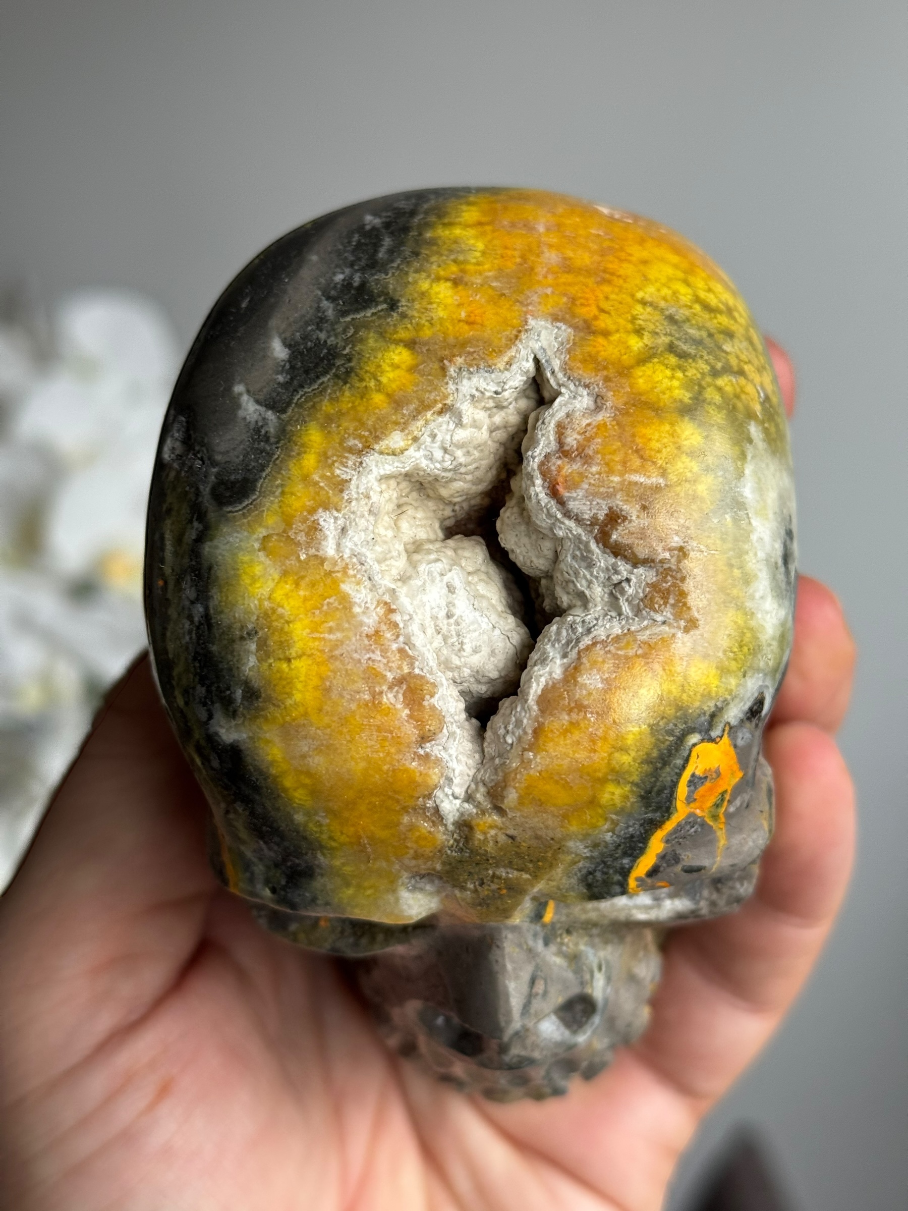 Deze bijzondere skull is gemaakt van bumblebee jaspis, een unieke steen bekend om zijn levendige gele en oranje patronen. Hoewel het vaak wordt aangeduid als “jaspis” is dit technisch gezien onjuist. Bumblebee jaspis is in feite een calciet en de naam is meer een handelsbenaming.