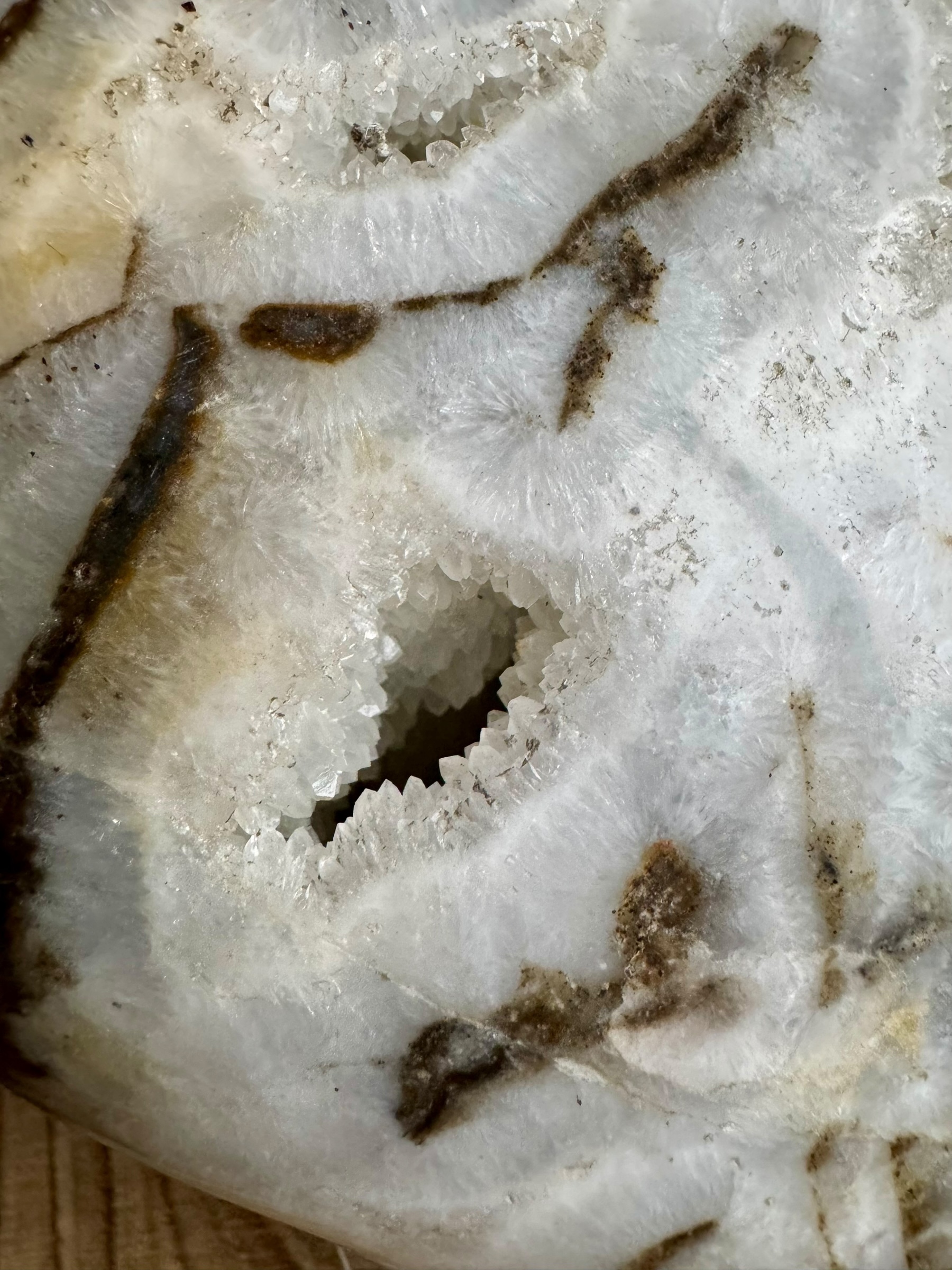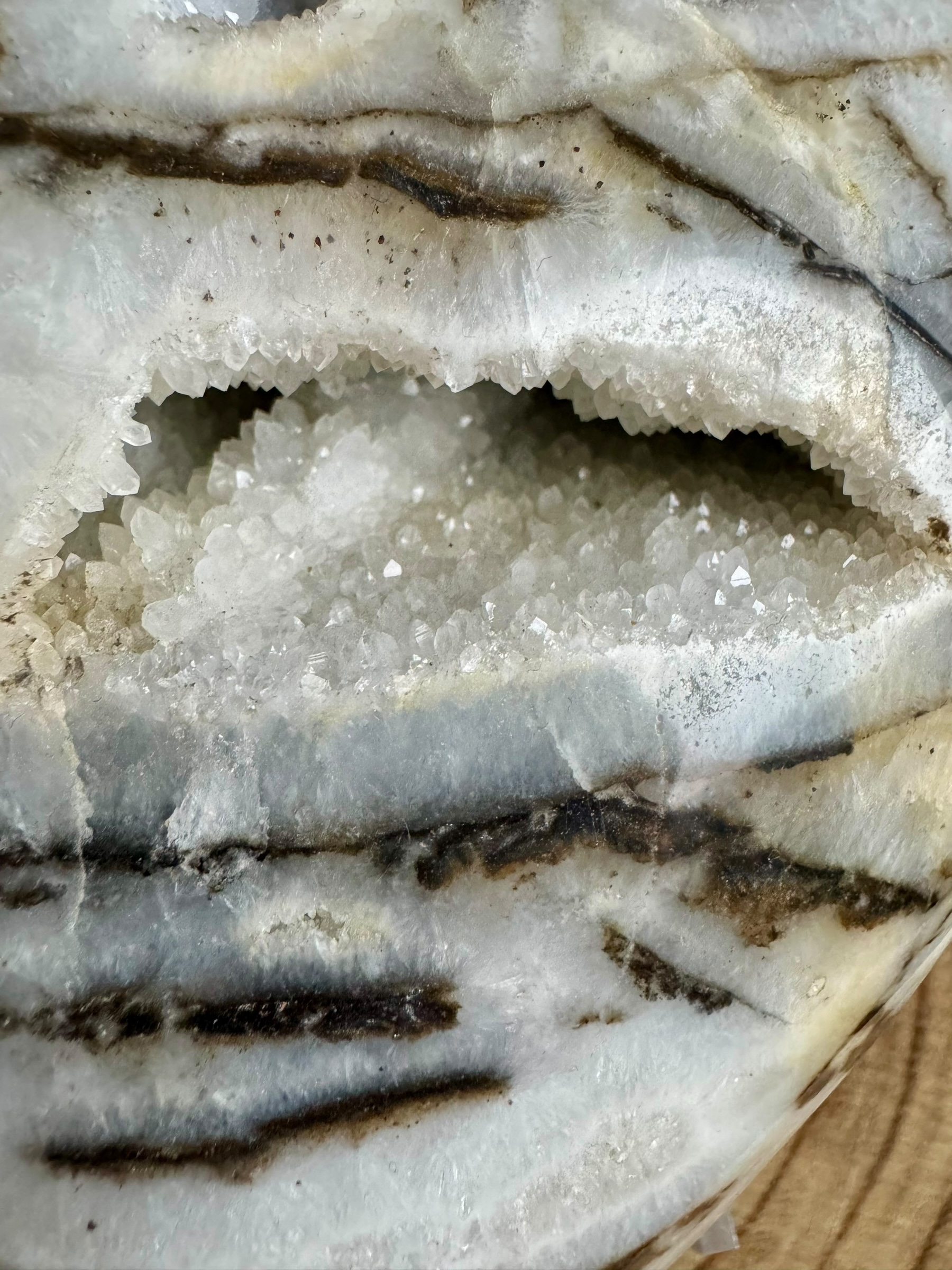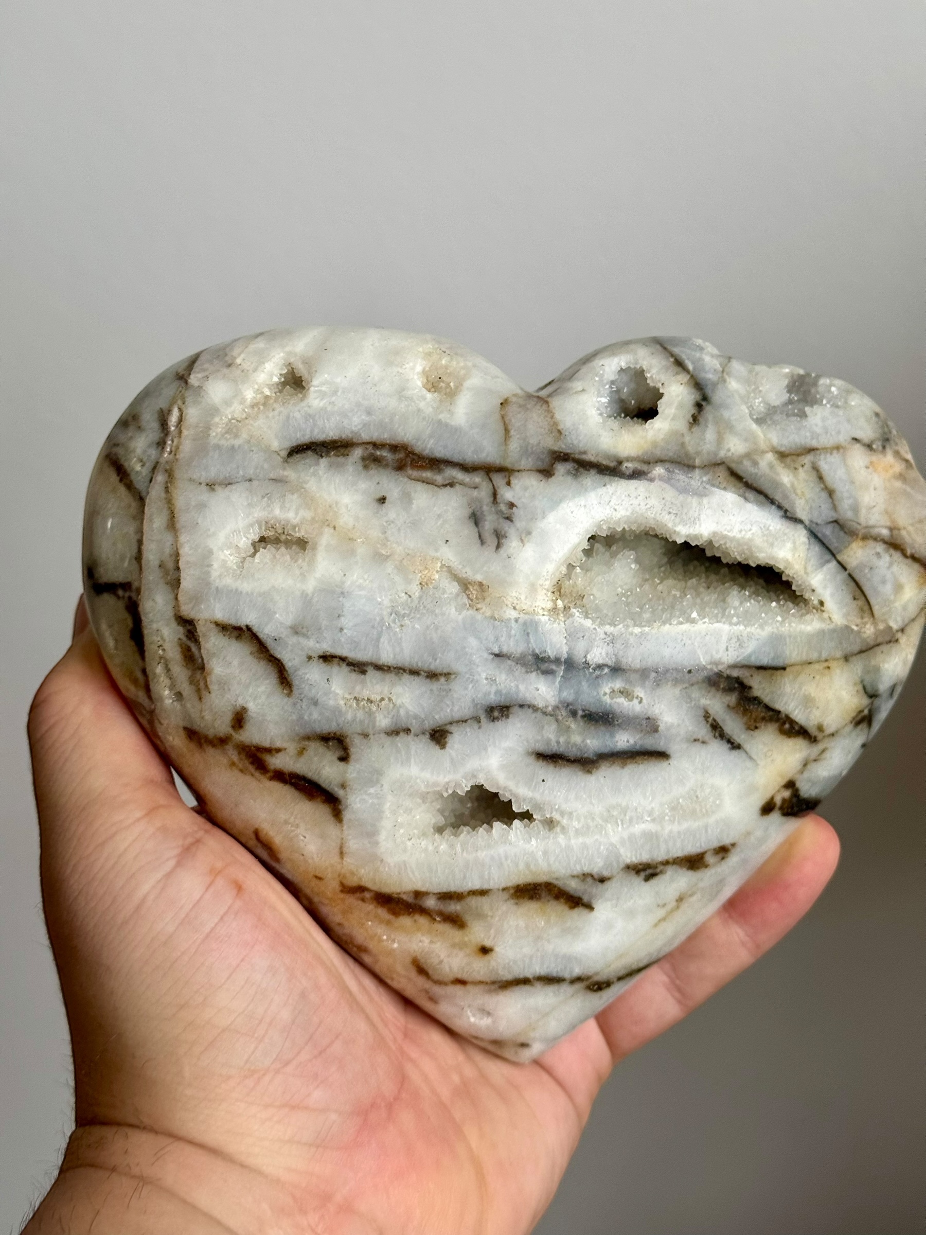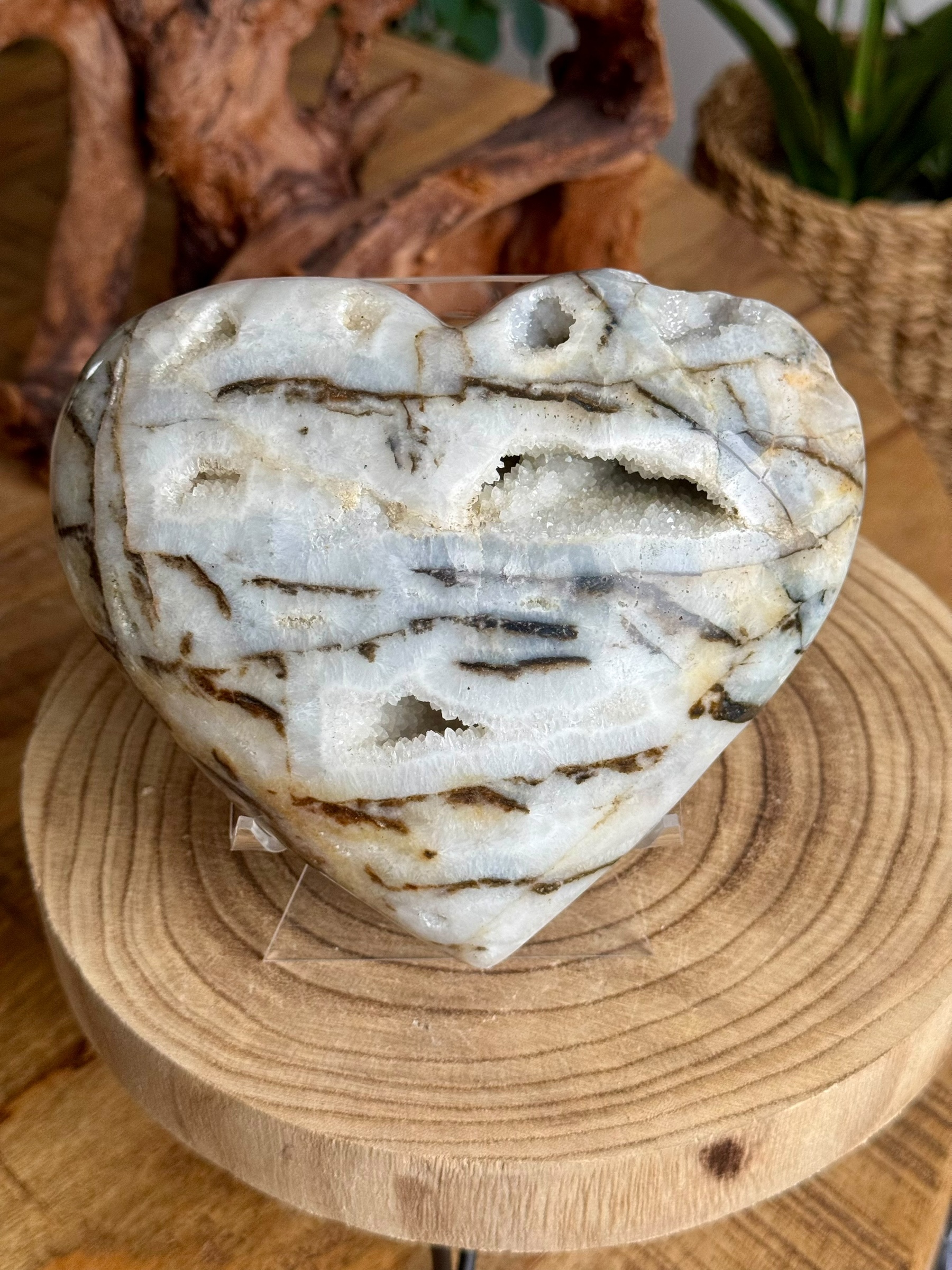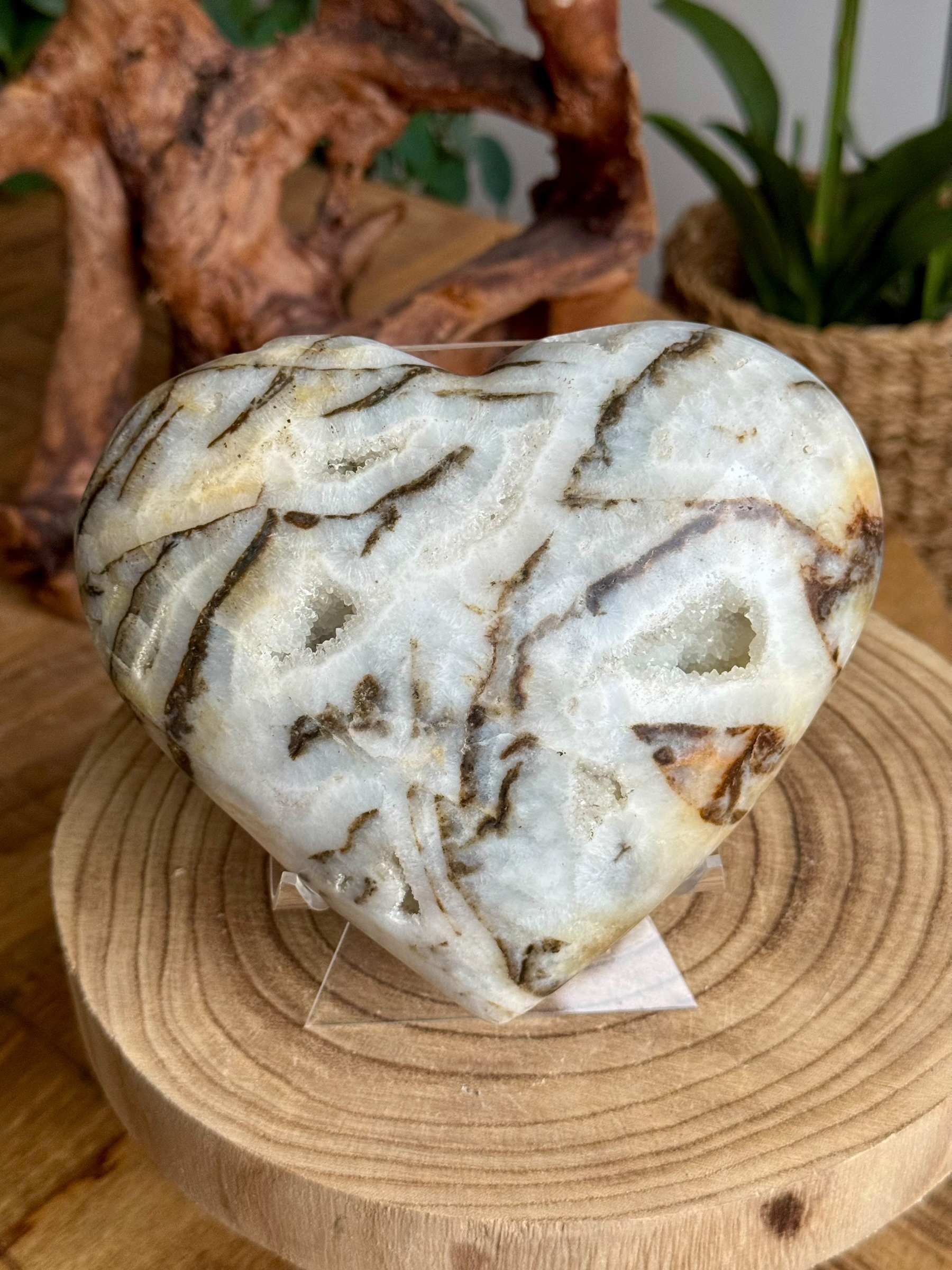 Zoals de naam al doet vermoeden, heeft dit hart een patroon dat doet denken aan de vacht van een zebra. Het is een prachtige combinatie van kwarts en zwarte jaspis, met hier en daar zelfs wat kristallisatie die het geheel een bijzondere uitstraling geeft. Deze steen trekt altijd veel bewonderaars en is een populair item bij liefhebbers.