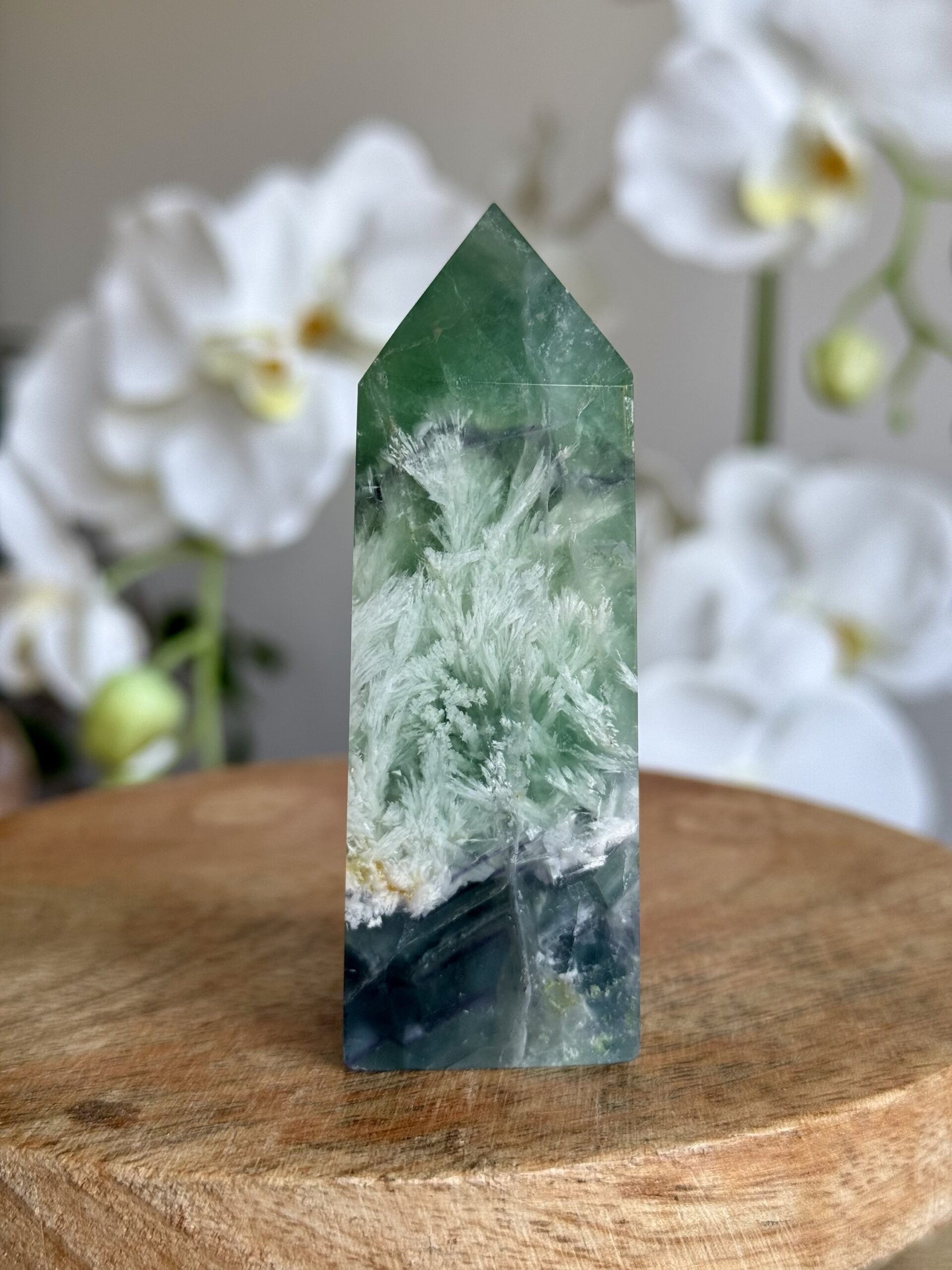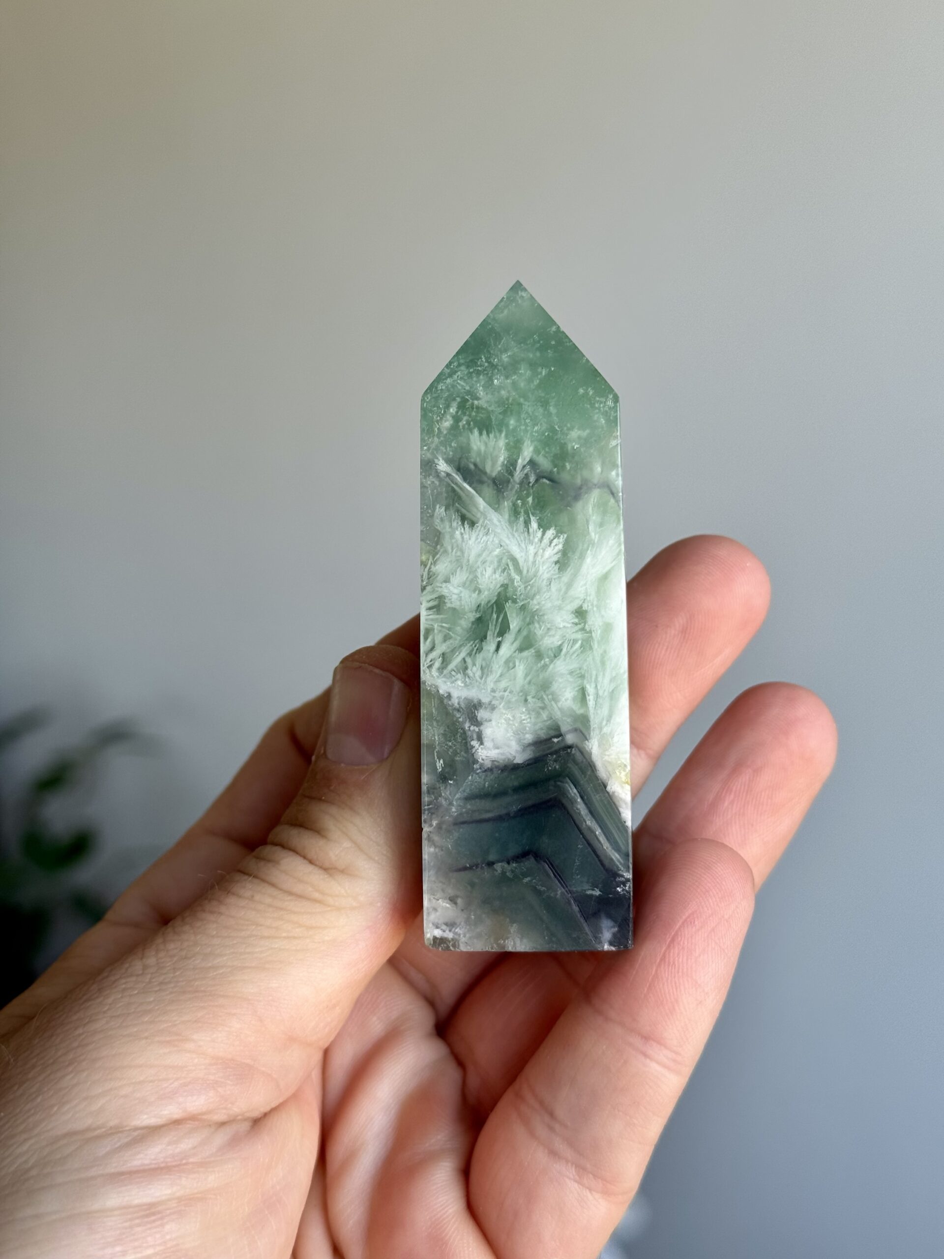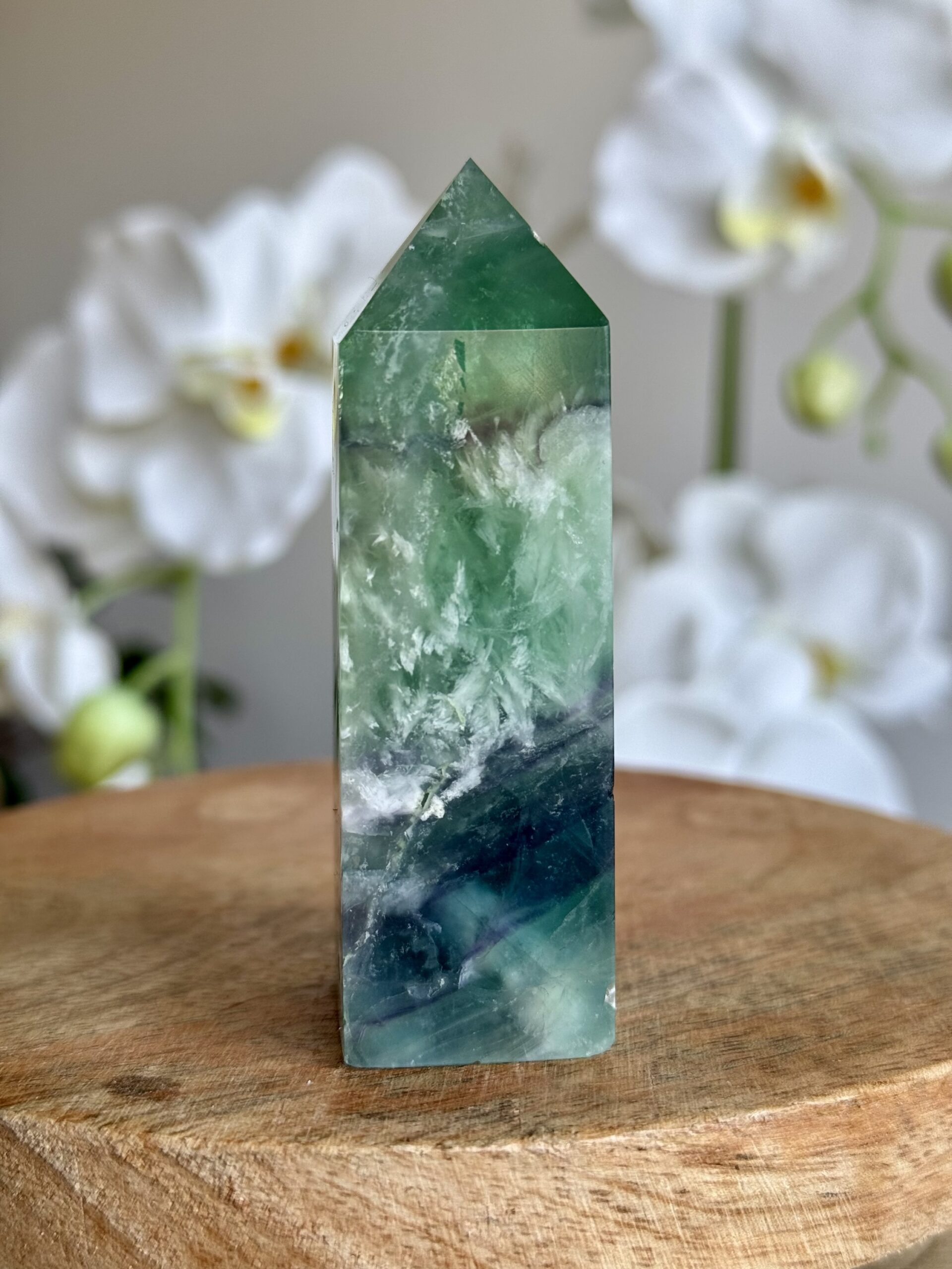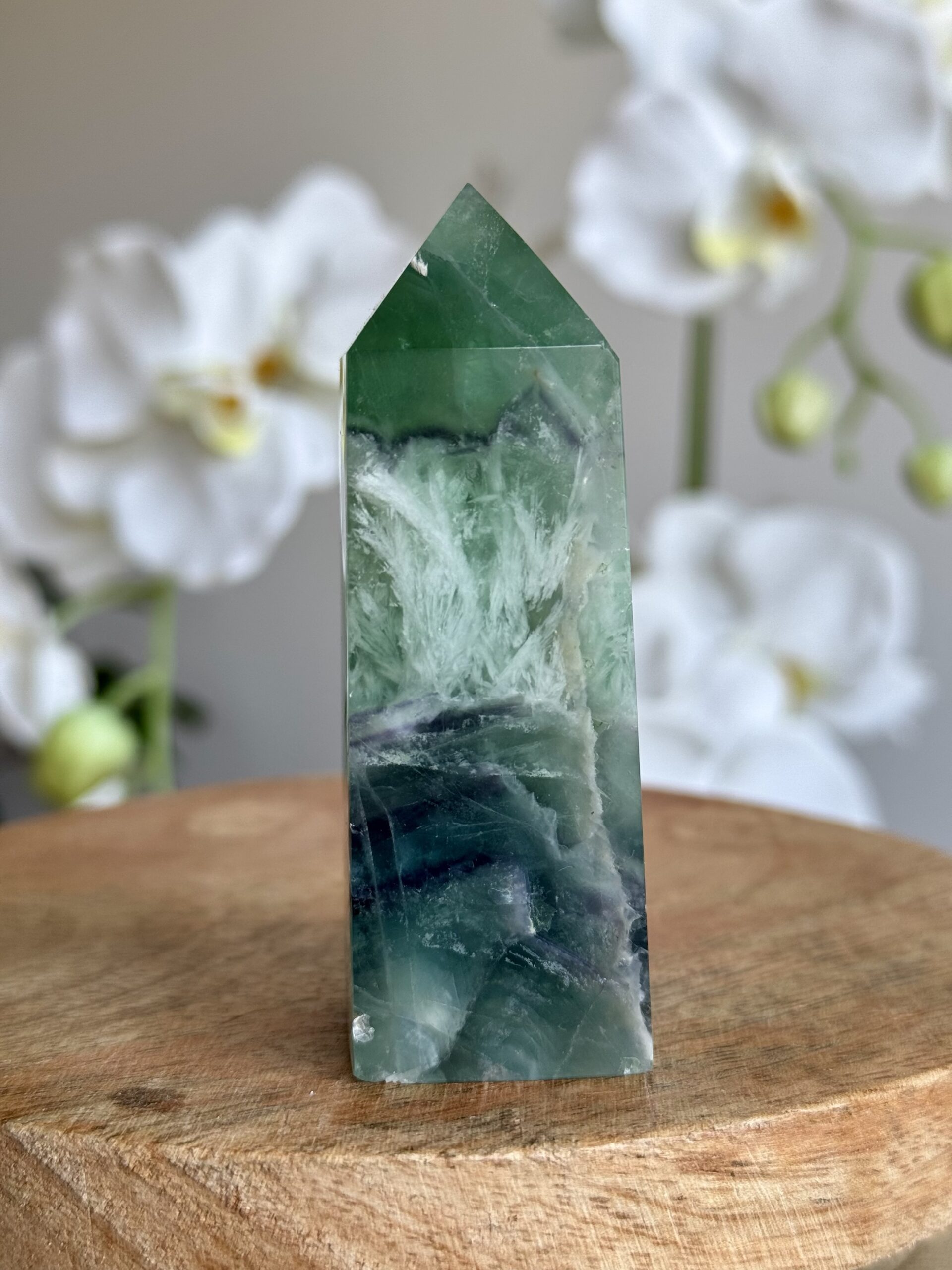 Dit verfijnde torentje van fluoriet valt op door zijn unieke, veerachtige patronen en gelaagde kleuren. Het gladde oppervlak en de zachte kleurovergangen maken het tot een stijlvol decoratief object en een echte blikvanger in elk interieur of verzameling.